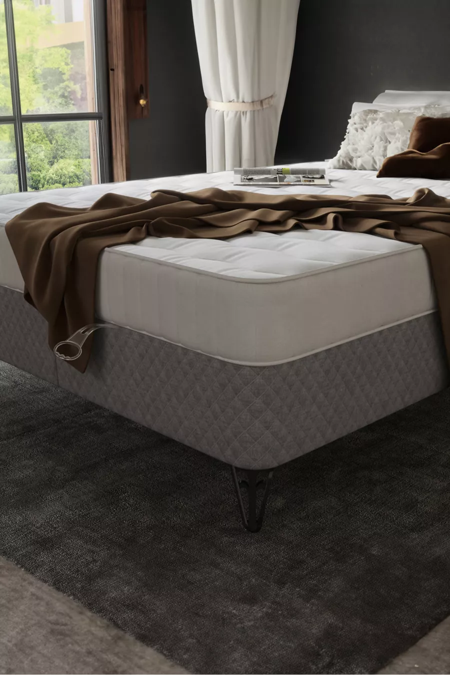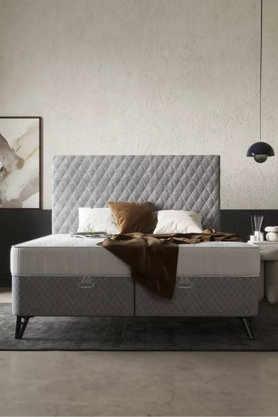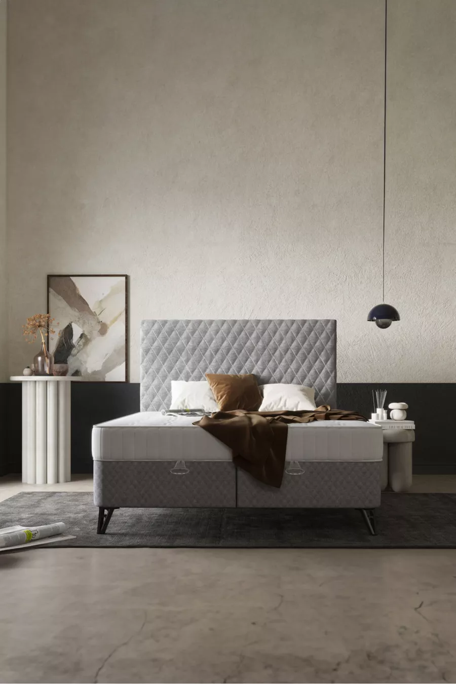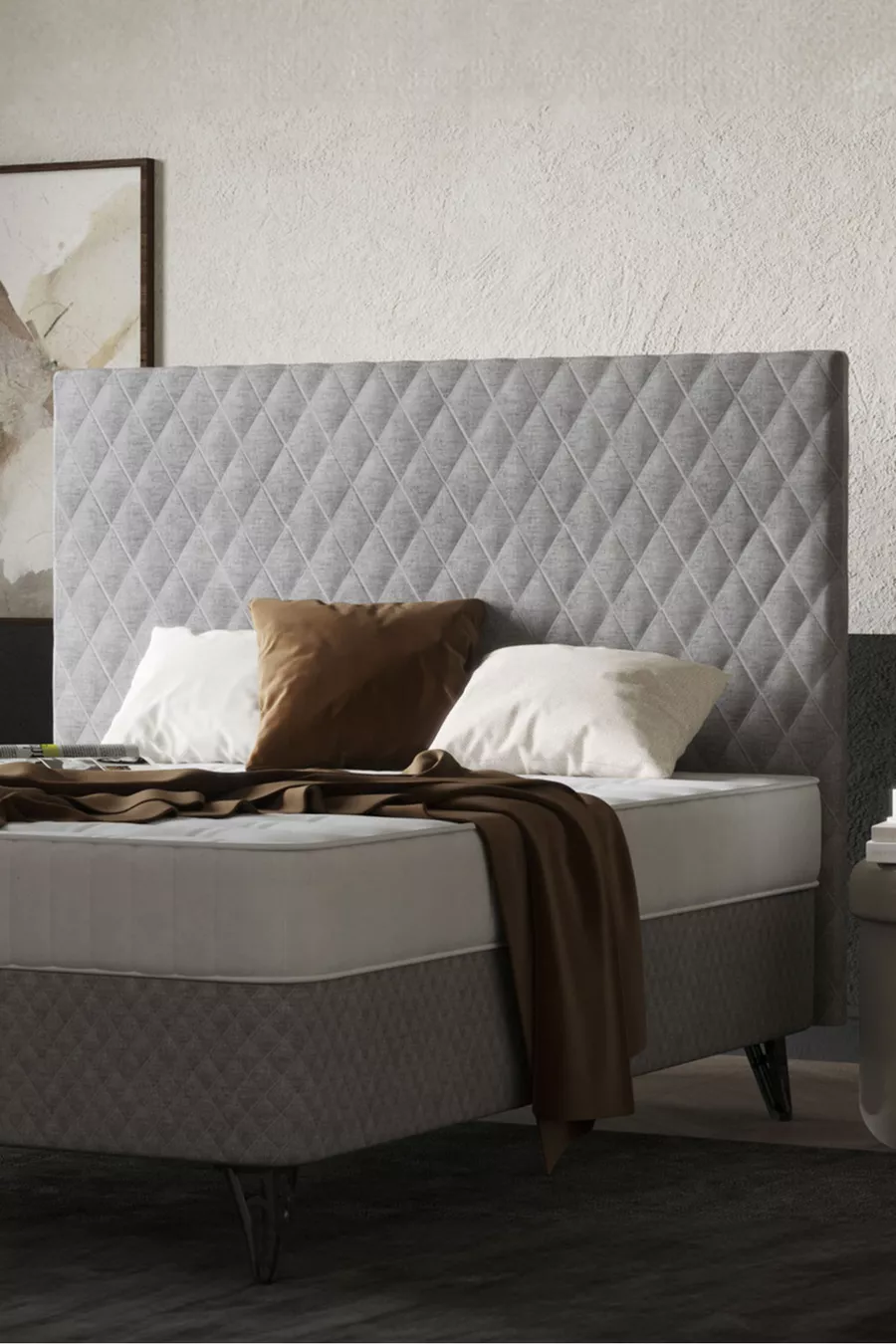 Dimensions: Double Matériau: Aggloméré Durée de la garantie: 2 ans Type de set: Base + Tête de lit + Matelas Couleur: Gris Style: Campagne Thème / Style: Moderne Origine: TR Caractéristique: Avec pieds