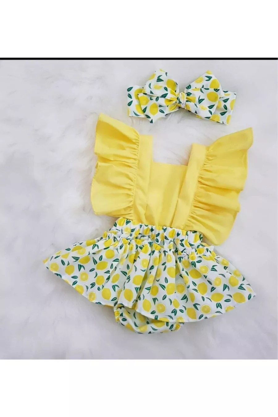 Ensemble salopette à volants citron pour bébé fille & bandana