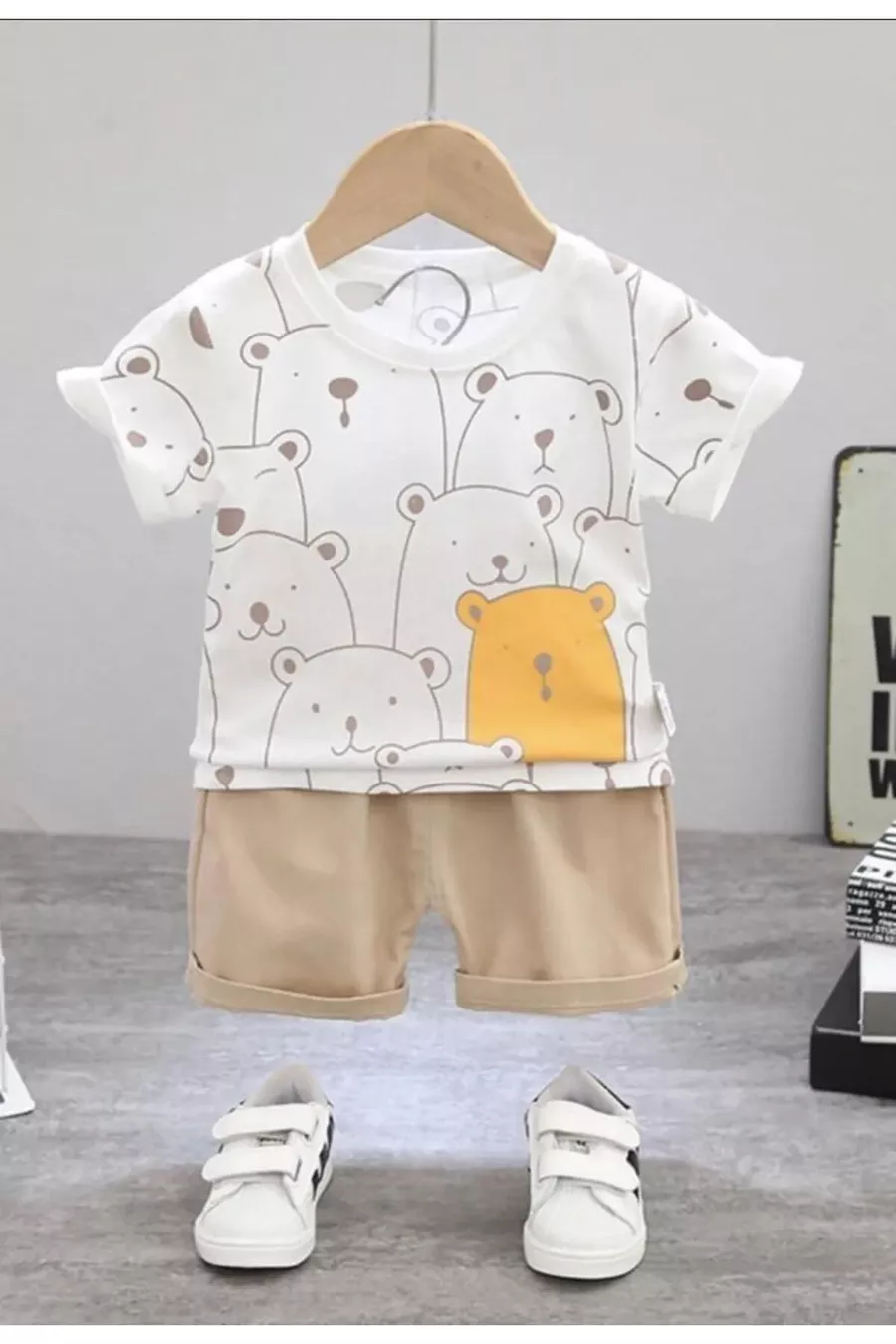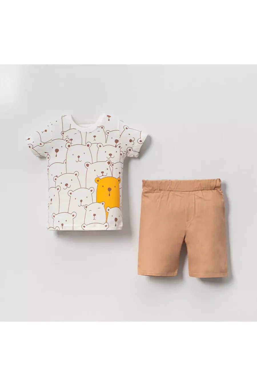 Ensemble short d'été pour bébé et enfant en coton avec motif ours, couleur brique