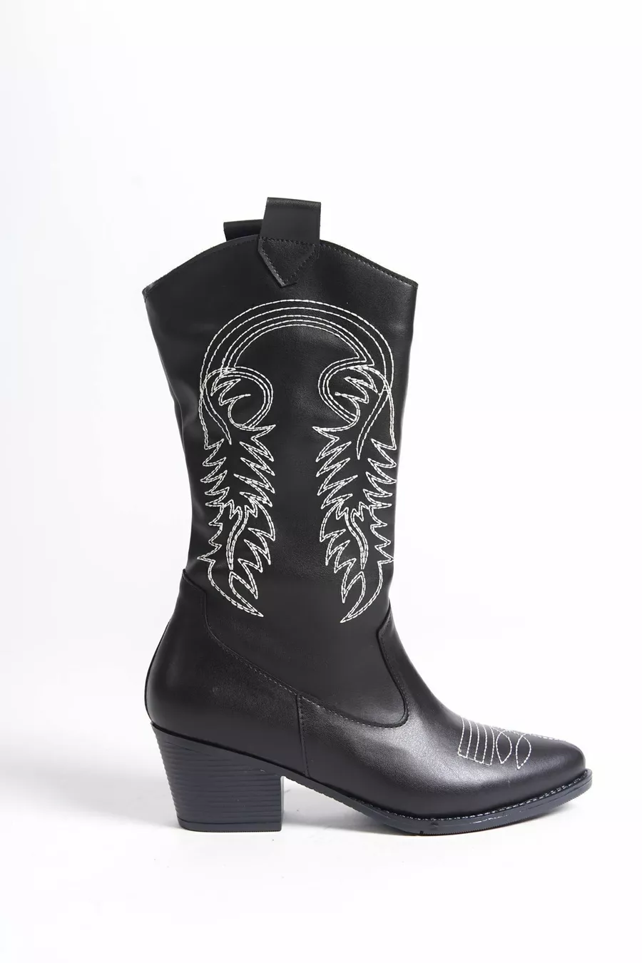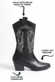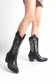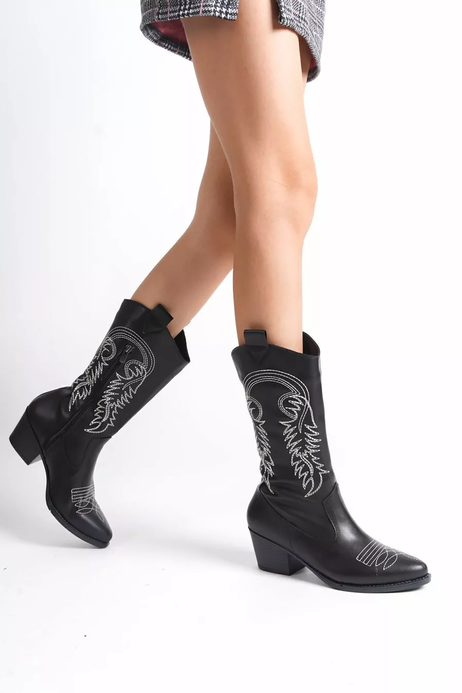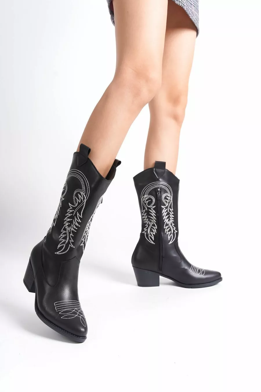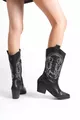 fait à la main noir à bout pointu talons blanc brodé motif détail peau femmes bottes de cow-boy zippées