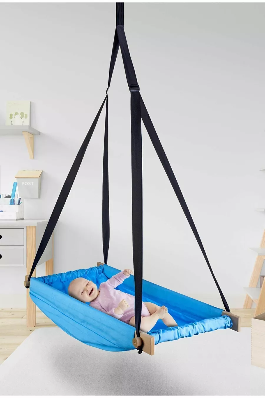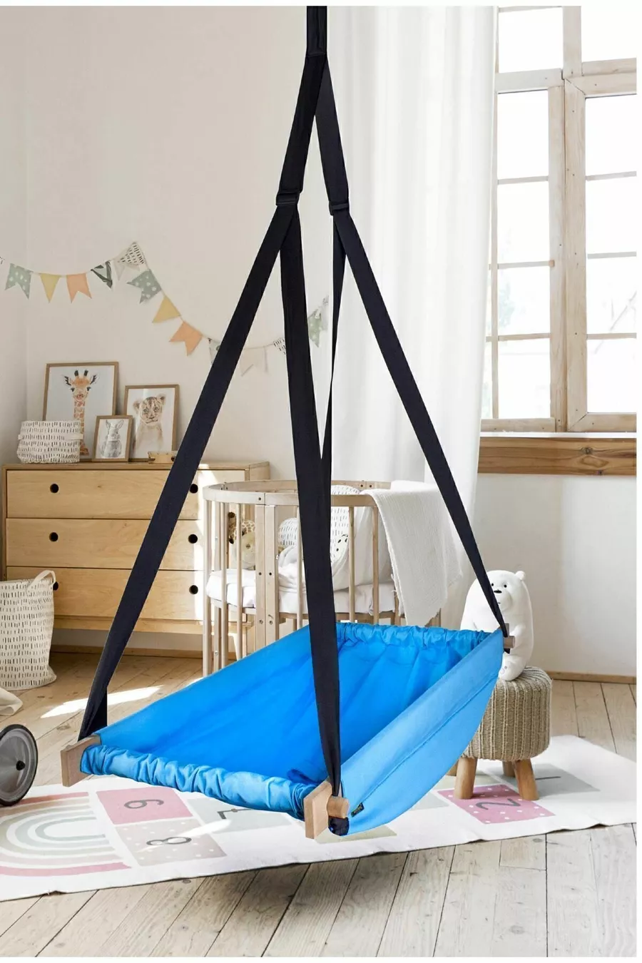 Hamac à ressort en bois bleu Flow Hoppala lit de bébé suspendu au plafond balançoire