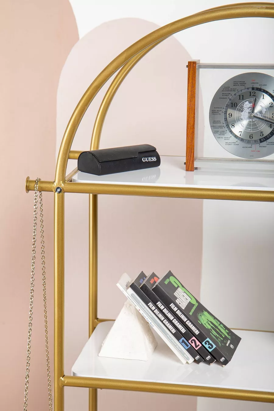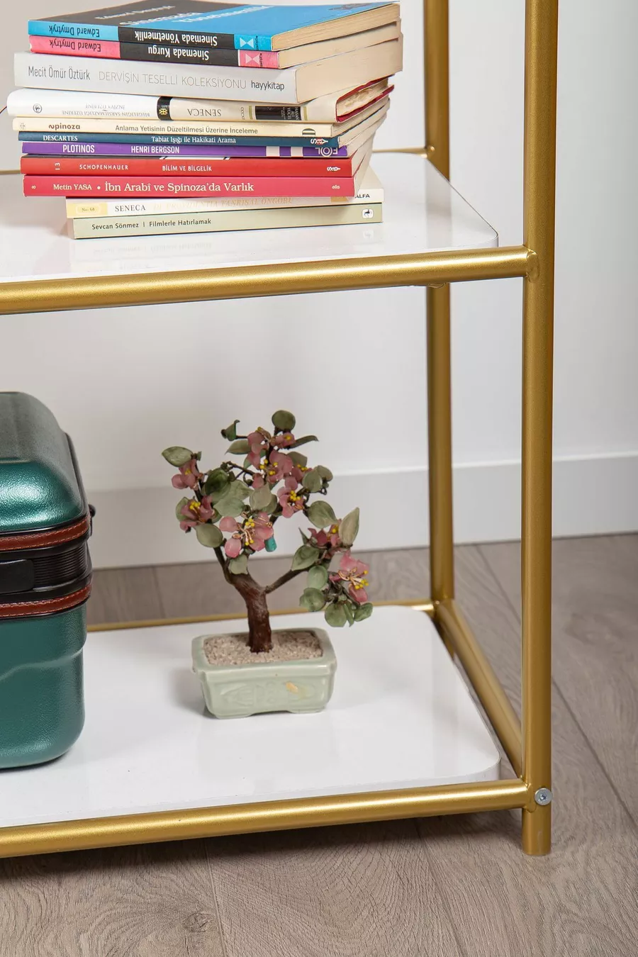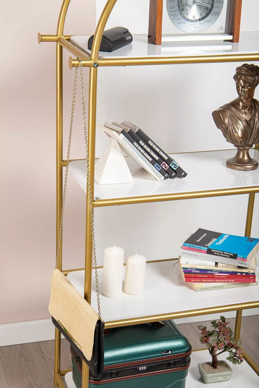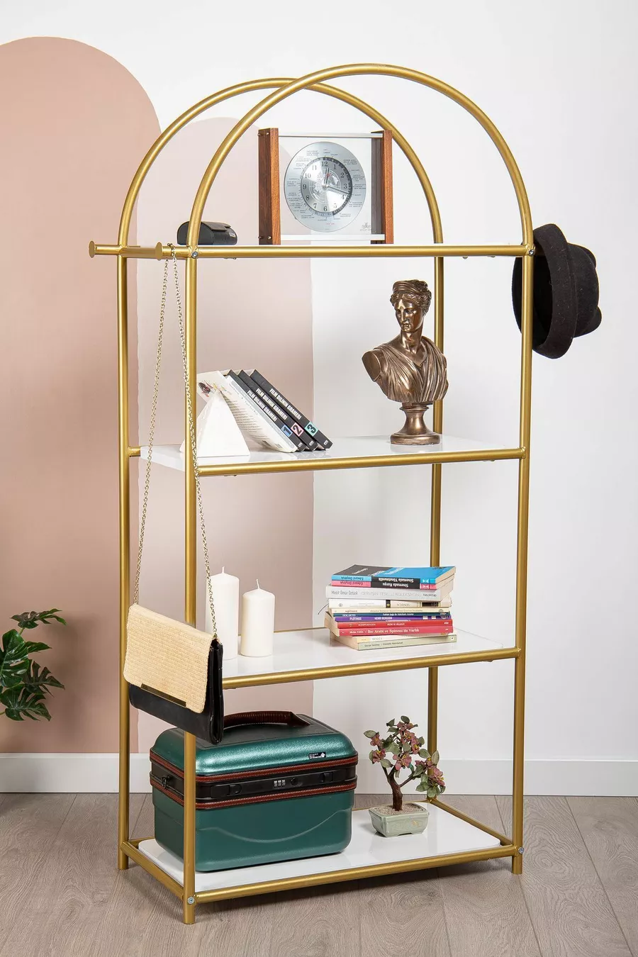 Type : Classique Matériau : Métal Couleur : Doré Hauteur : 145 cm Largeur : 60 cm Profondeur : 35 cm Nombre d'étagères : 4 Matériau du corps : Bois Style : Rétro Thème / Style : Classique Origine : TR Caractéristique : Avec étagères