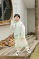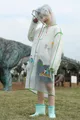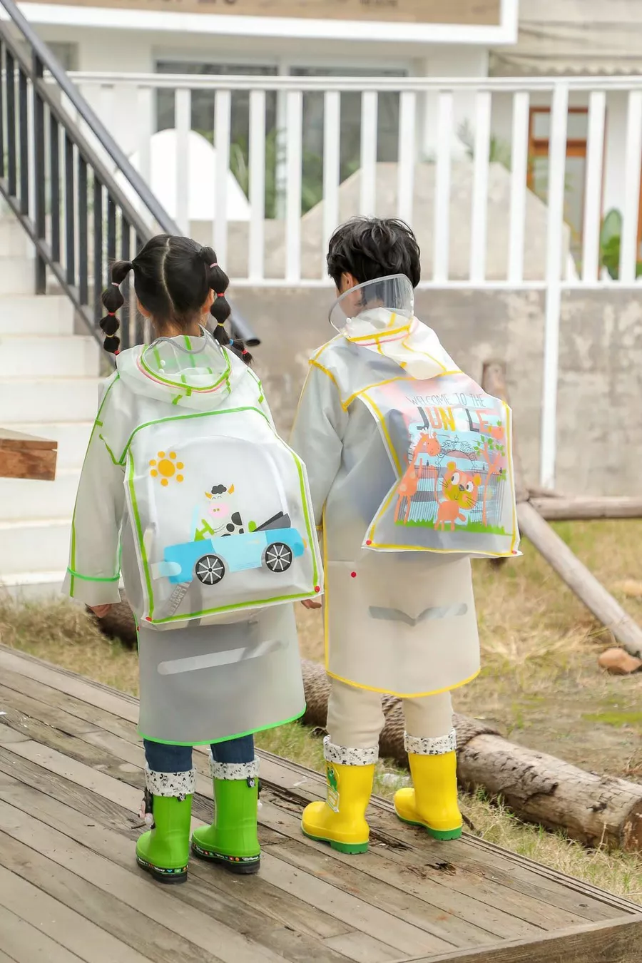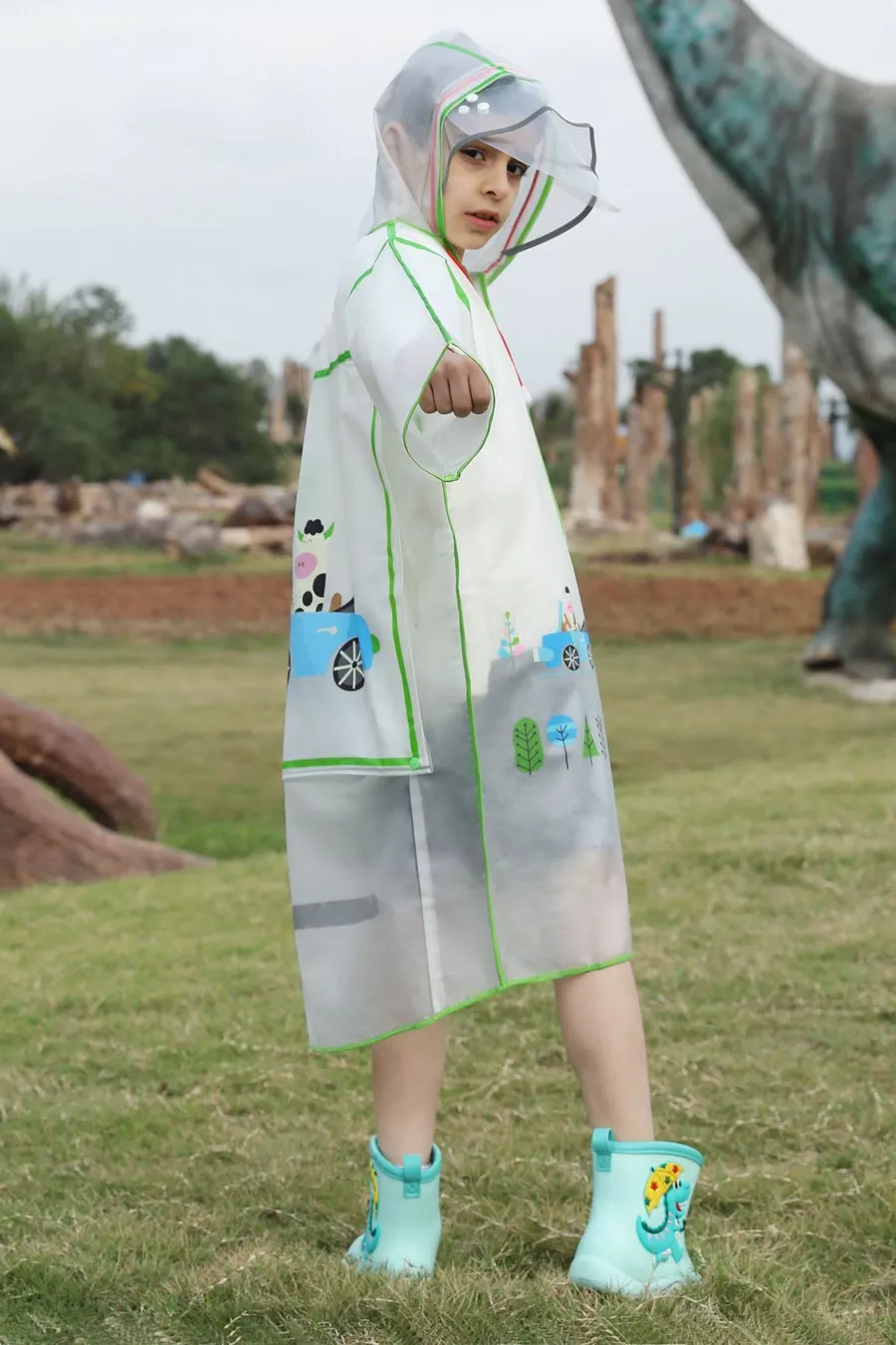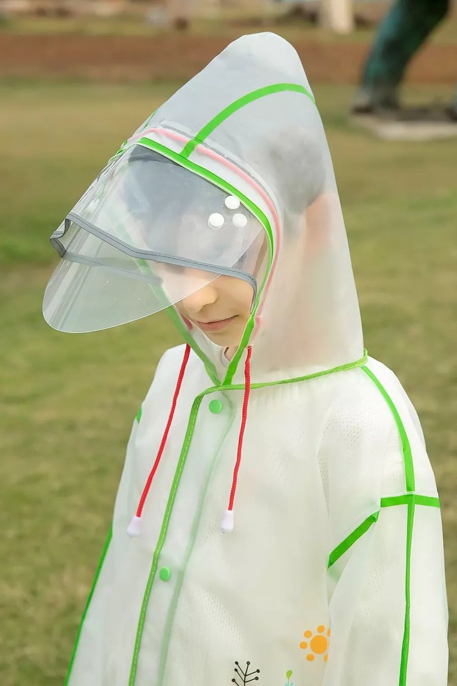 Imperméable pour enfant à capuche en tissu EVA vert, sans poches, à motifs, avec boutons-pression, avec protection pour sac