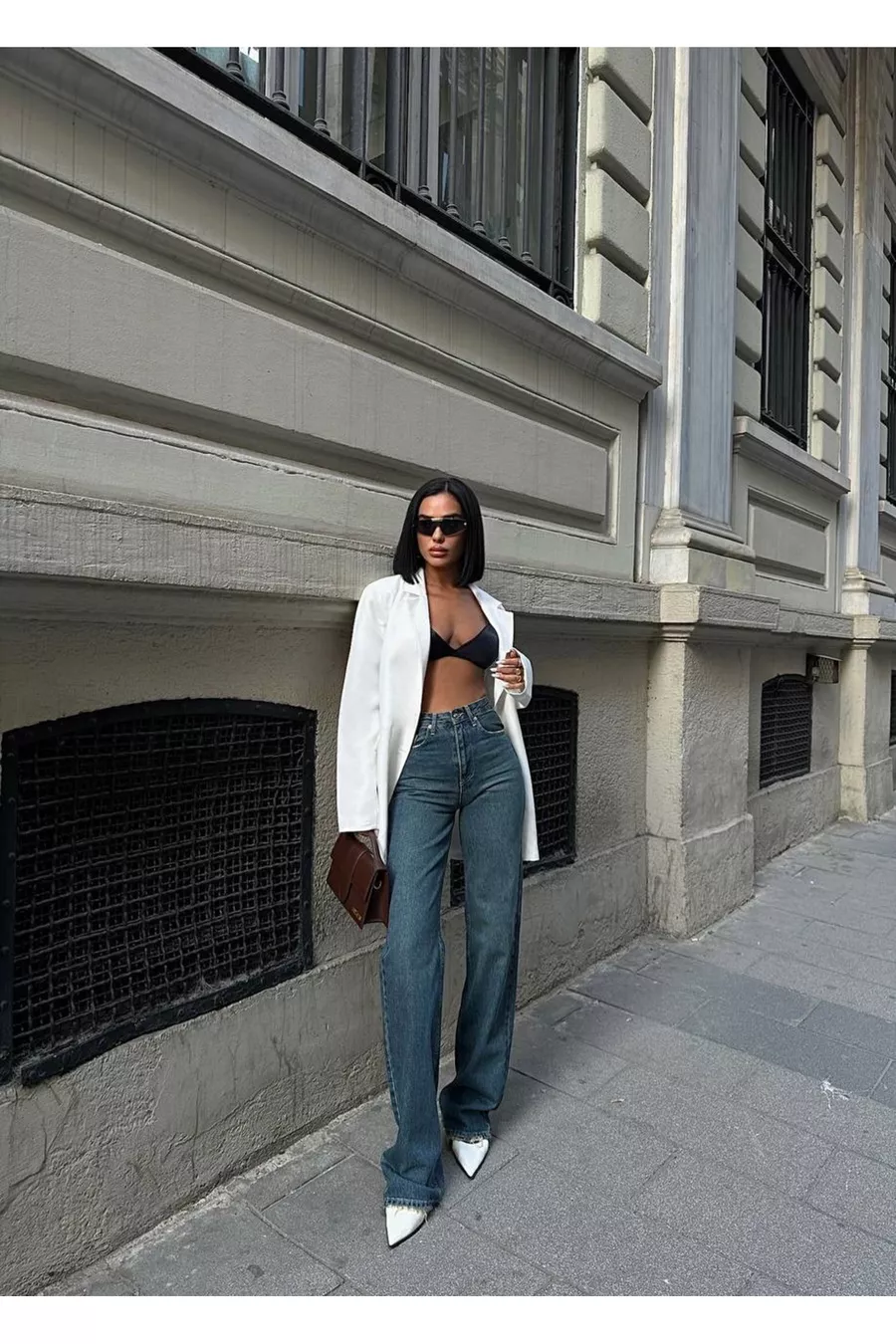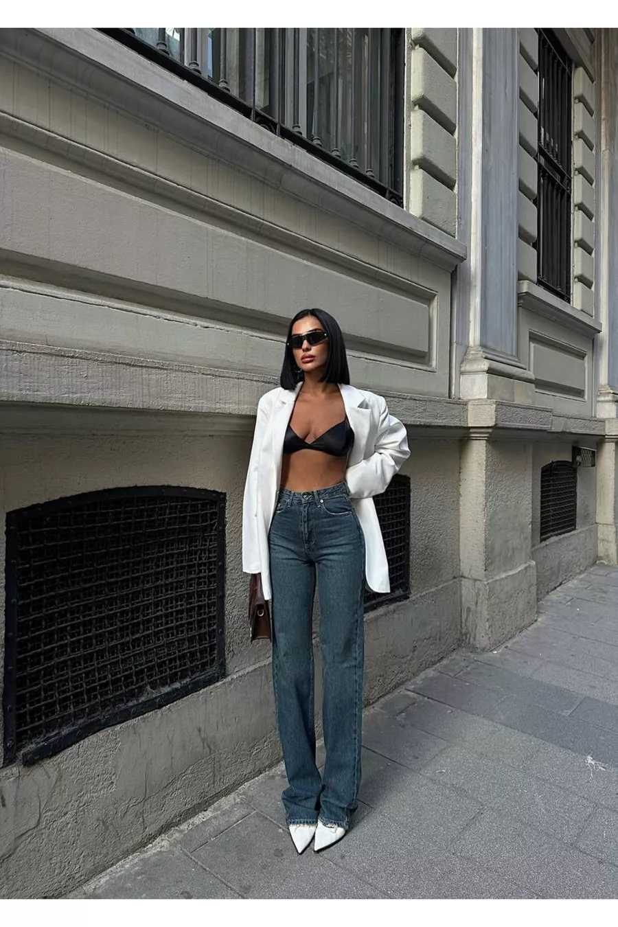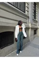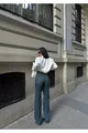 Assis à la taille, s'élargissant vers la cheville. Laver délicatement à une température maximale de 30 °C. Ne pas utiliser d'agent de blanchiment. Ne pas sécher en tambour. Repasser à basse température. Ne pas nettoyer à sec.