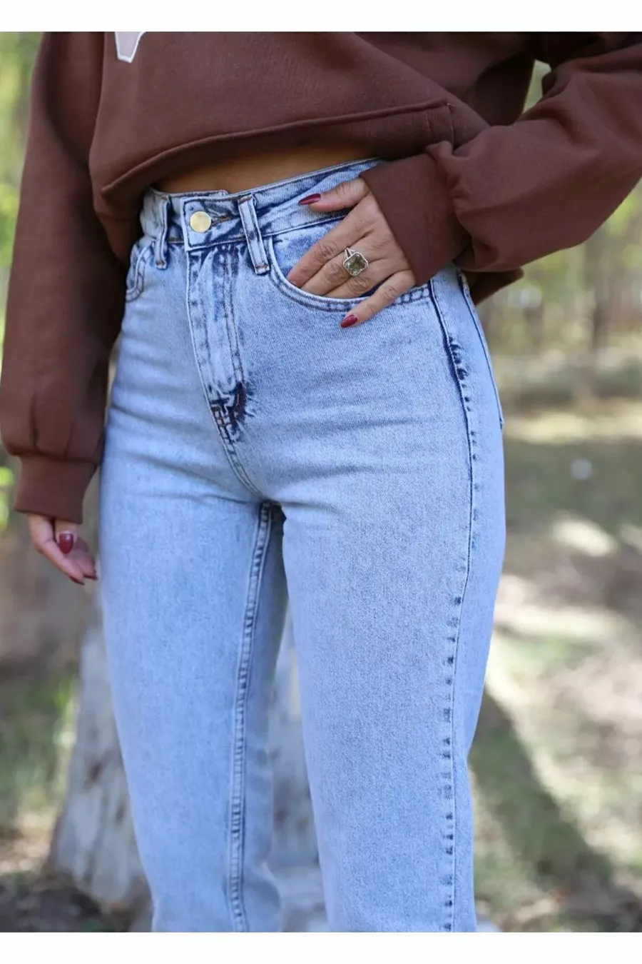 Jean Mom Taille Haute Effet Lave Neige Bleu Glace des Années