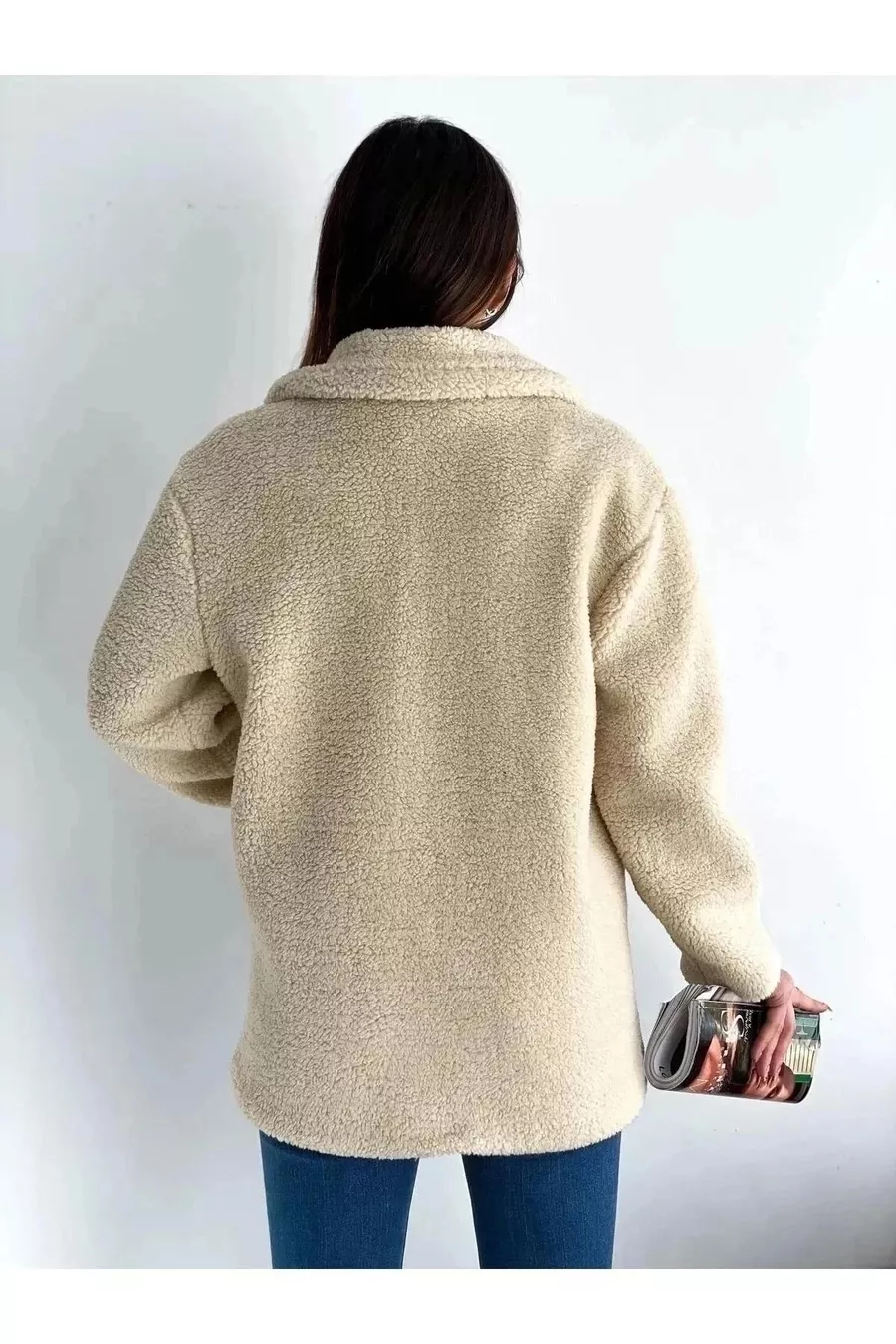 Manteau en peluche beige pour femme avec boutons Wellsoft