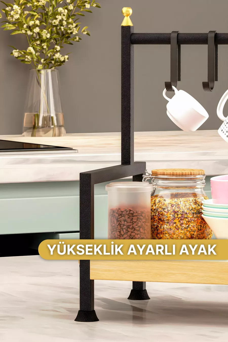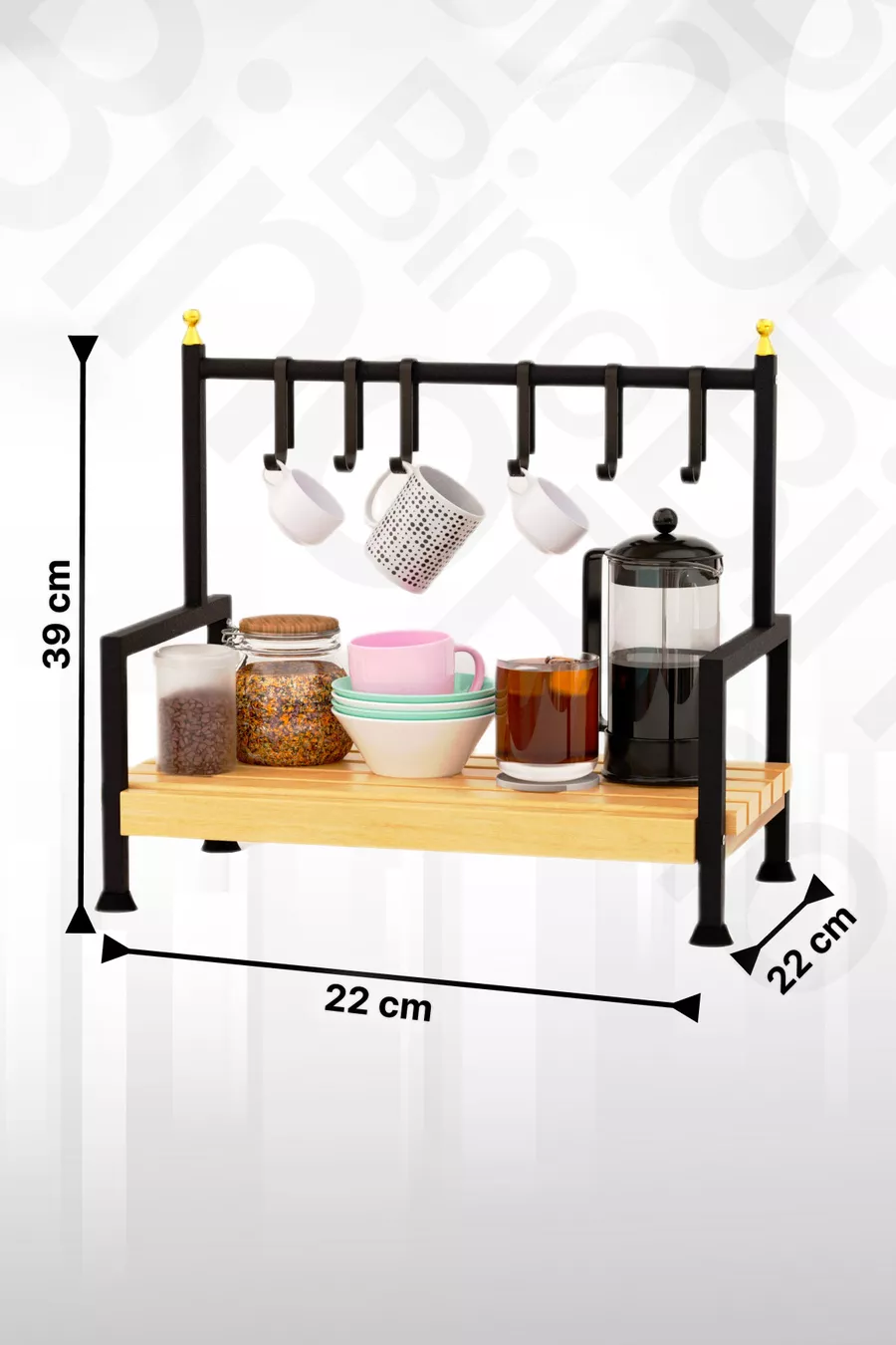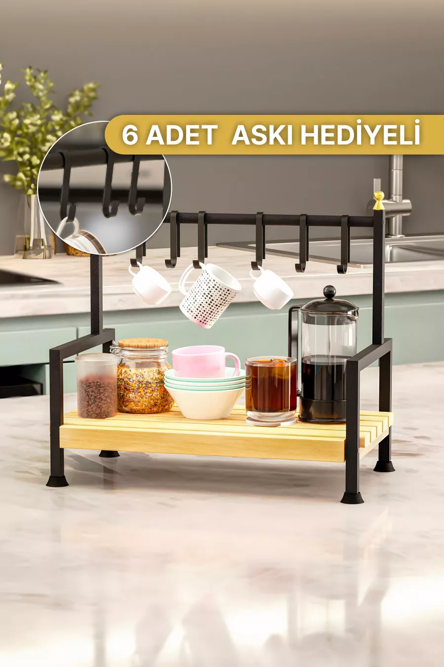 Organisateur de tablette de cuisine de bureau pour tasses à café avec 6 crochets en bois