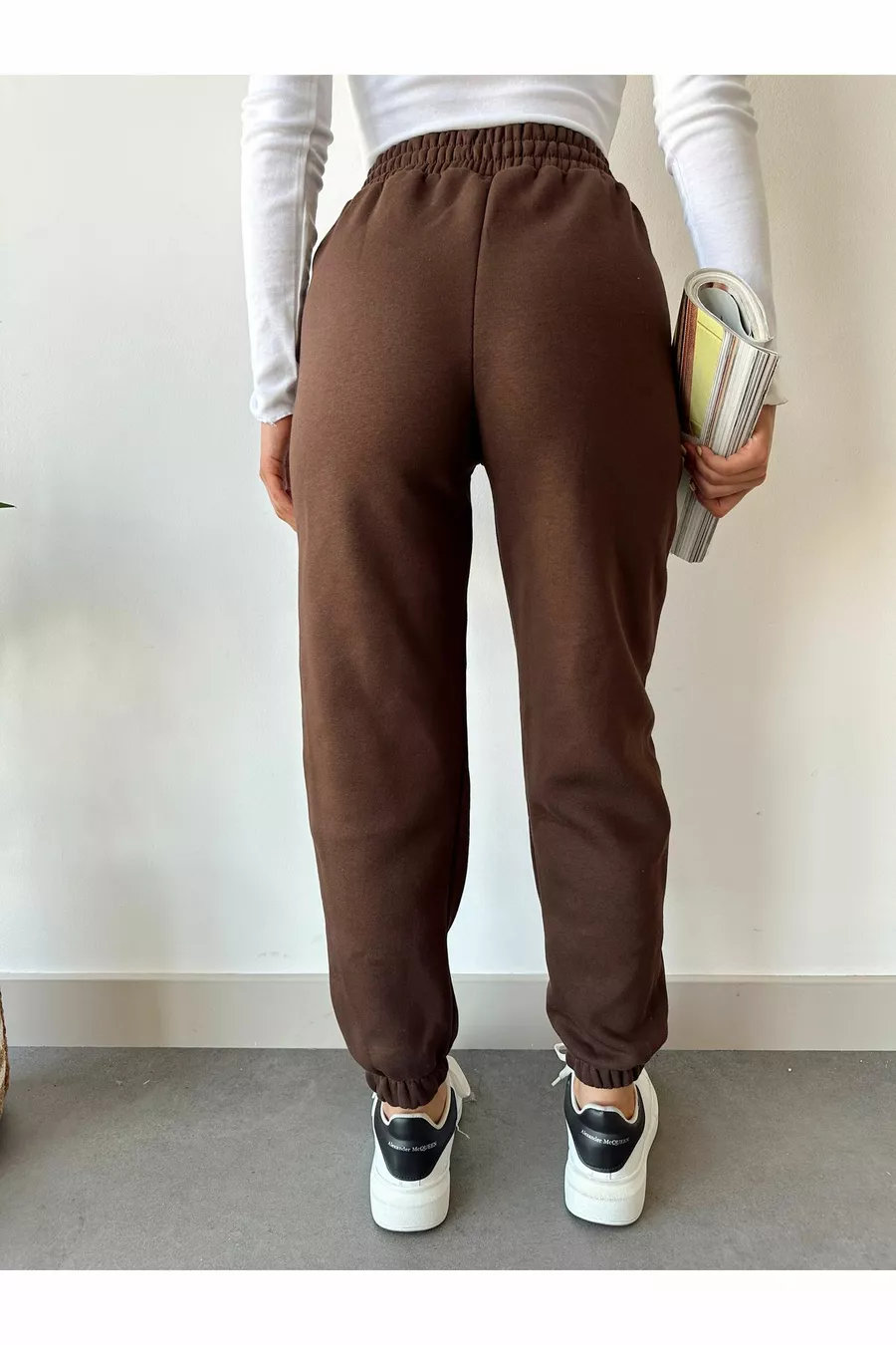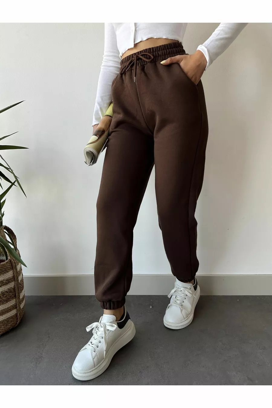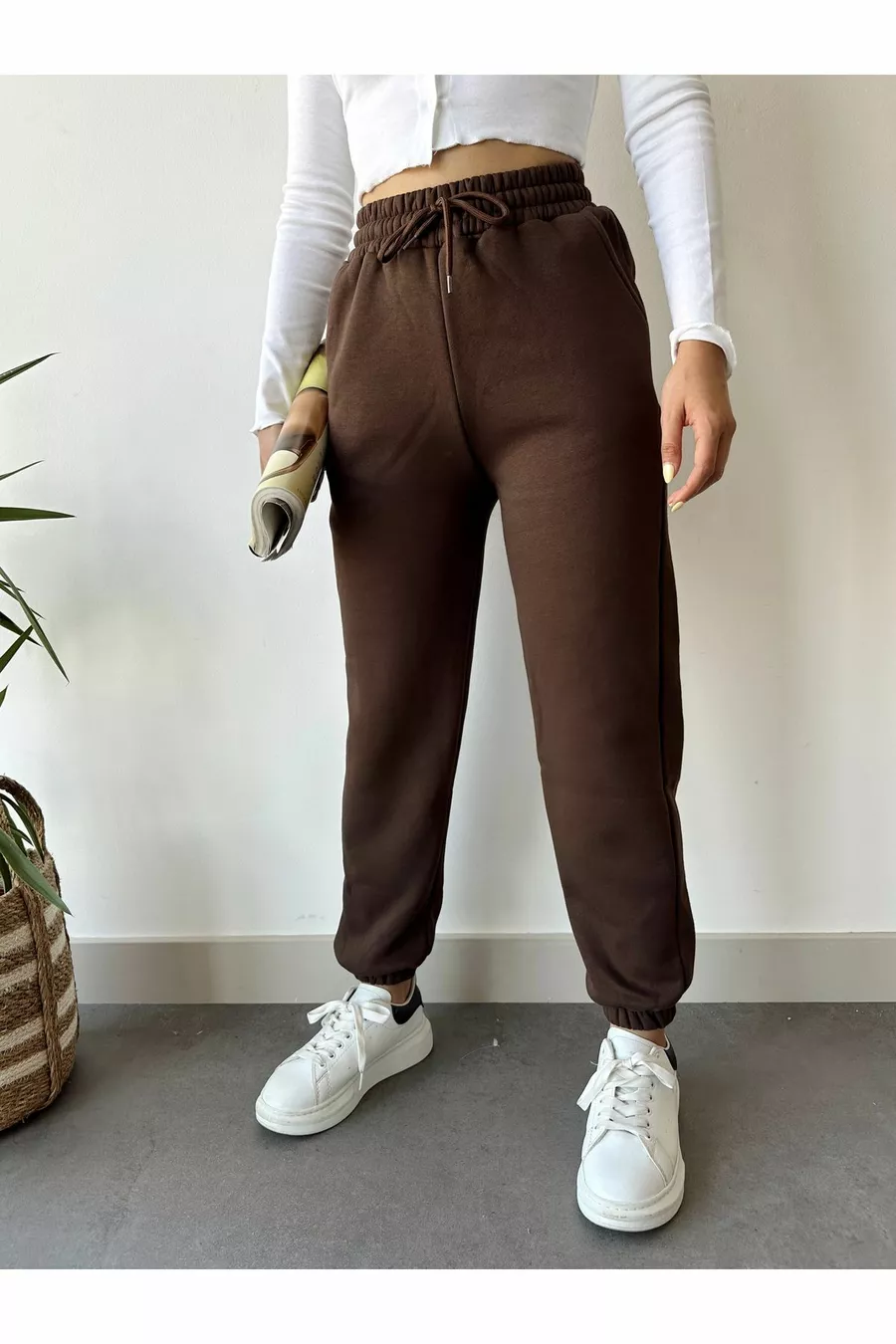 Pantalon de jogging basique femme marron d'hiver, épais, doublé polaire à taille haute et bas de jambe élastique