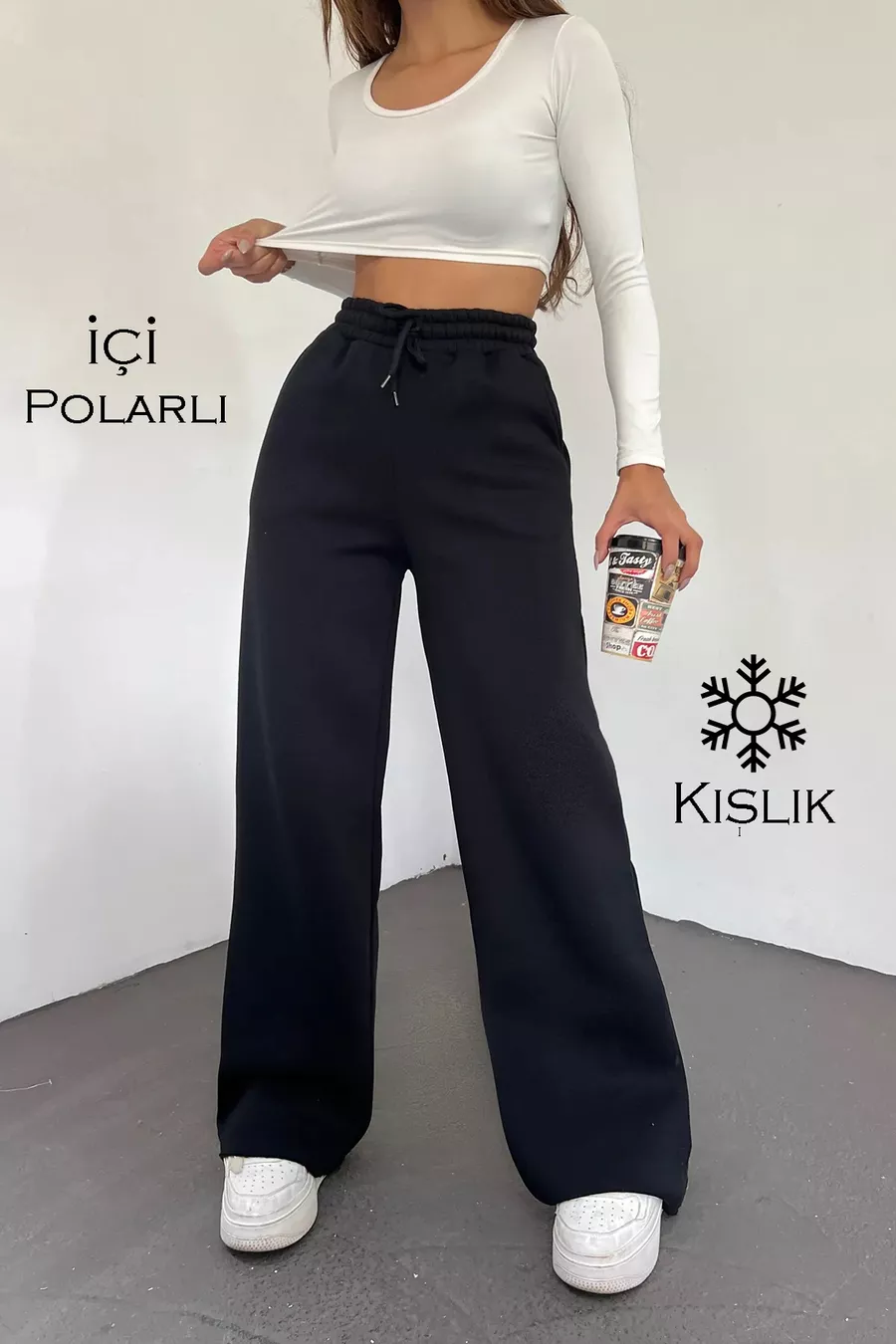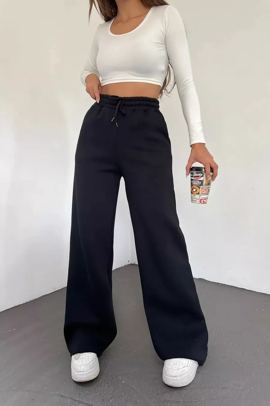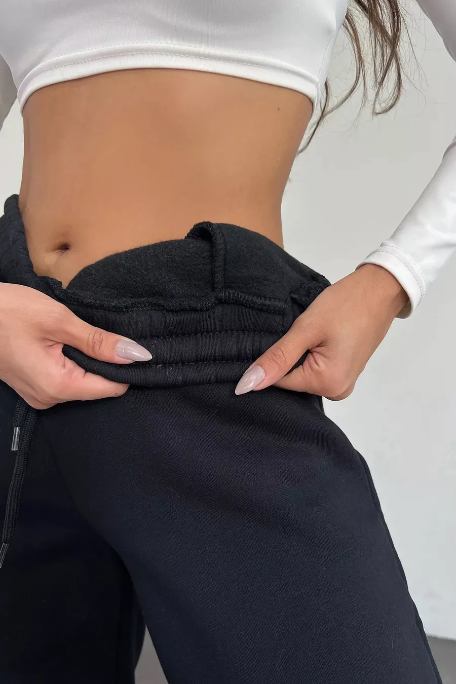 Pantalon de survêtement femme noir d'hiver, doublé polaire, taille haute, jambes larges