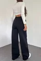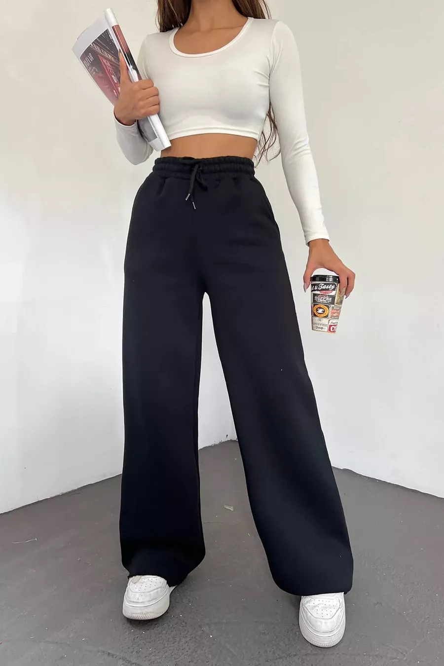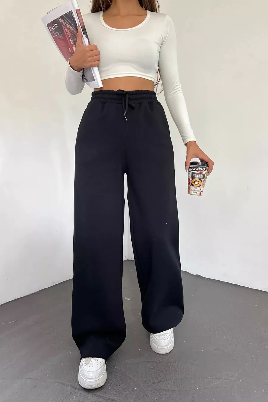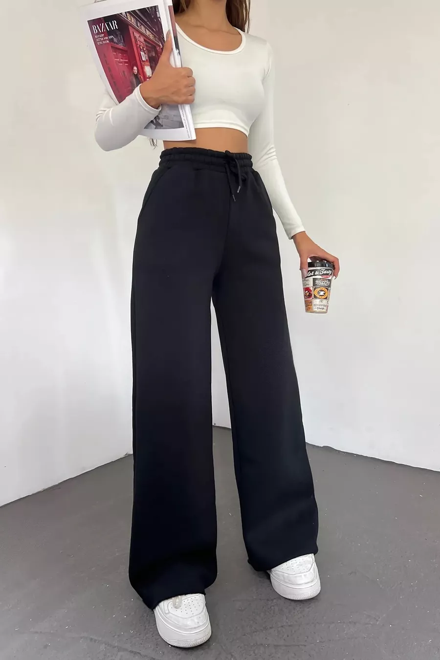 Pantalon de survêtement femme noir d'hiver, doublé polaire, taille haute, jambes larges
