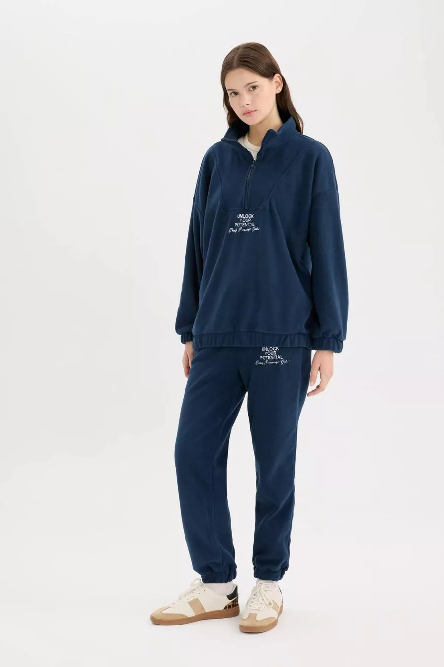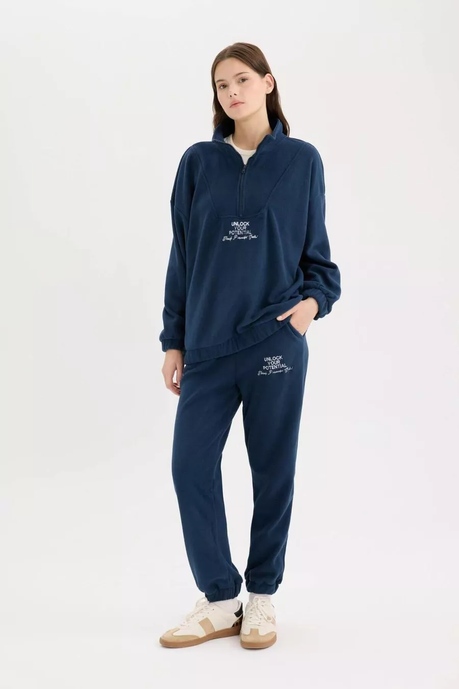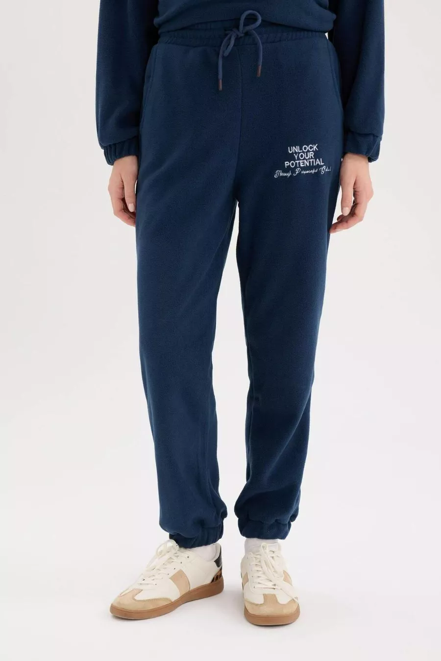 Pantalon de survêtement standard fit long, taille élastique, bas réglable avec cordon élastique, poches imprimées
