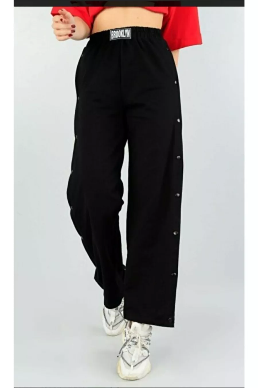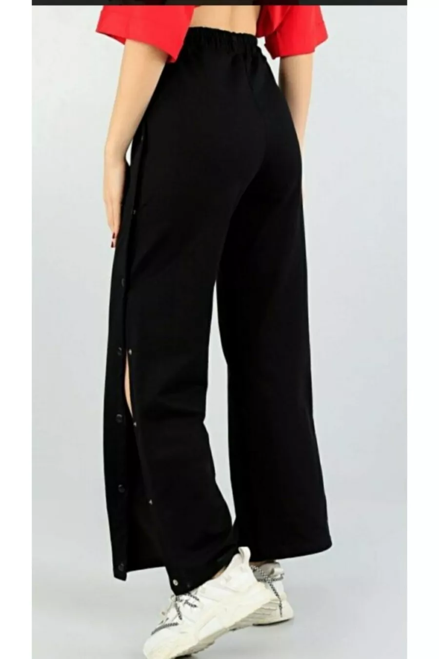 Pantalon de survêtement noir femme avec boutons-pression sur le côté