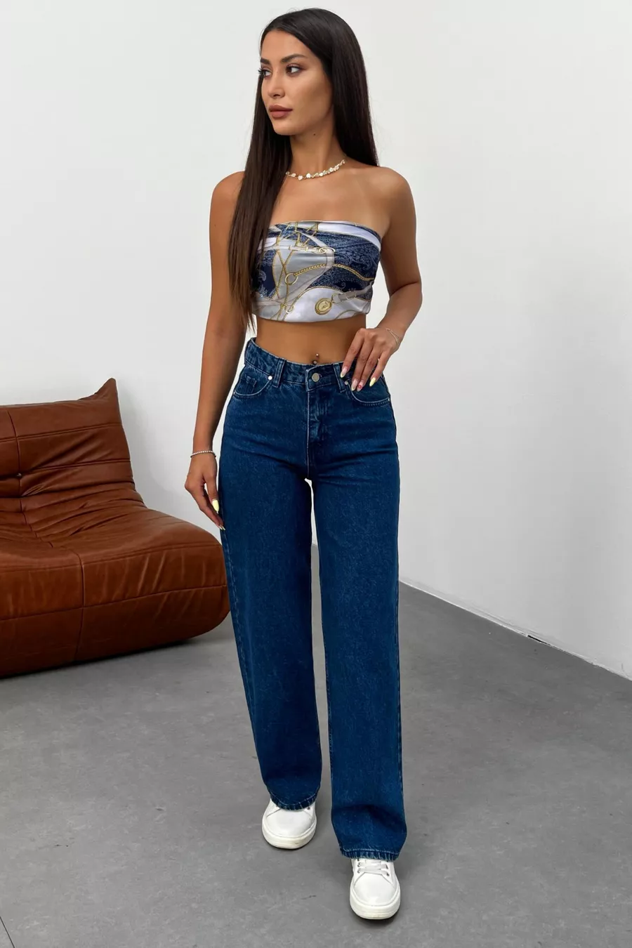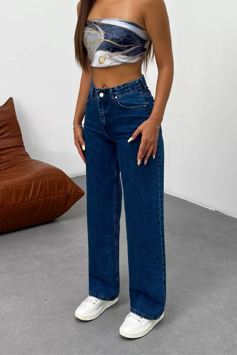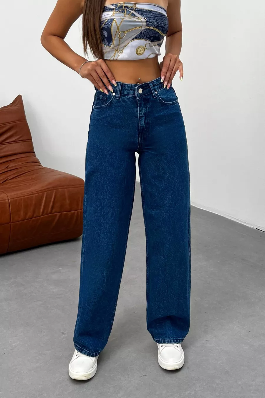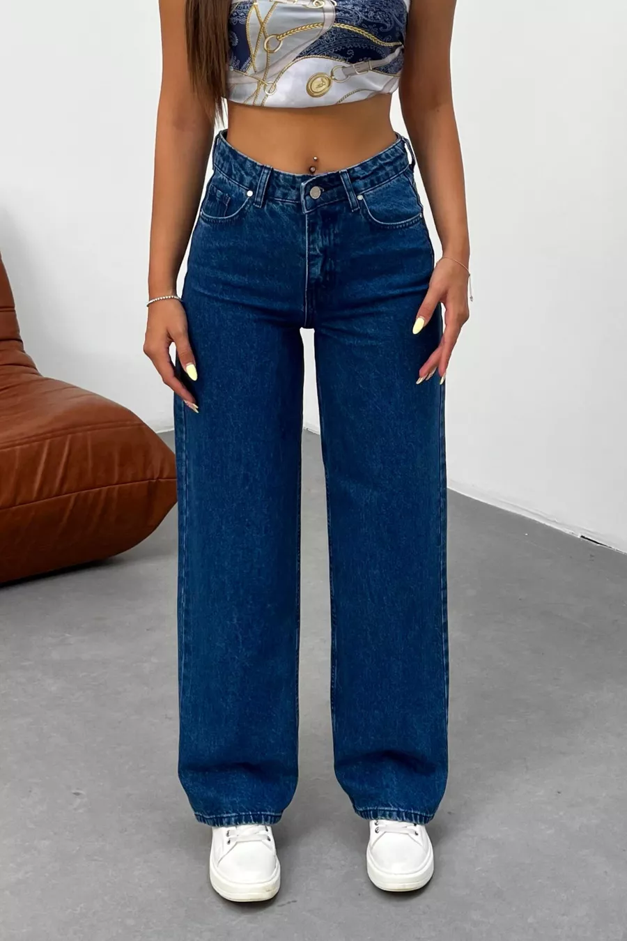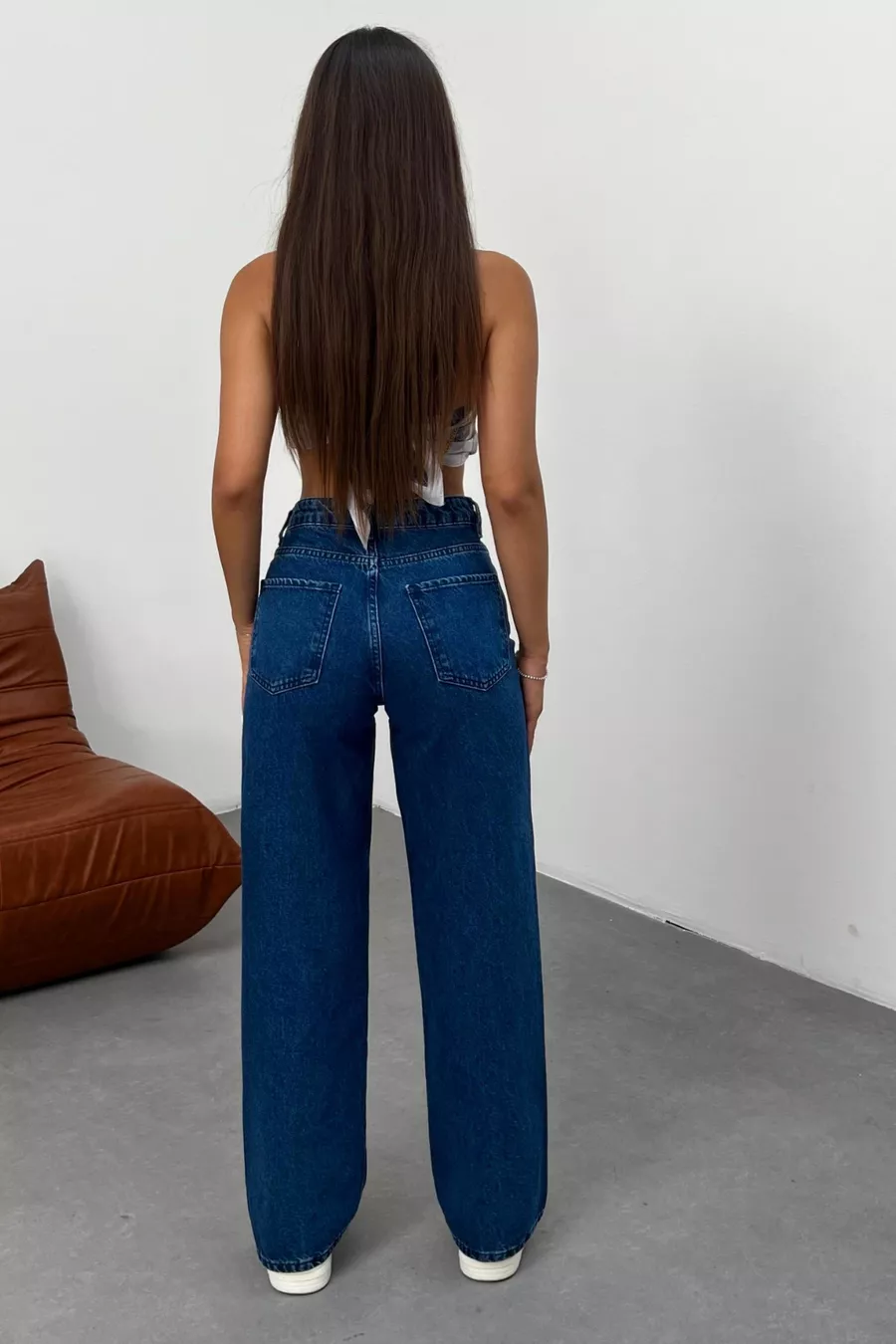 Pantalon en jean femme taille haute à jambes larges bleu marine