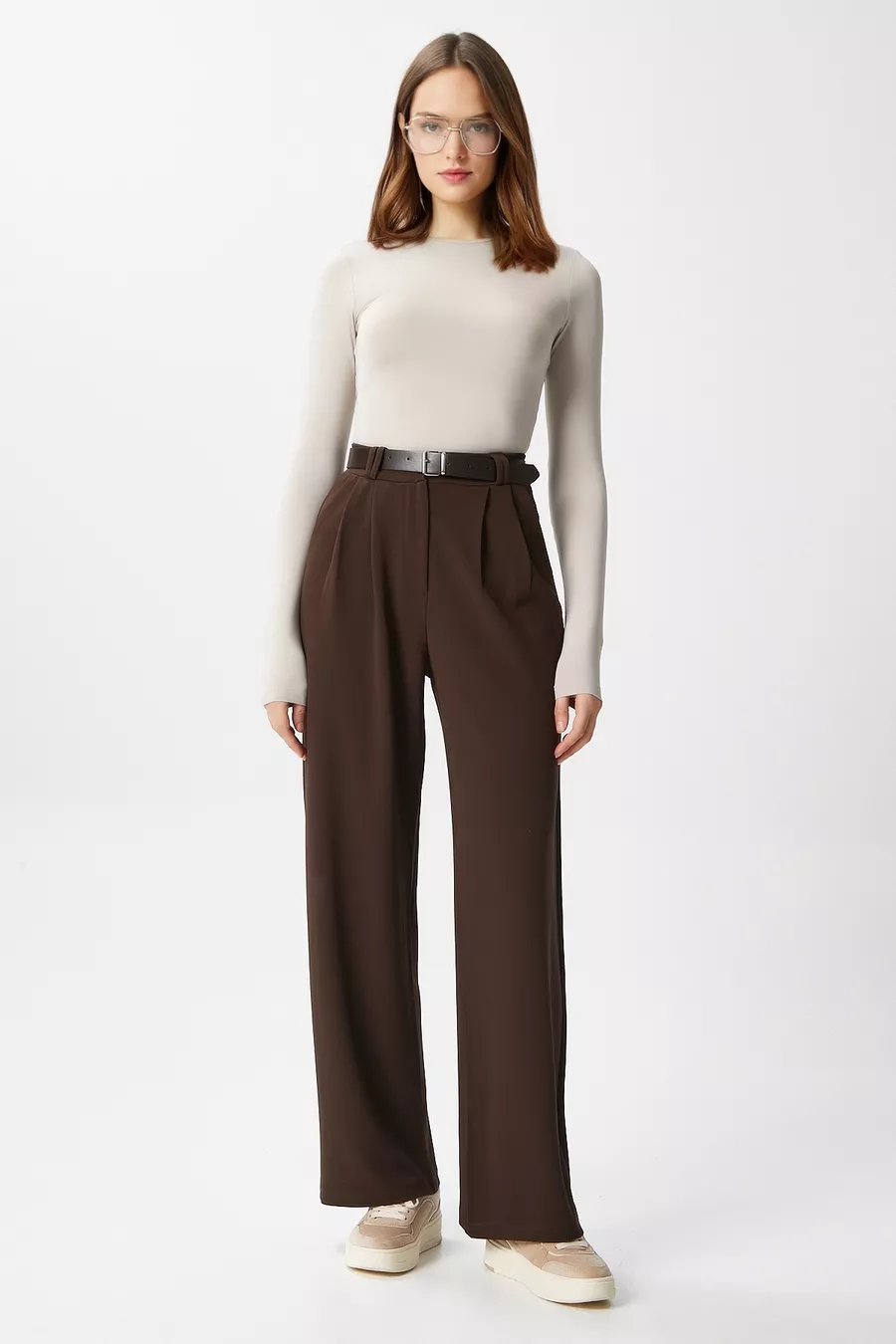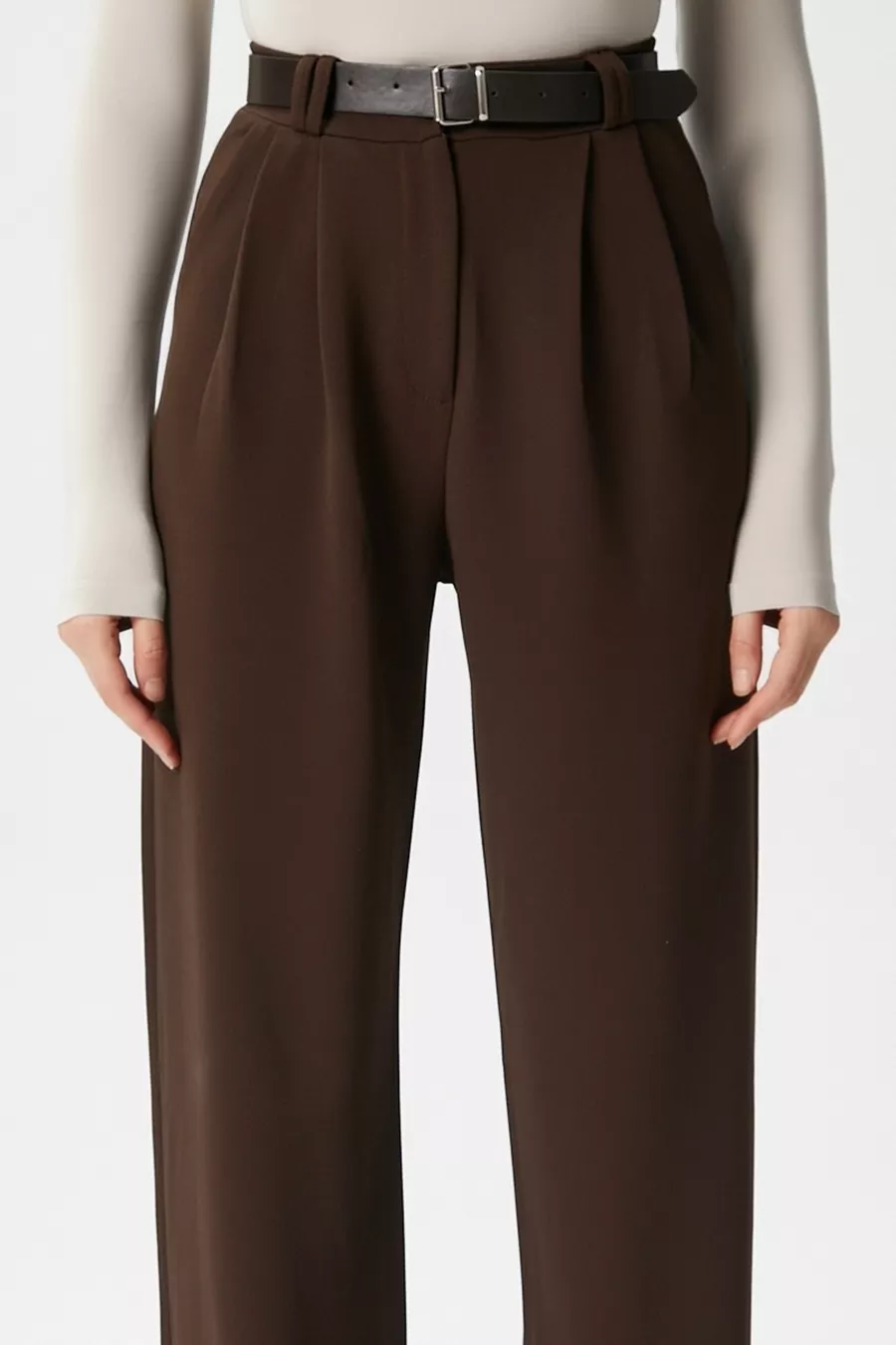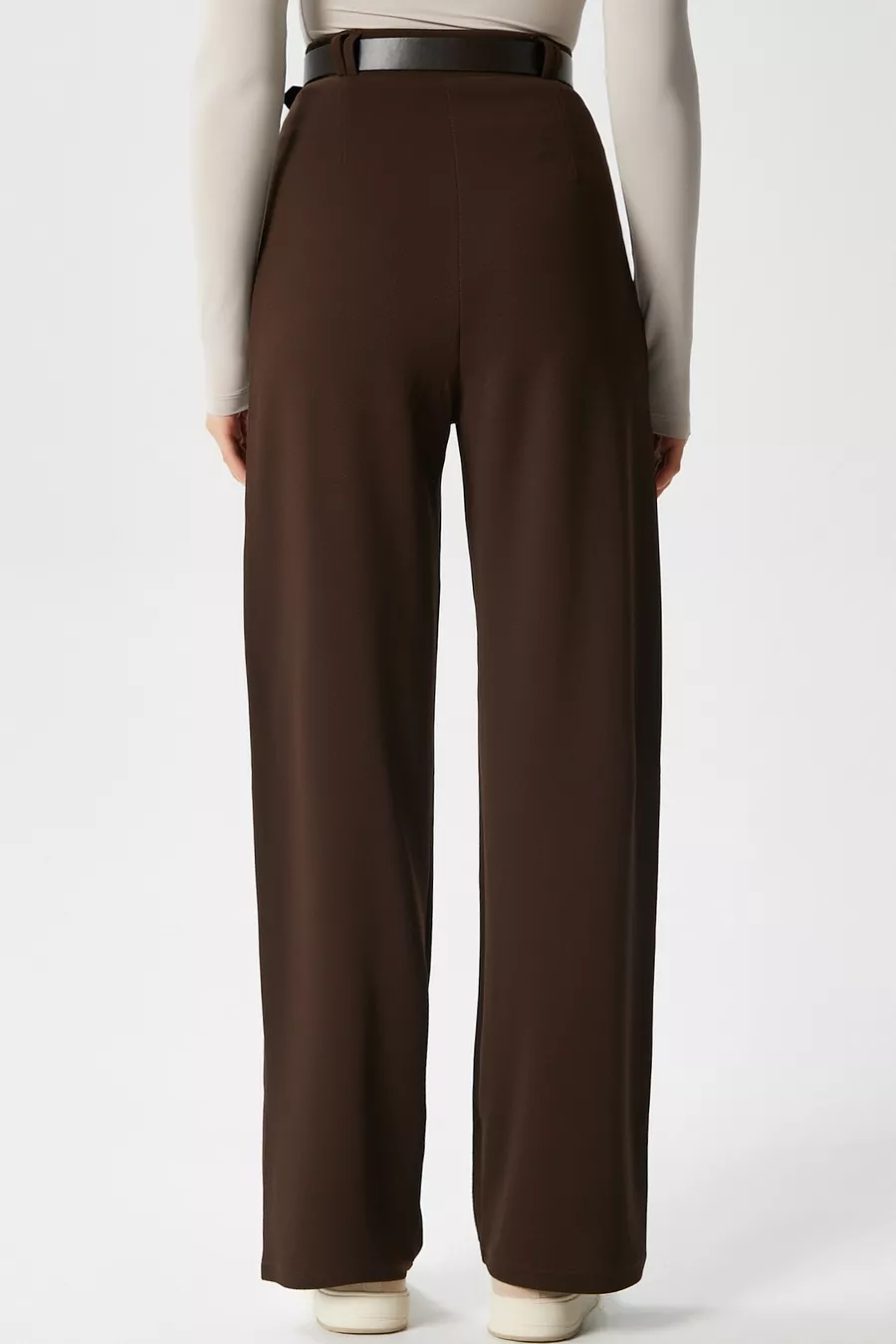 Pantalon Palazzo marron stretch pour femme Rena à ceinture