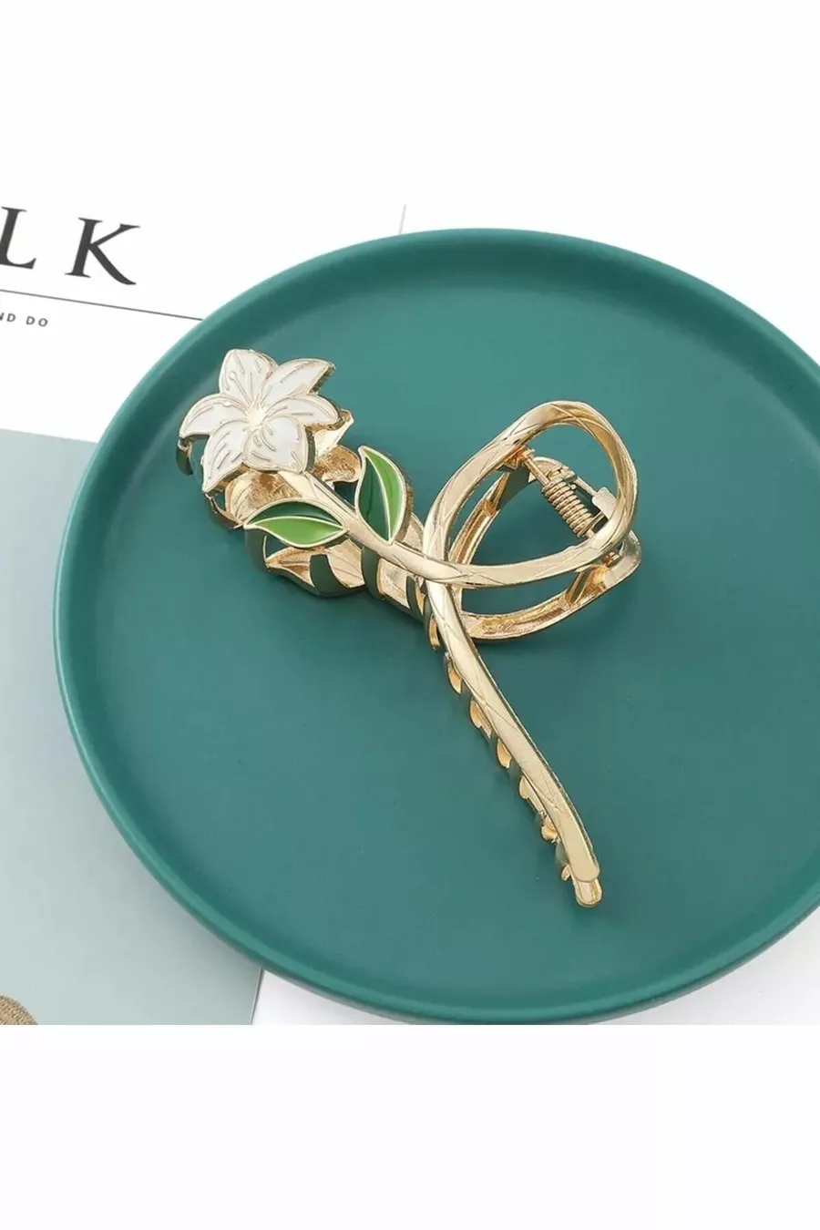 Pince à ressort en métal doré avec fleurs de lys blanches
