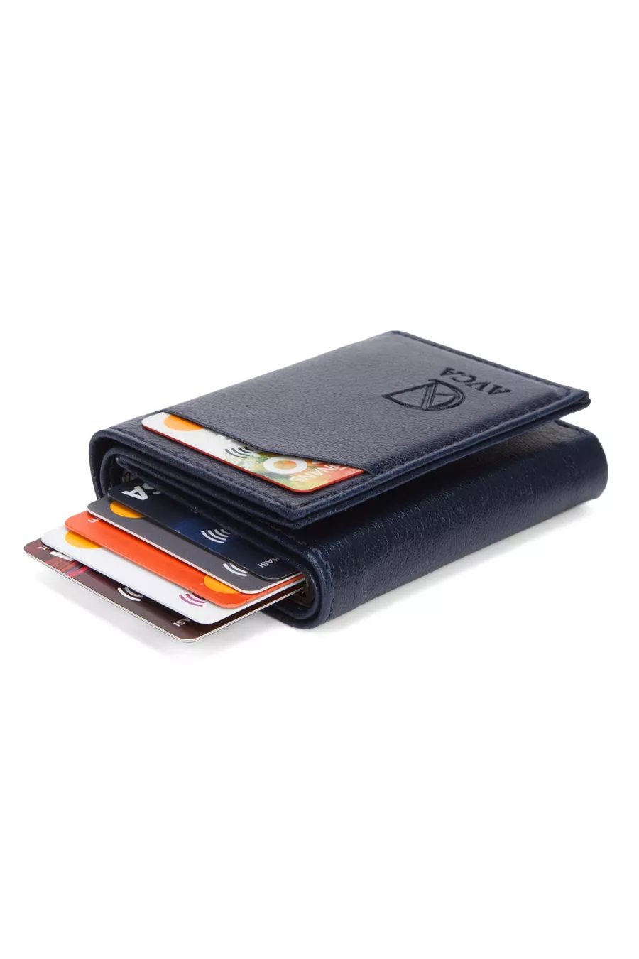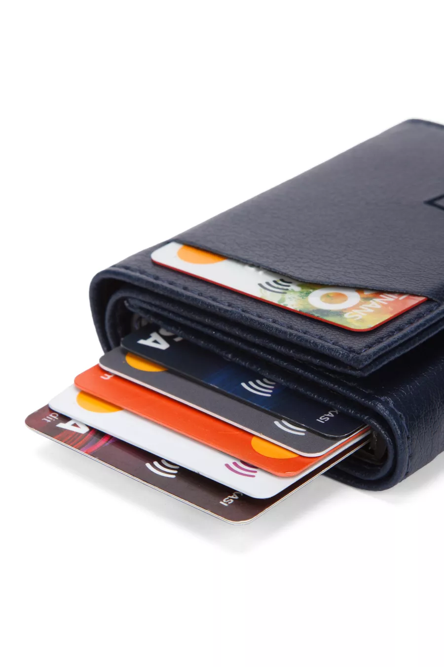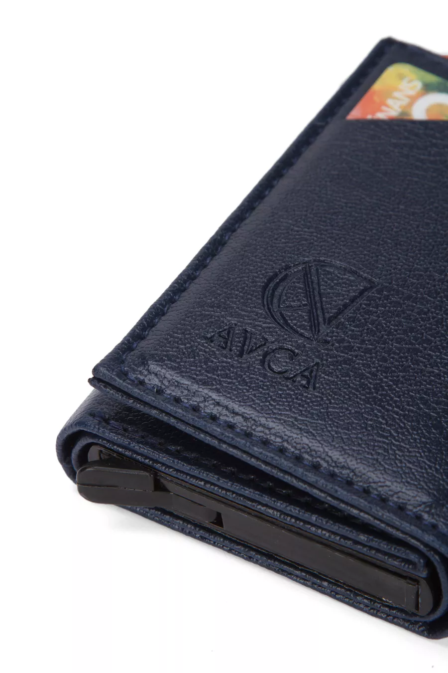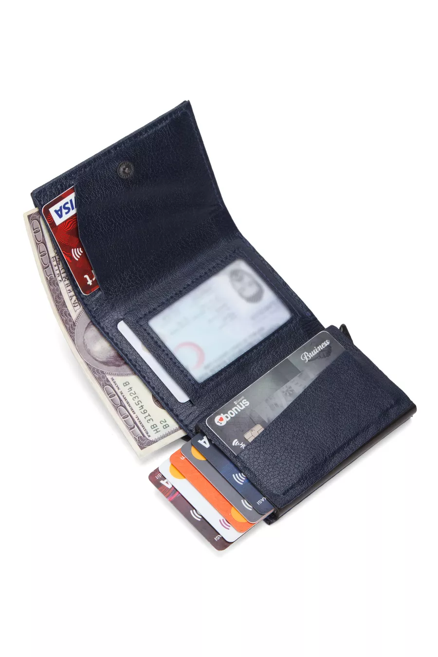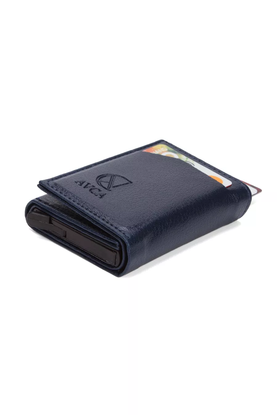 Portefeuille pour homme en cuir végan bleu marine avec compartiment pour espèces et mécanisme à glissière pour cartes
