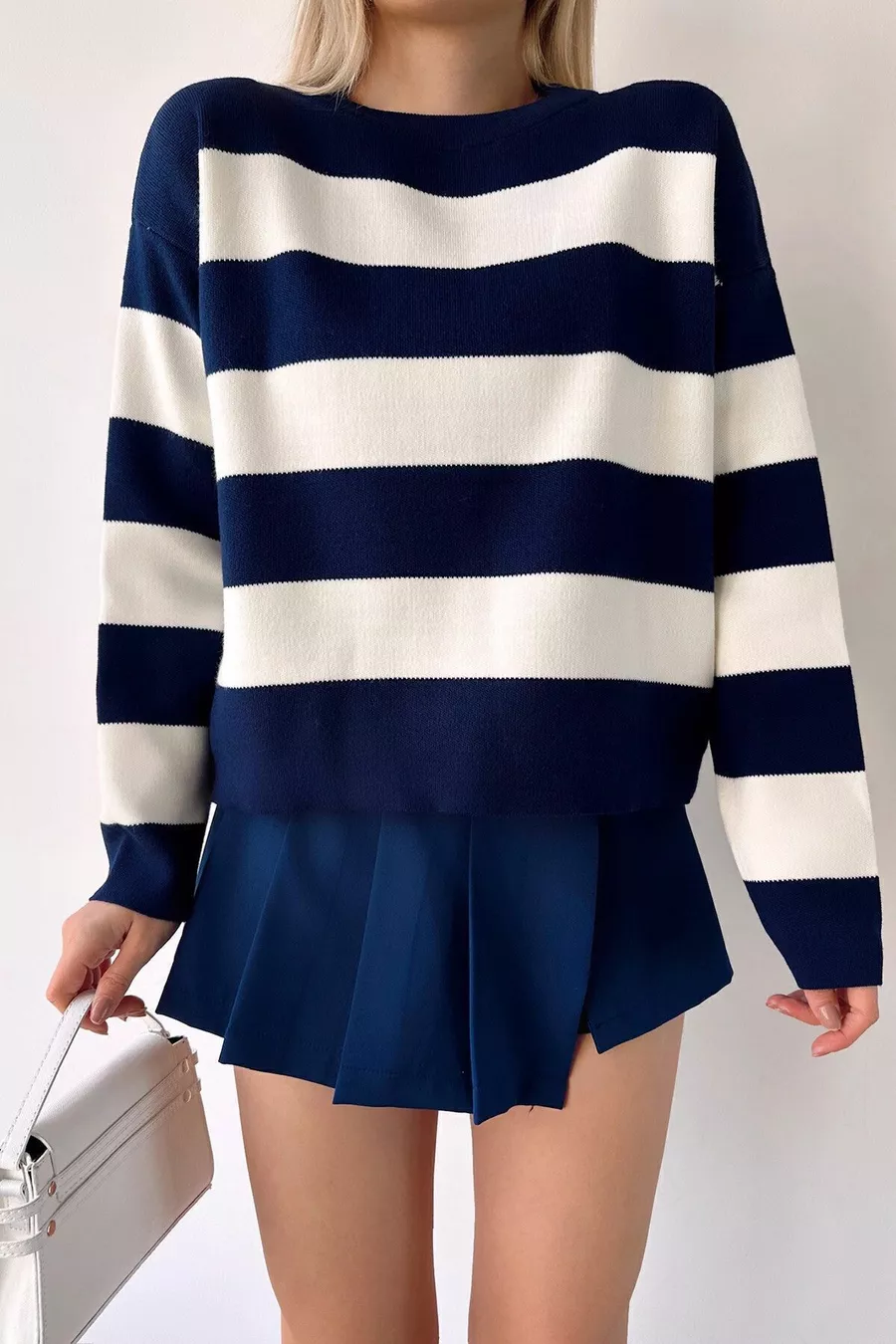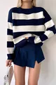 Motif : Rayé Coupe : Regular Type de col : Col rond Type de tissu : Tricot Couleur : Bleu marine Matériau : Acrylique - Coton Type de manches : Manches standard Poches : Sans poches Type de produit : Uni Longueur des manches : Longues Épaisseur : Moyenne Collection : Basique Silhouette : Basique Occasion : Jour / Nuit Longueur : Regular Technique d'impression / broderie : Sans impression Persona : Cool & Confort Détail durabilité : Non Présence de ceinture / bande : Sans ceinture Composition du matériau : 70% Coton, 30% Acrylique Instructions de lavage : Type 1