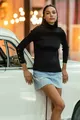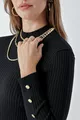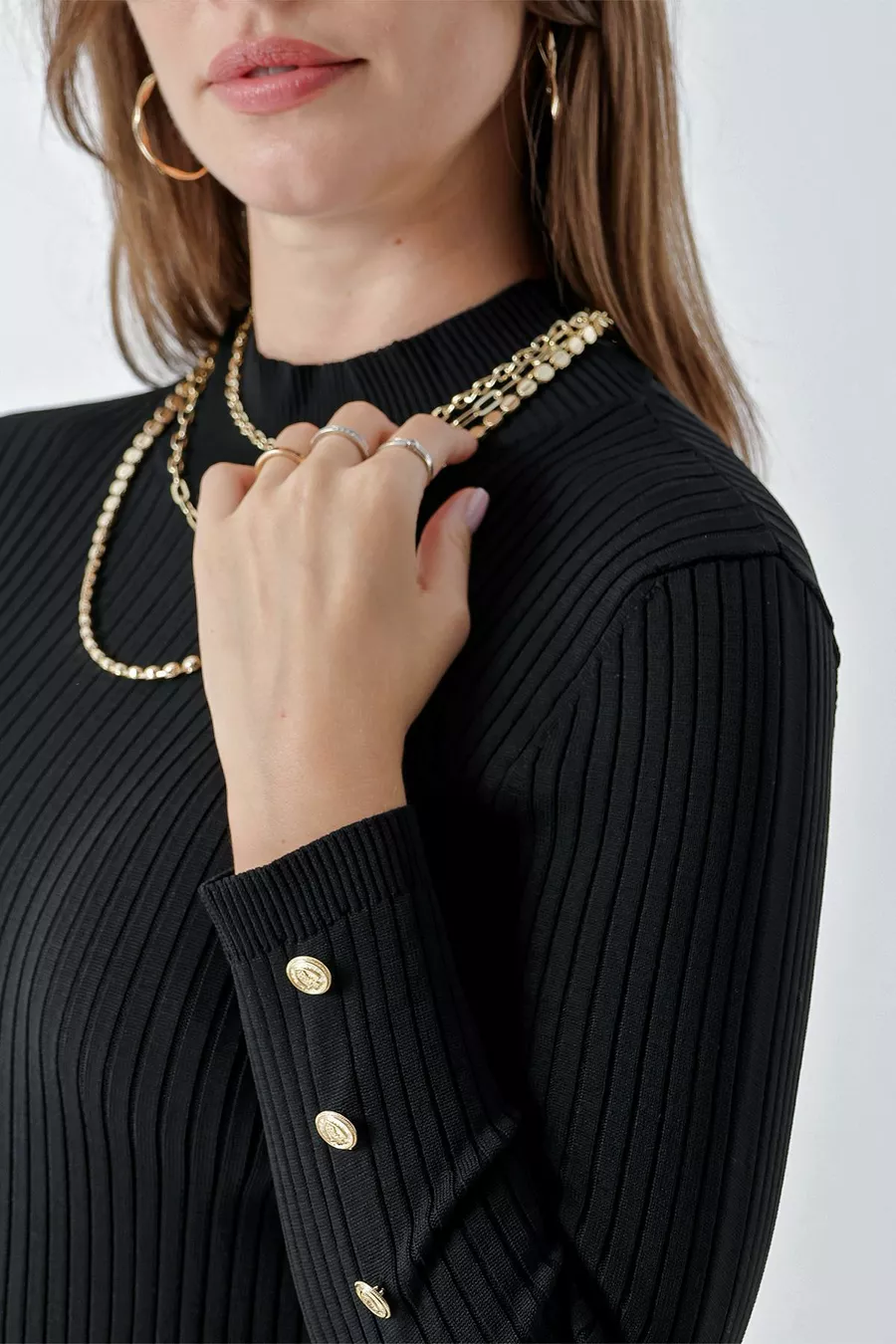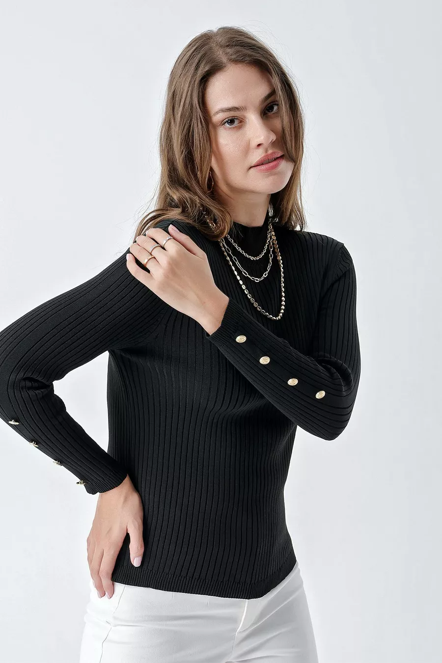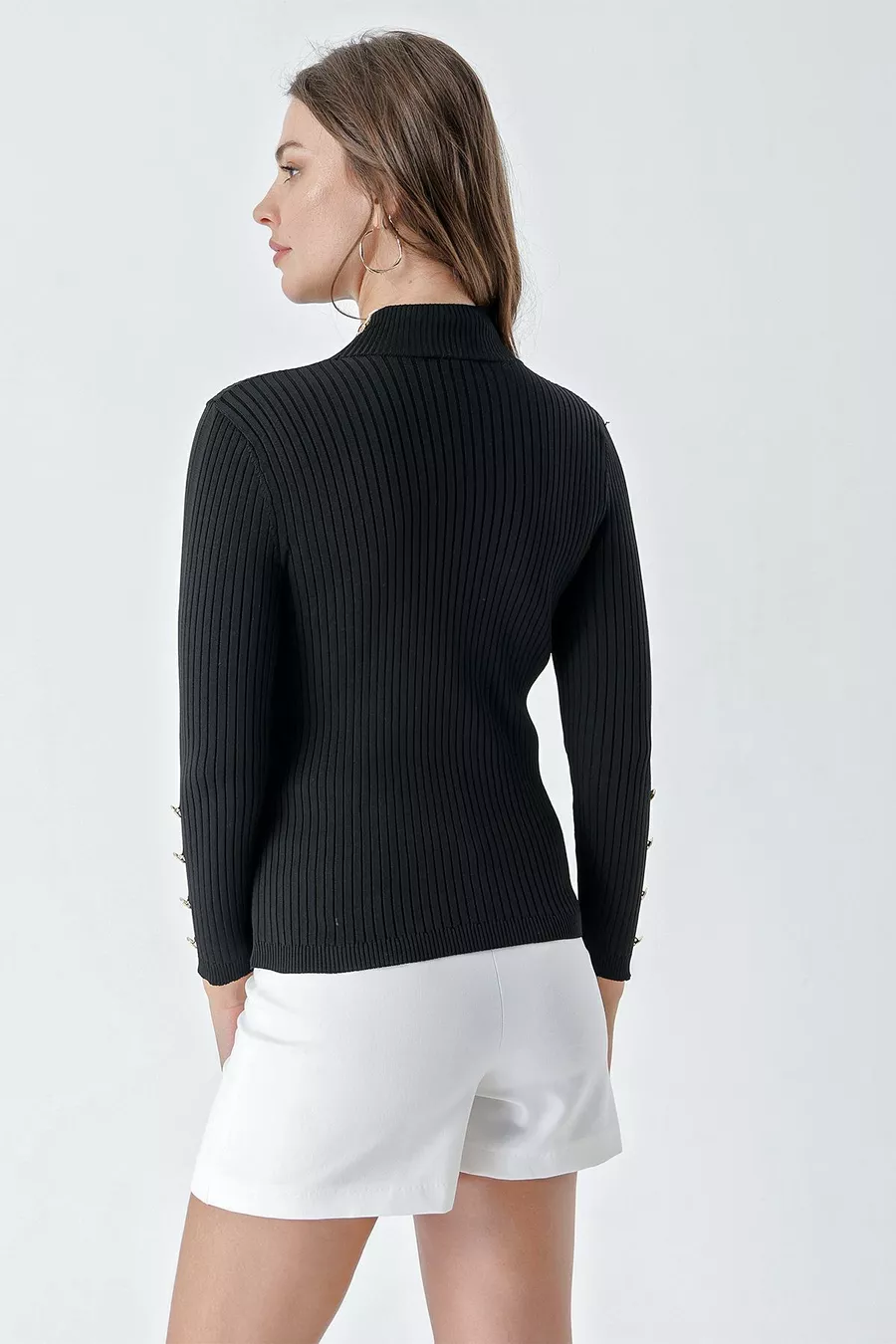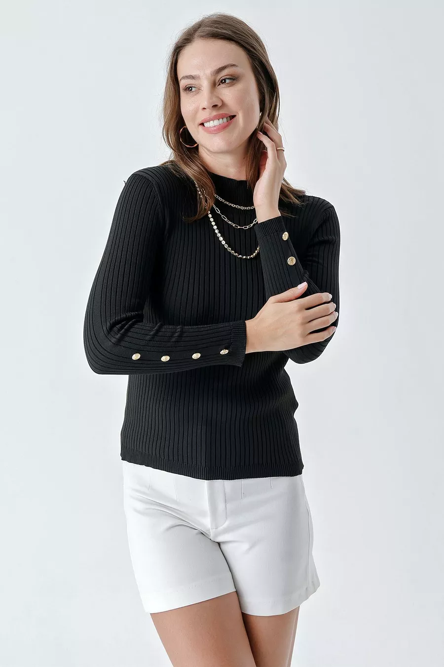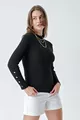 Pull côtelé à col montant femme avec boutons, noir