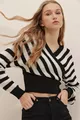 Pull court en tricot rayé croisé devant et derrière pour femme, noir