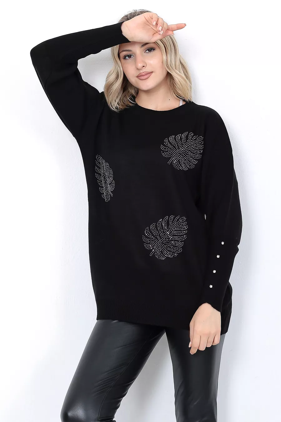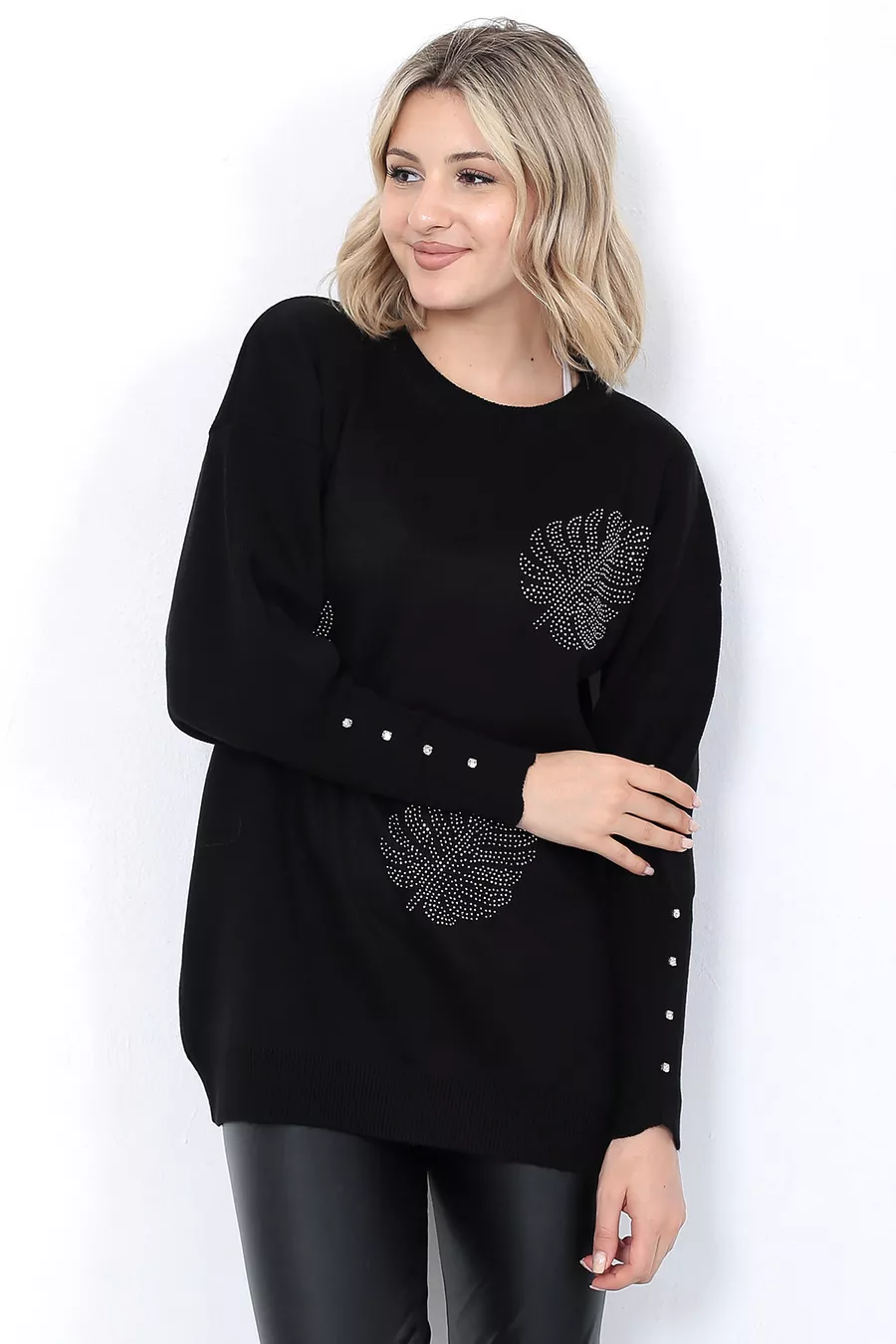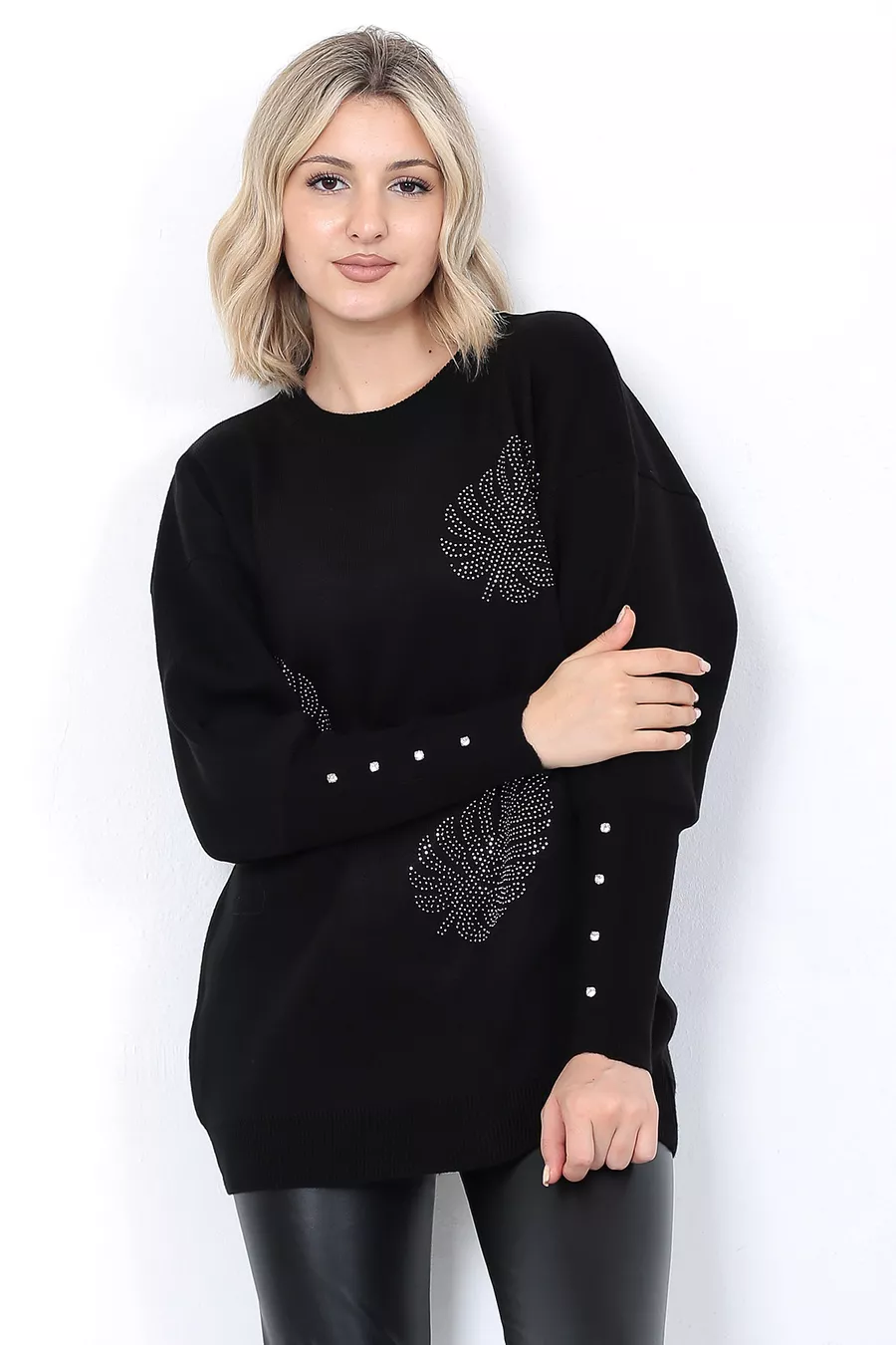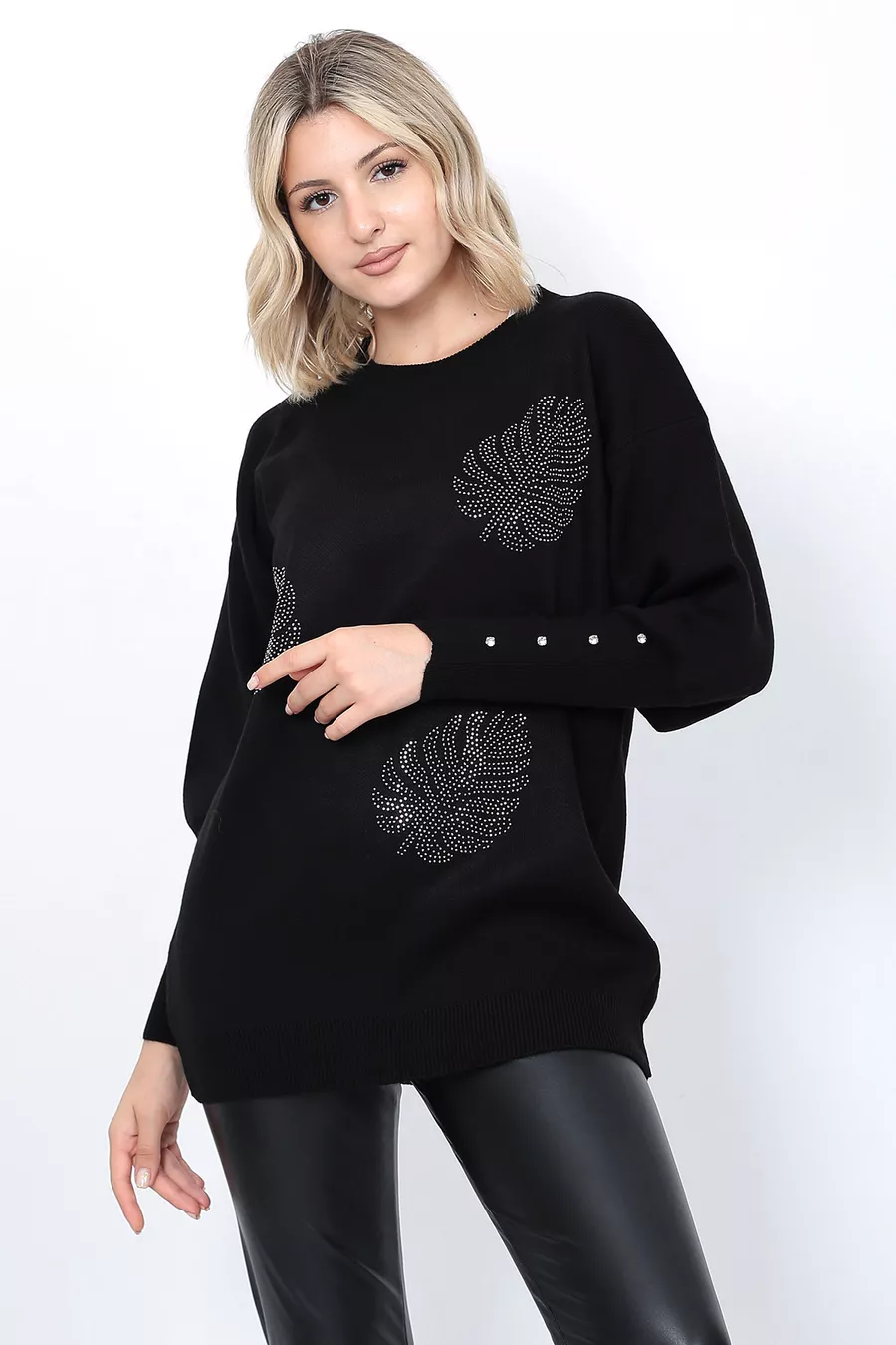 Pull en tricot pour femme Col rond Motif feuilles Manches avec pierres Oversize Noir