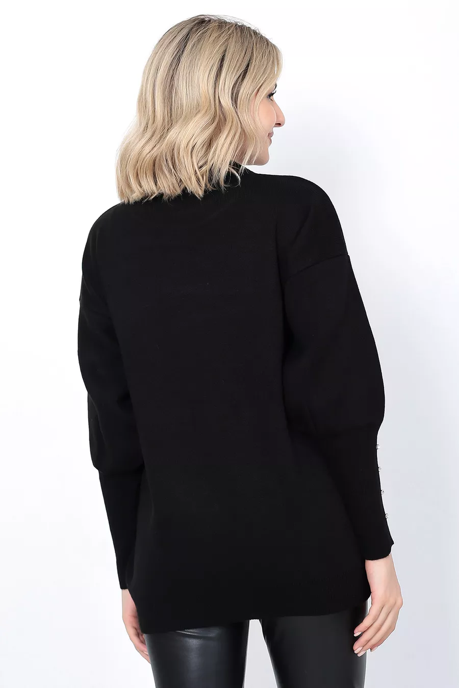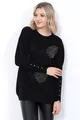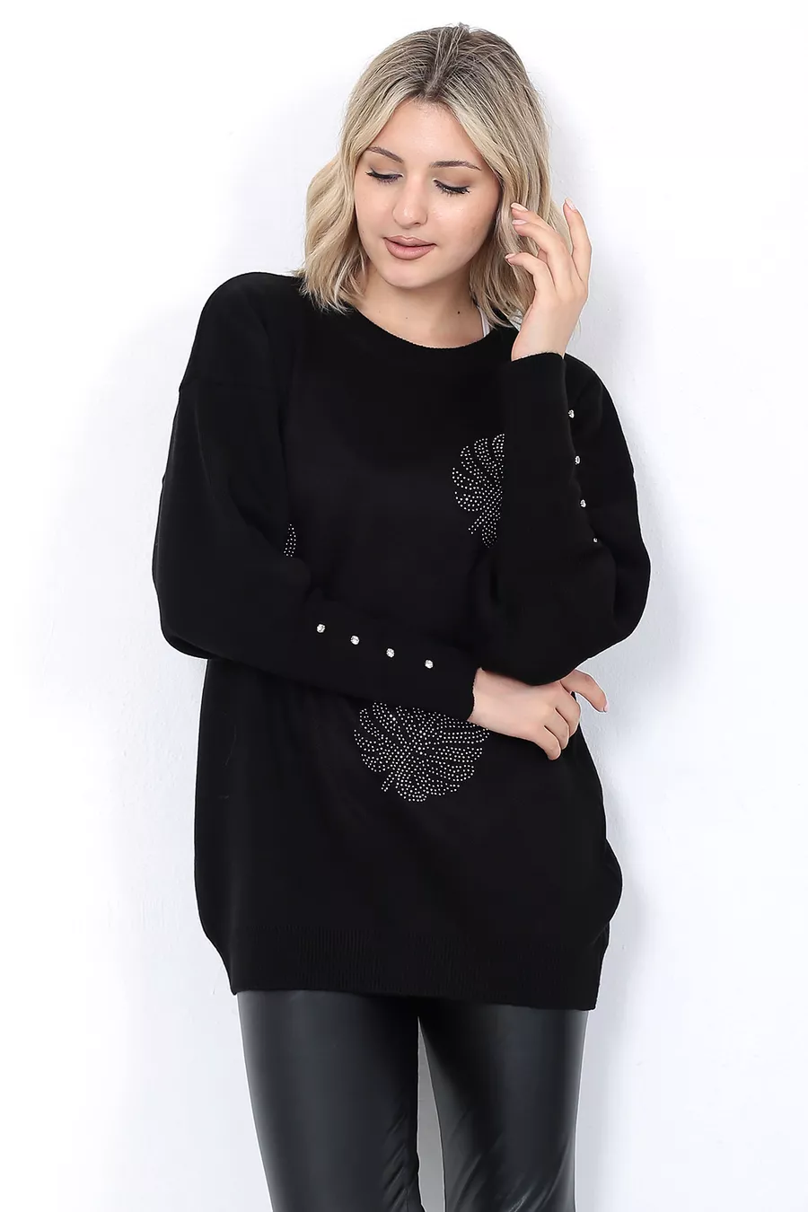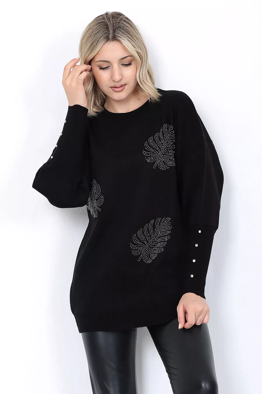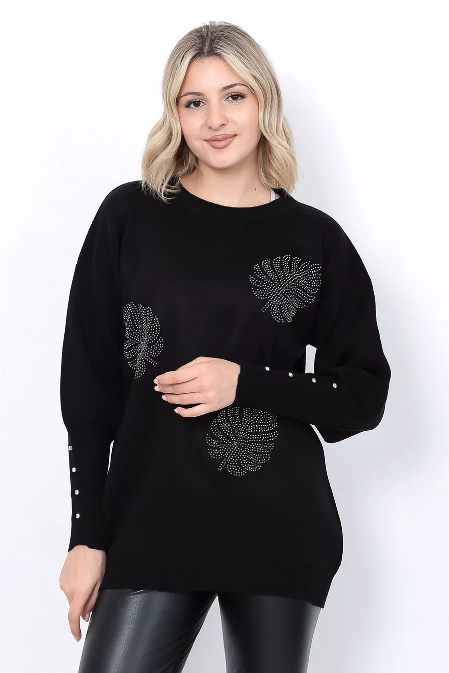 Pull en tricot pour femme Col rond Motif feuilles Manches avec pierres Oversize Noir