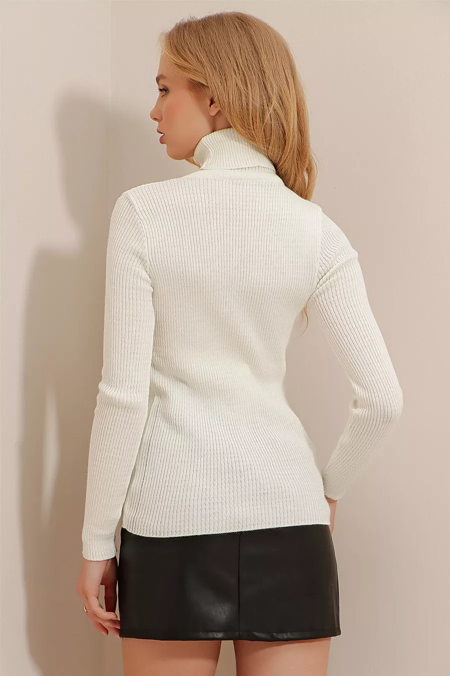 Pull en tricot côtelé pour femme, col roulé écru