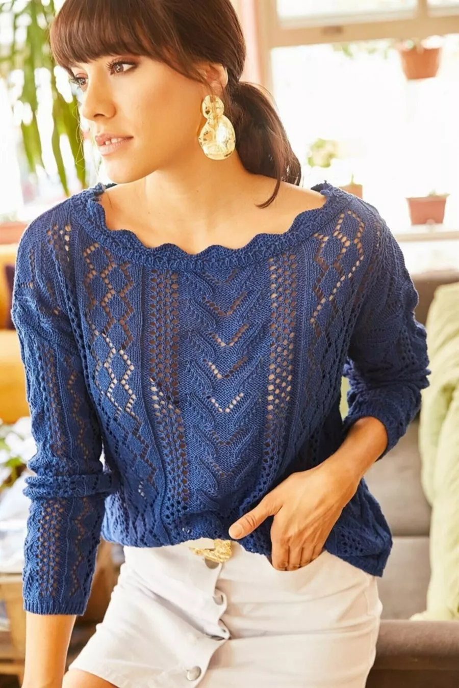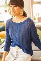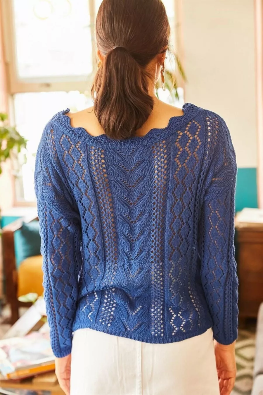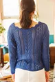 Pull en tricot ajouré pour femme, col bateau, bleu saphir