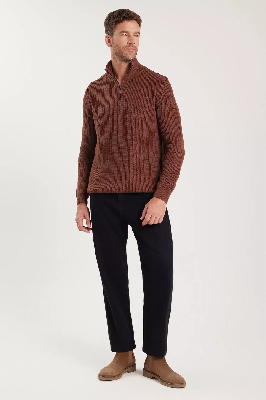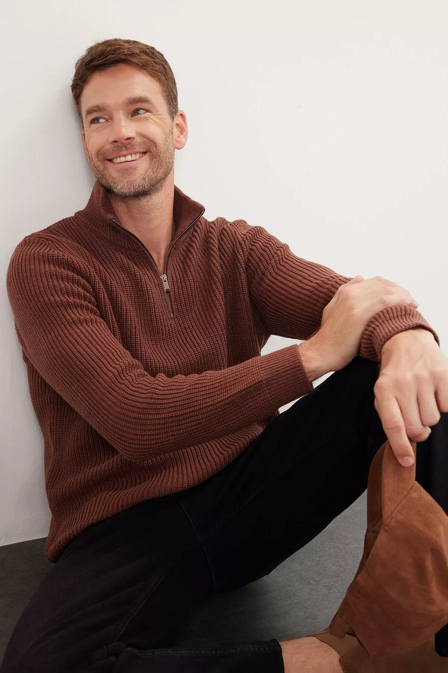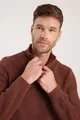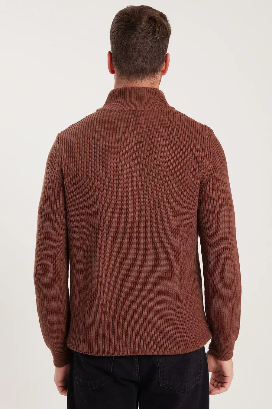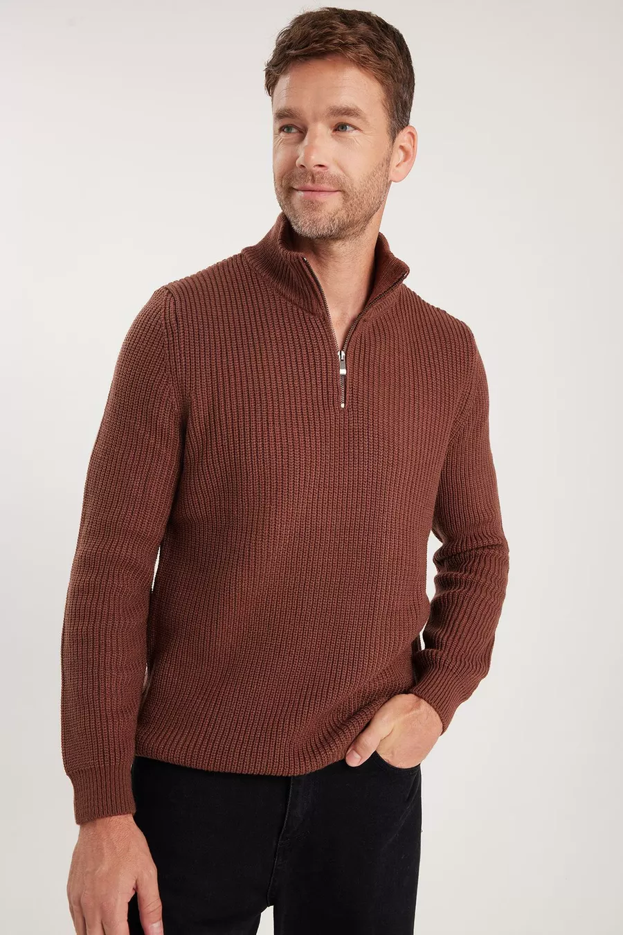 Pull en tricot marron pour homme à col montant, coupe slim, fermeture éclair