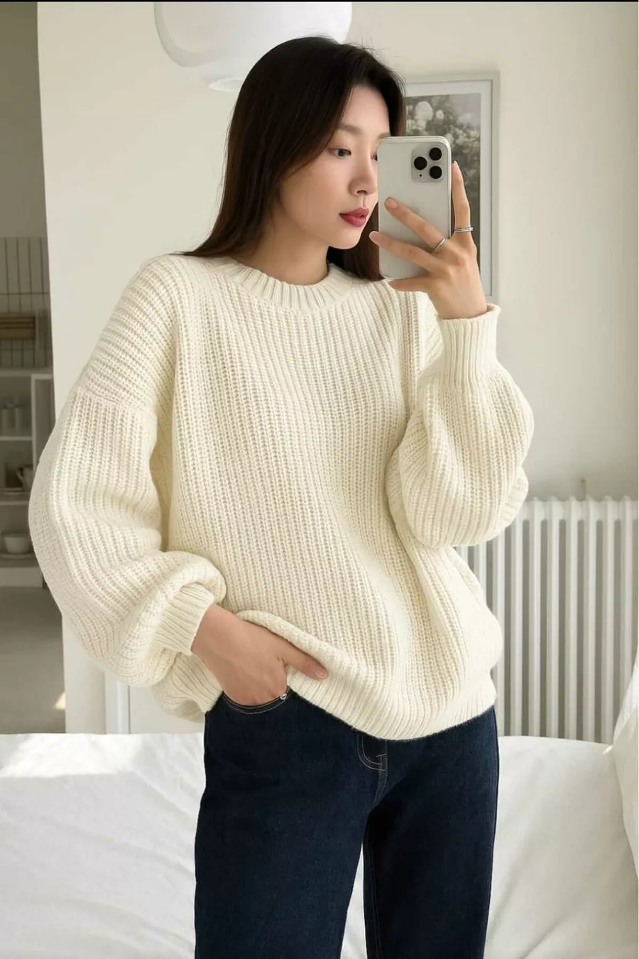 Pull en tricot oversize pour femme à col rond couleur écrue