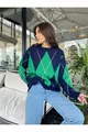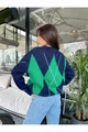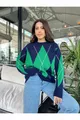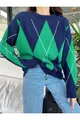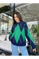 Pull femme à col rond, motif losanges bleu marine - Baklava vert, rayure blanche