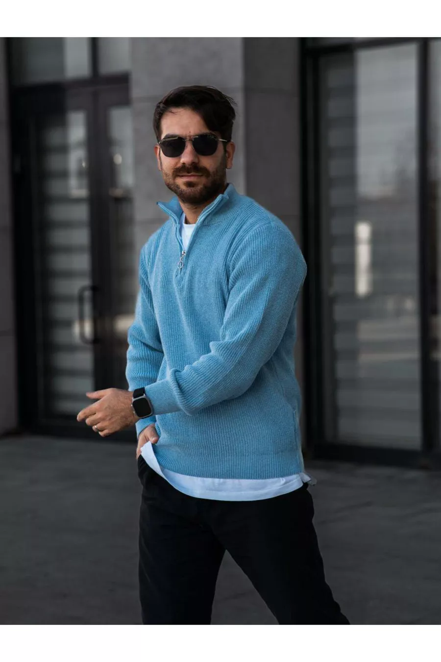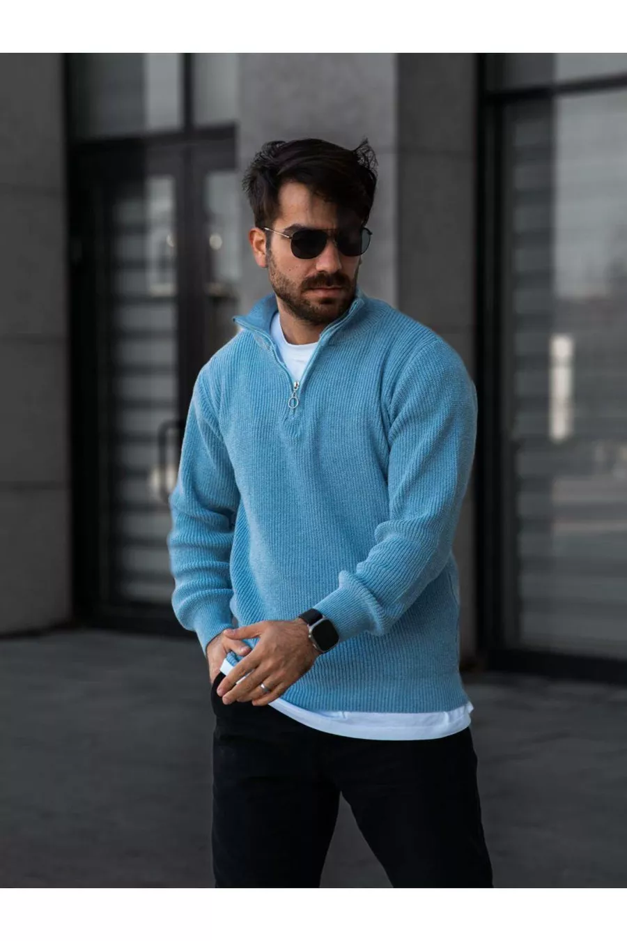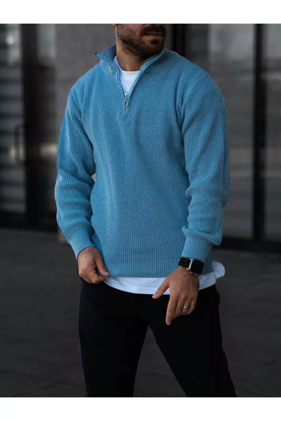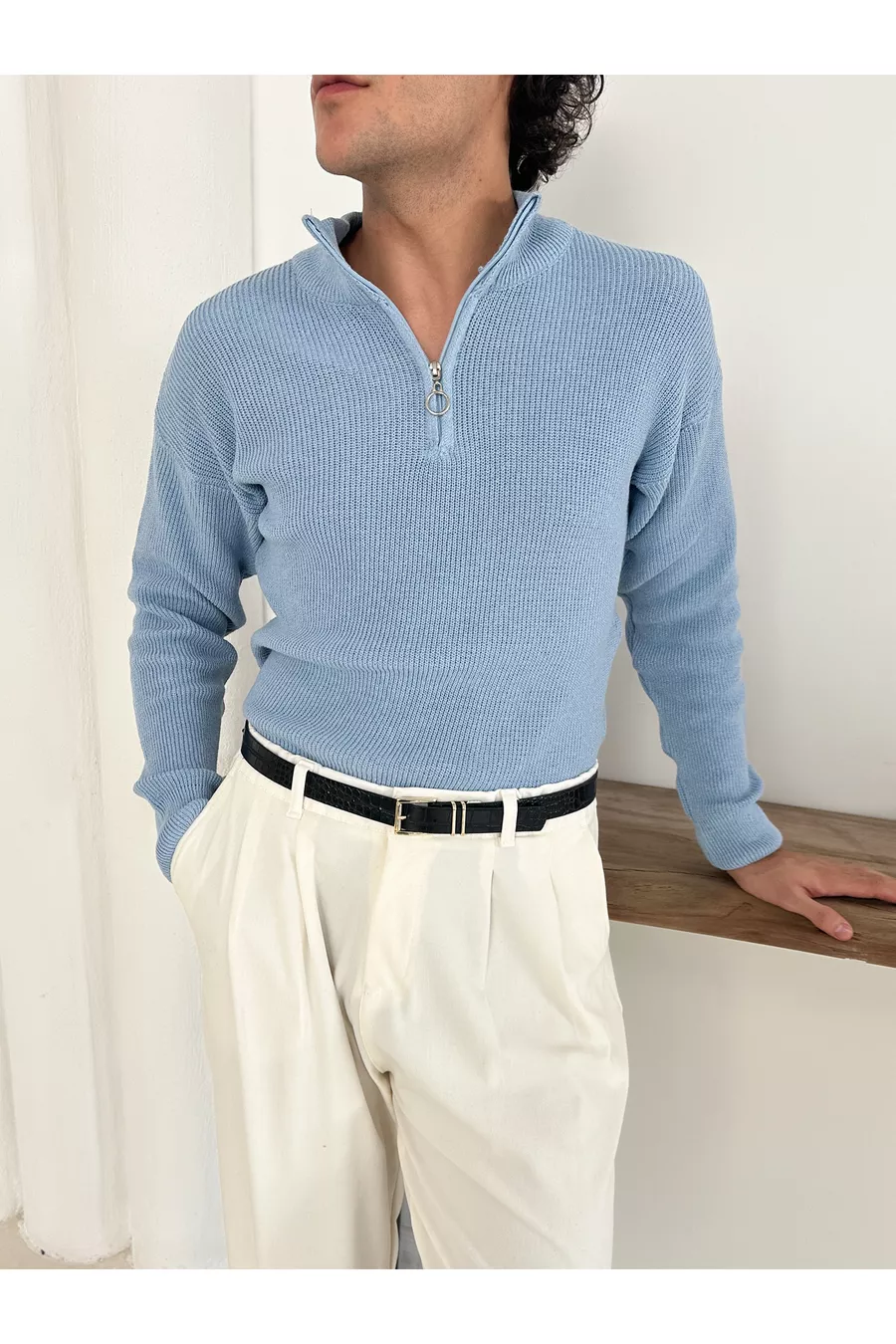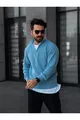 Pull homme en tricot à demi-fermeture éclair, maille tunisienne, bleu bébé