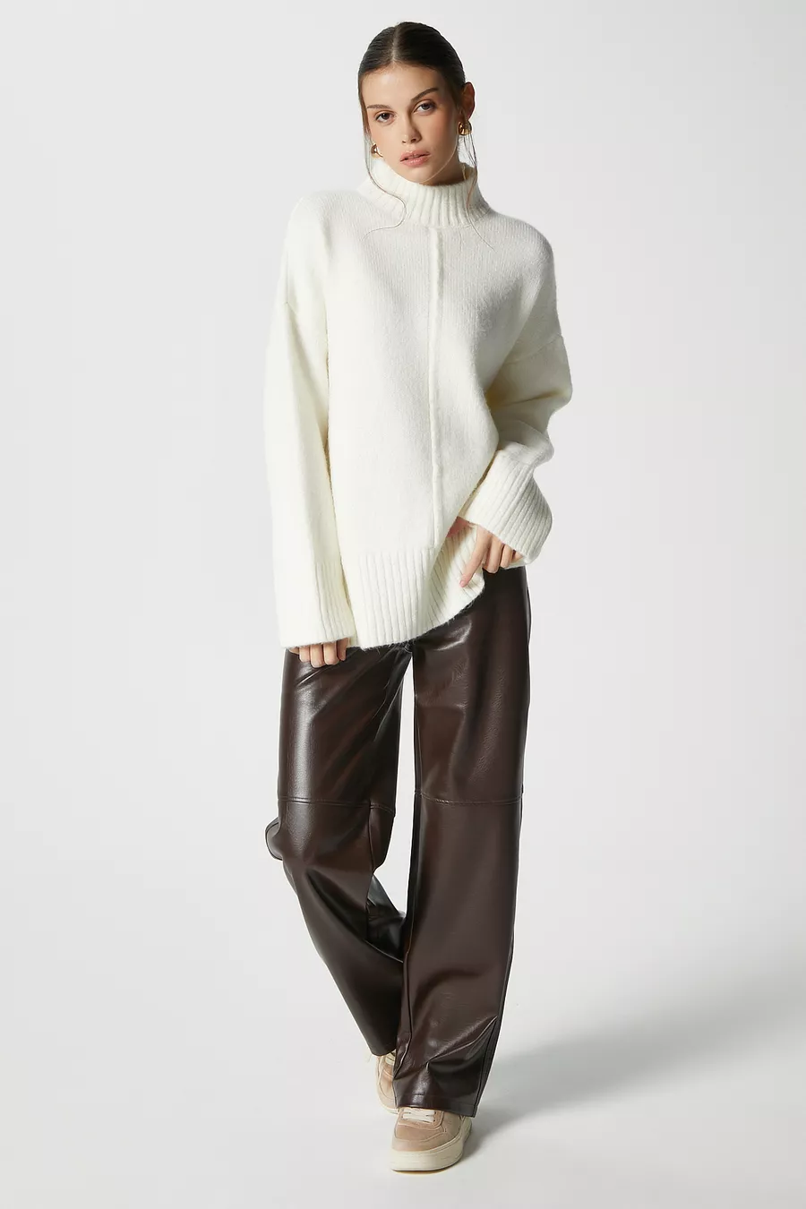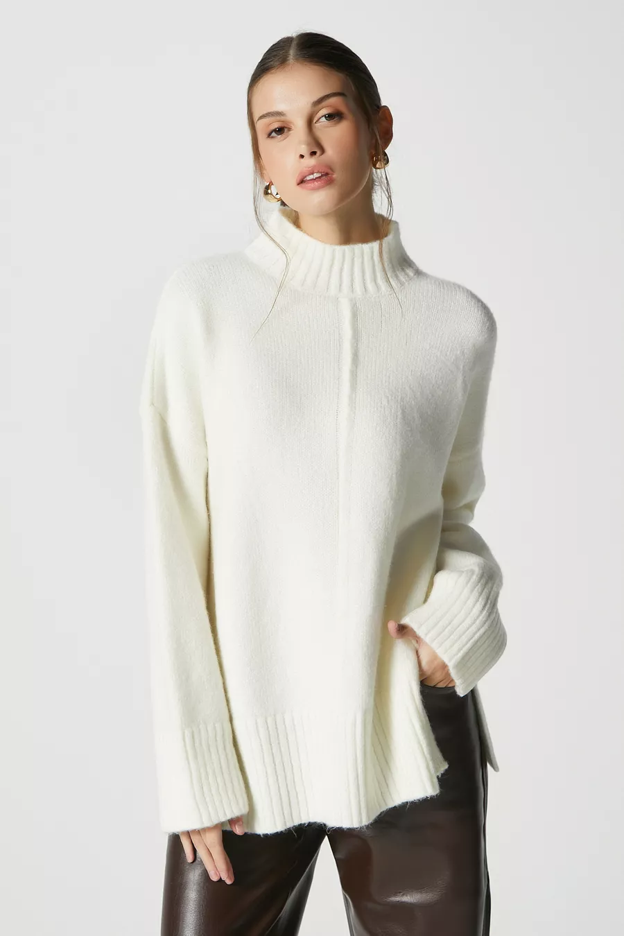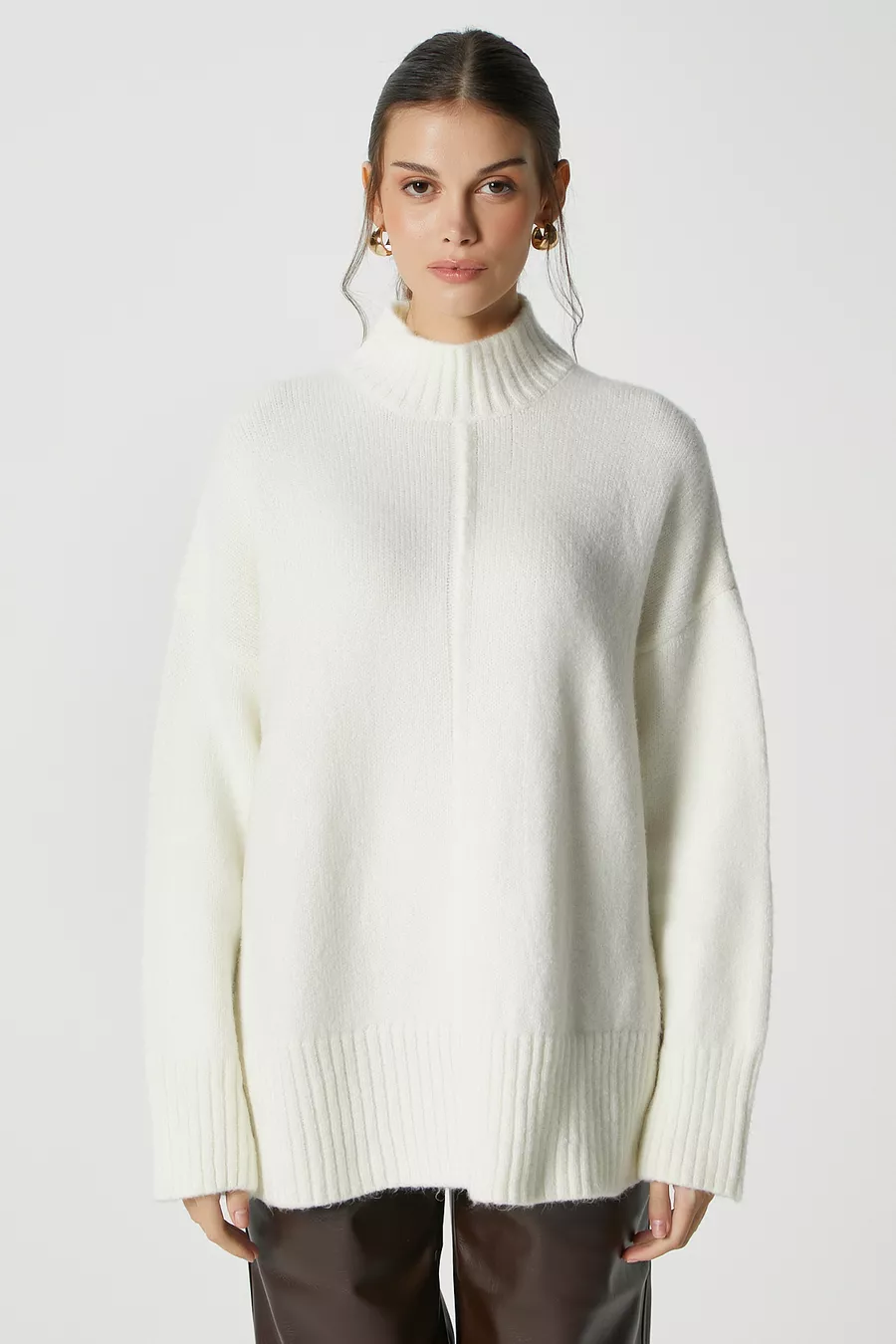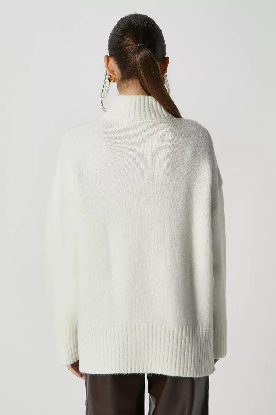 Pull oversize en tricot pour femme Wonder, col montant, écru, avec fente