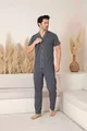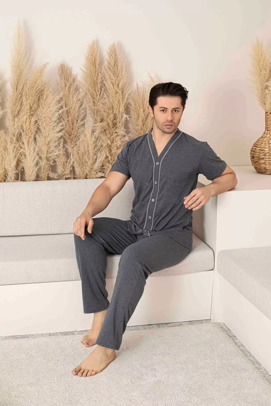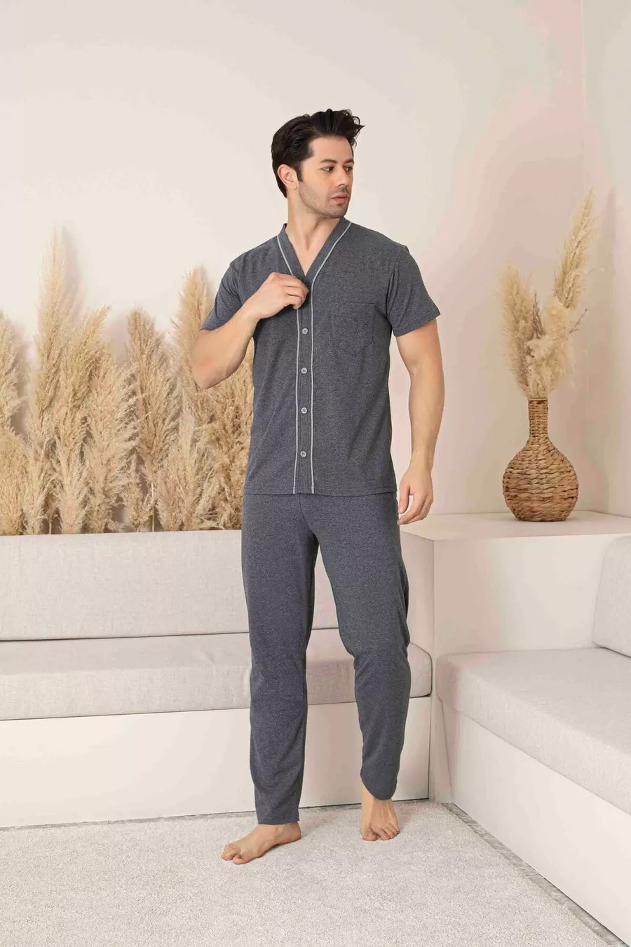 Pyjama d'été pour homme en tissu tricoté en coton, fumé, à manches courtes, boutonné à l'avant et pantalon long