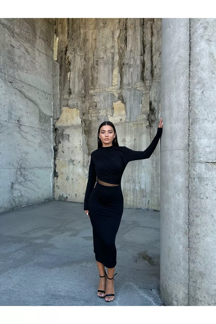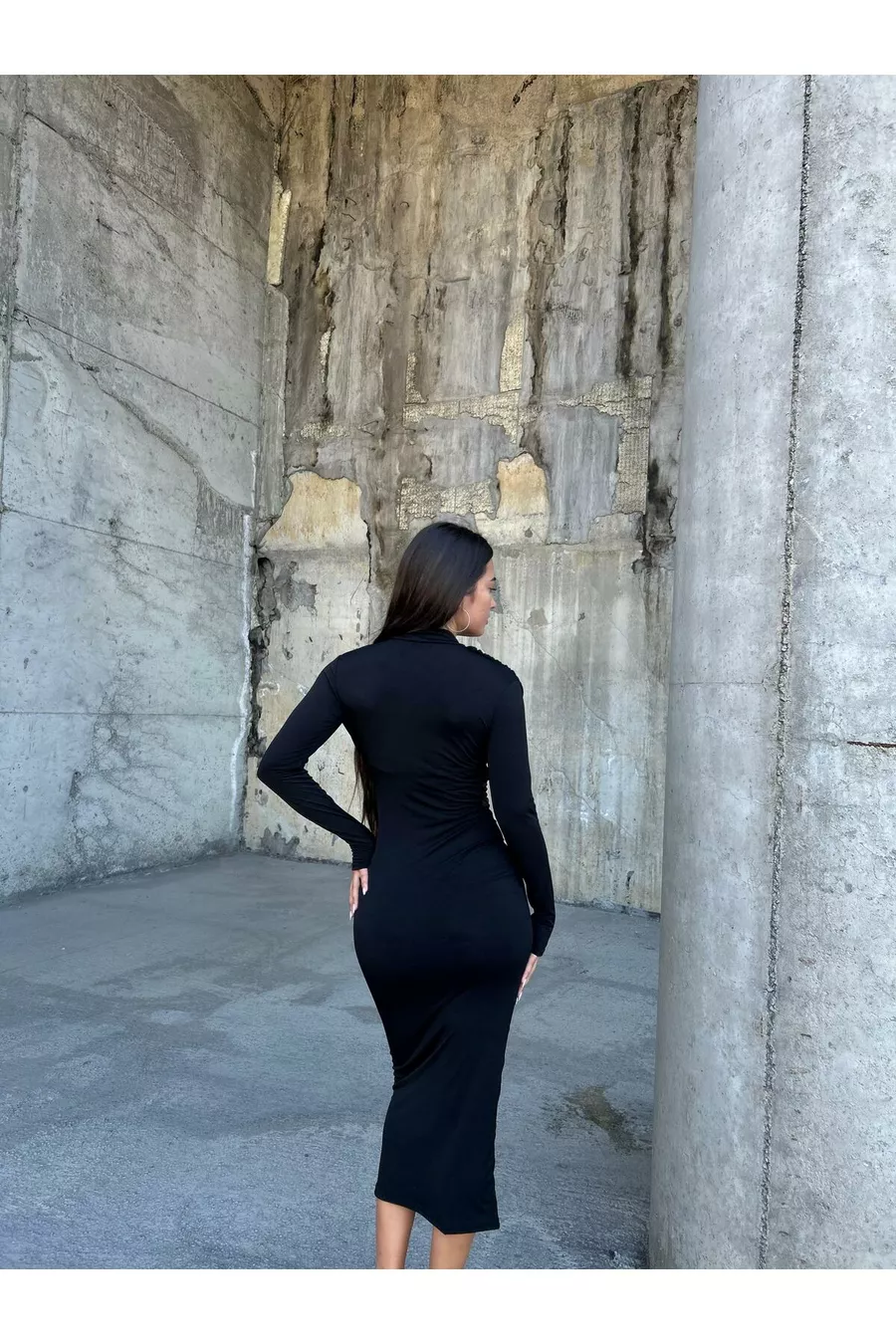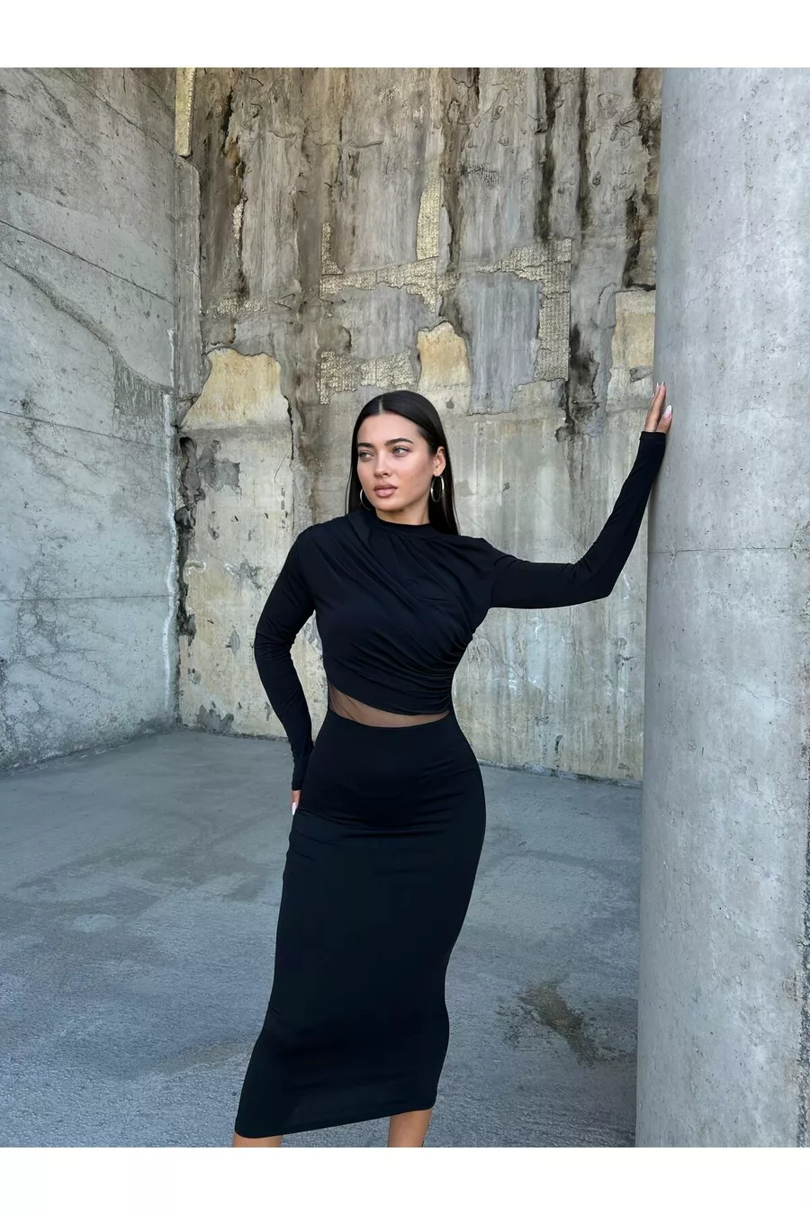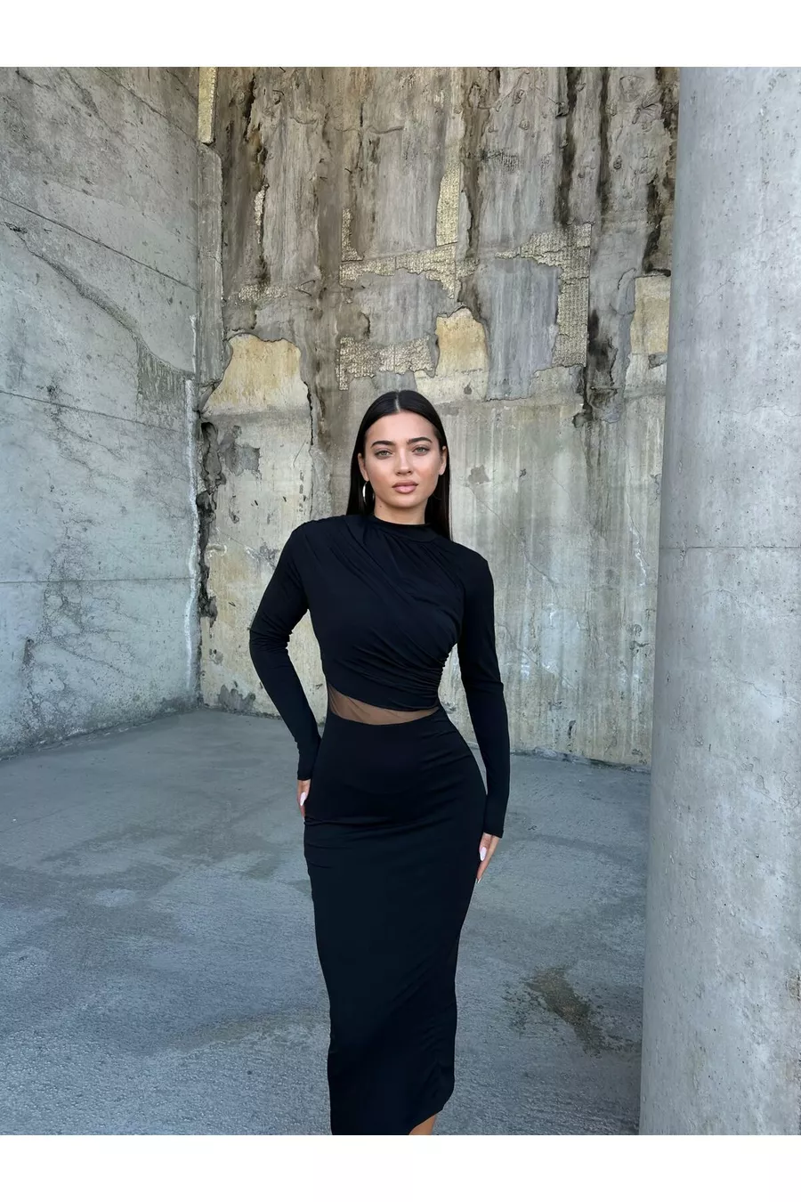 Robe crayon midi à manches longues avec col montant et détail en tulle en tissu Sandy extensible