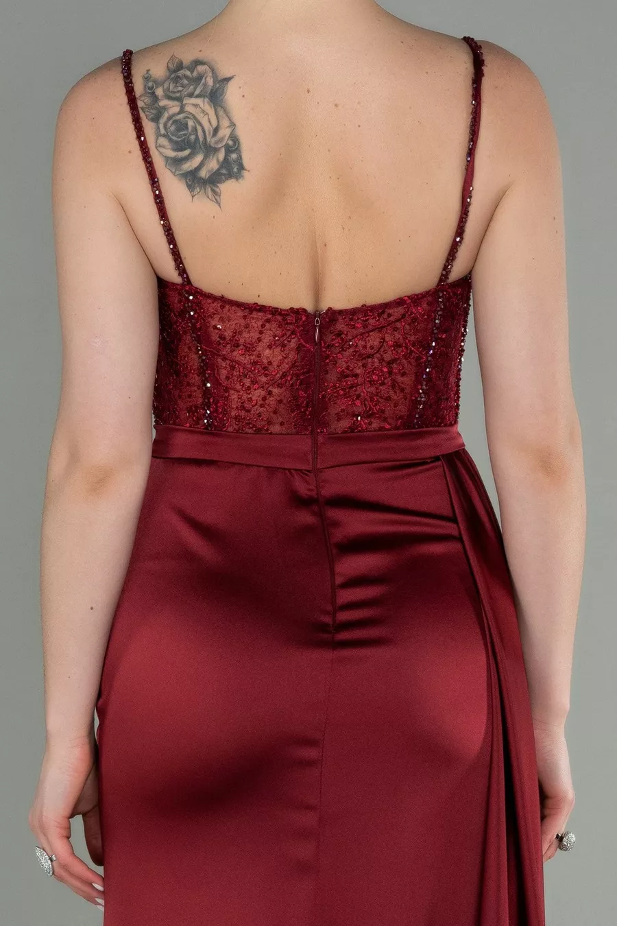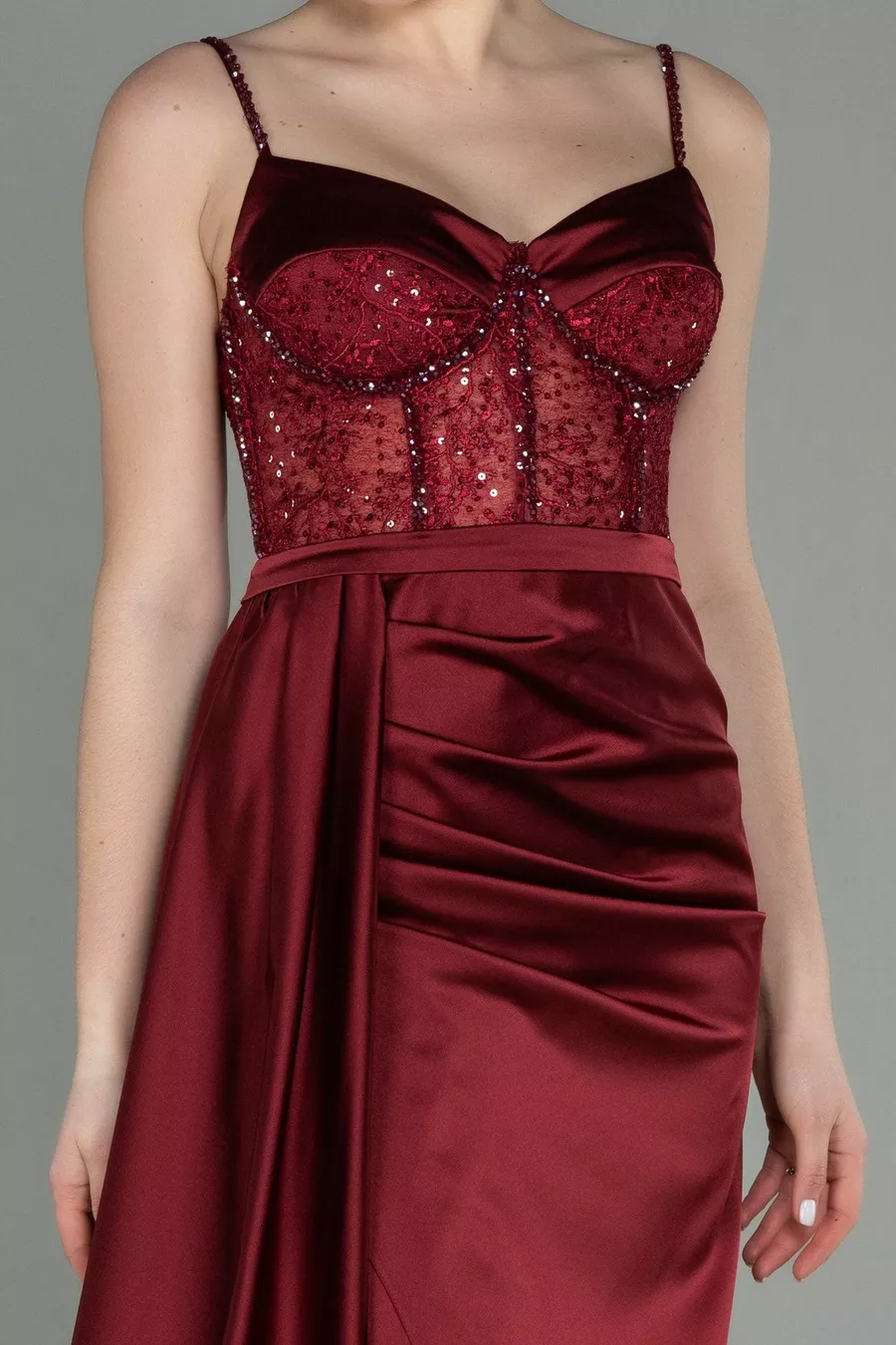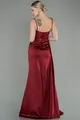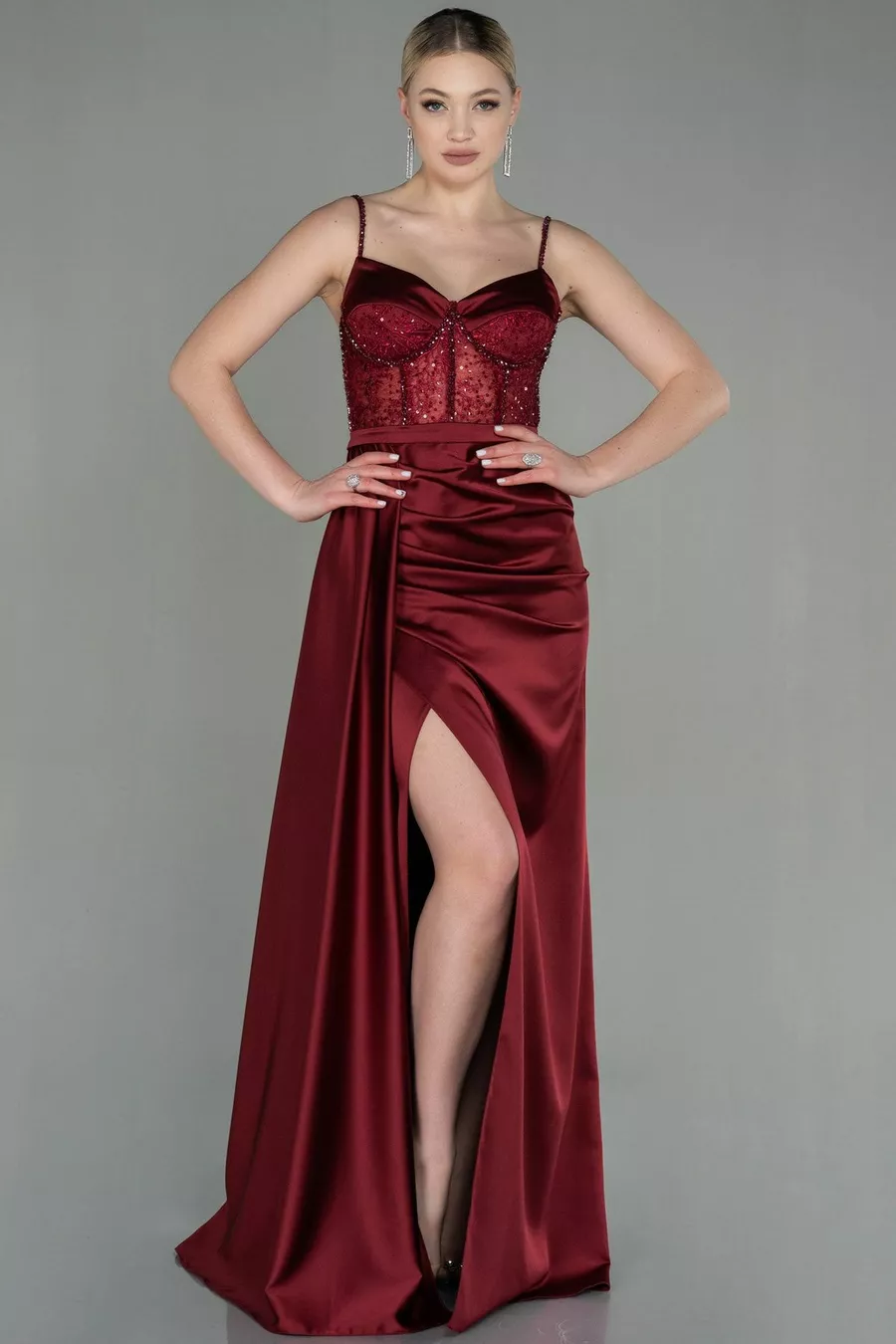 Robe de soirée longue en satin de pierre transparente bordeaux