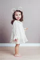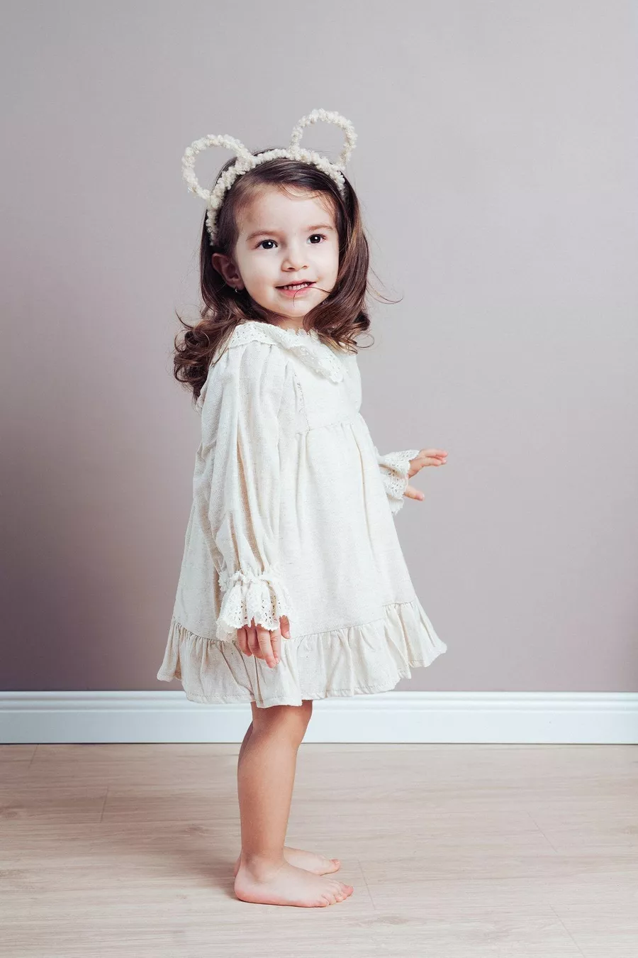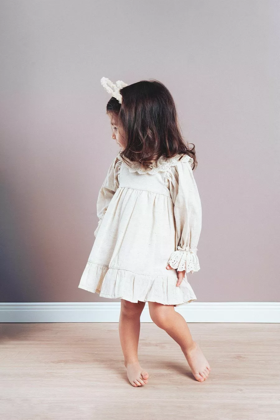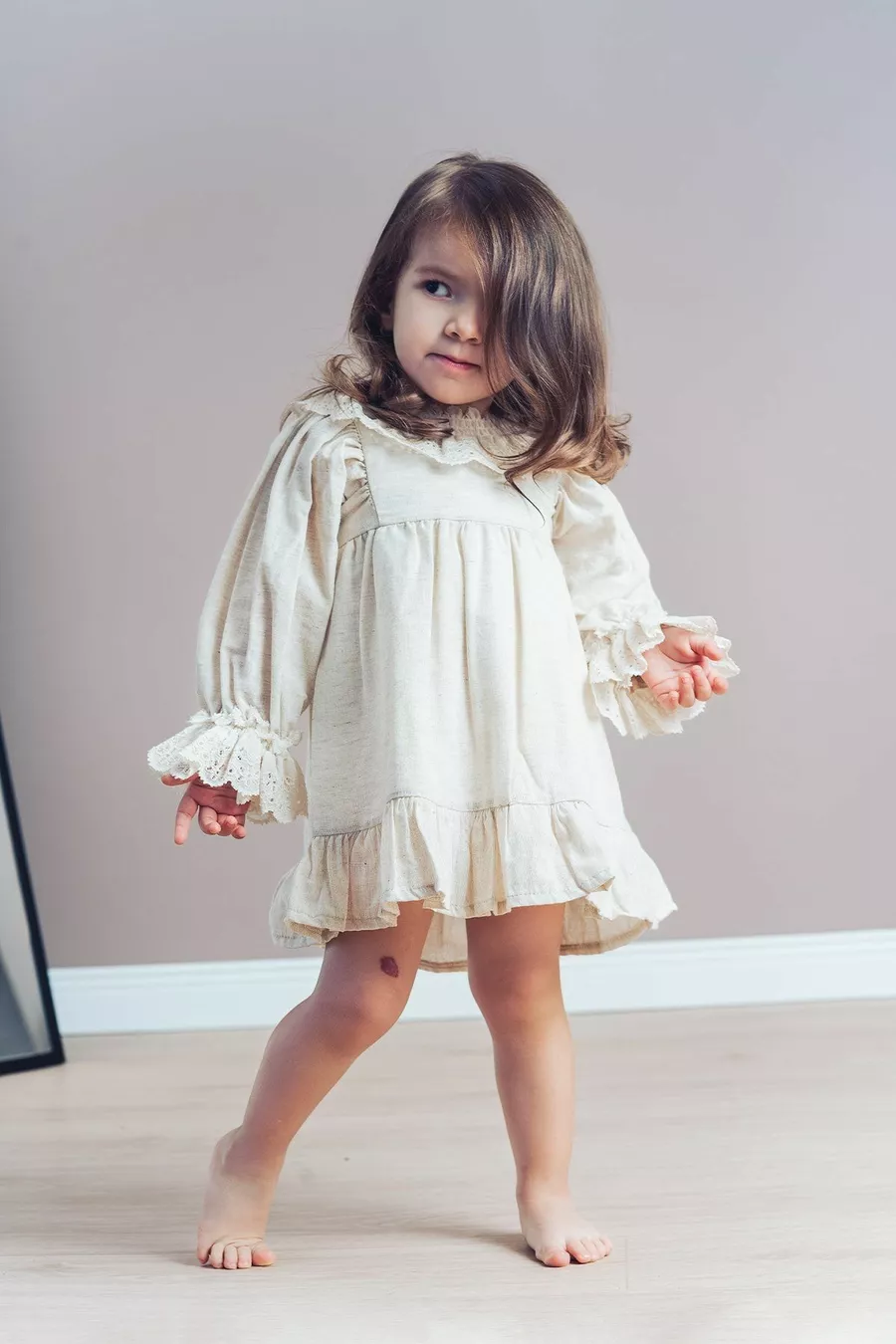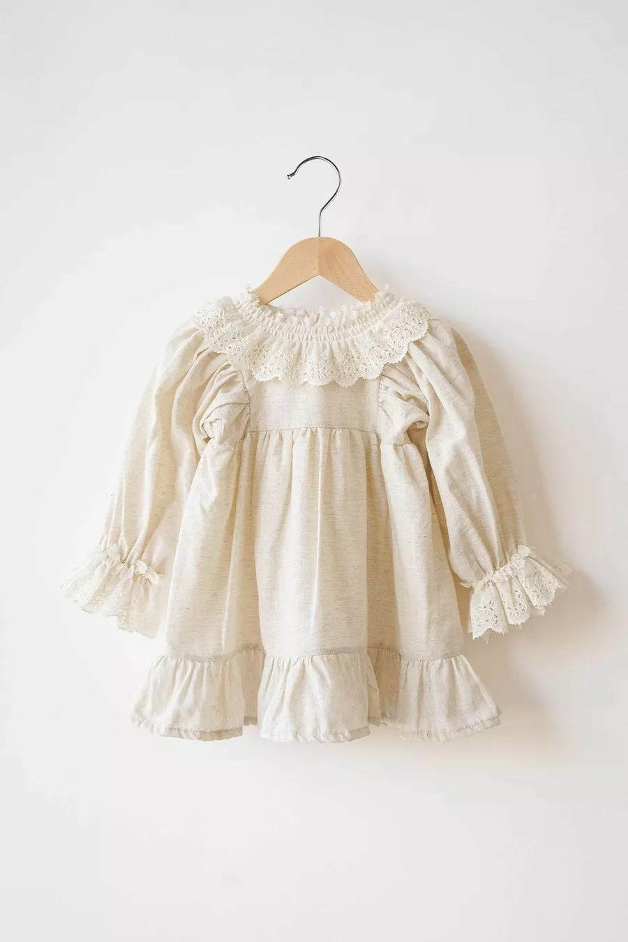 Robe en lin pour fille Sarah avec col en dentelle et manches ballon à poignets (beige)