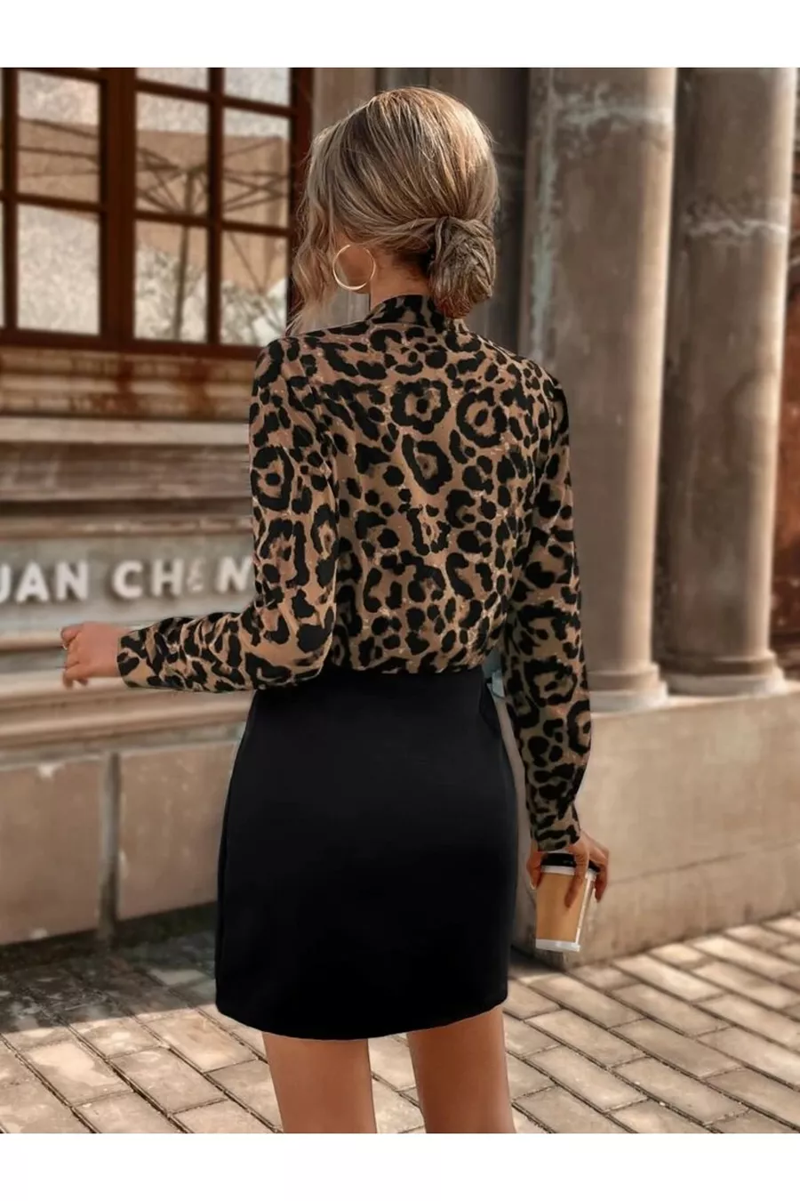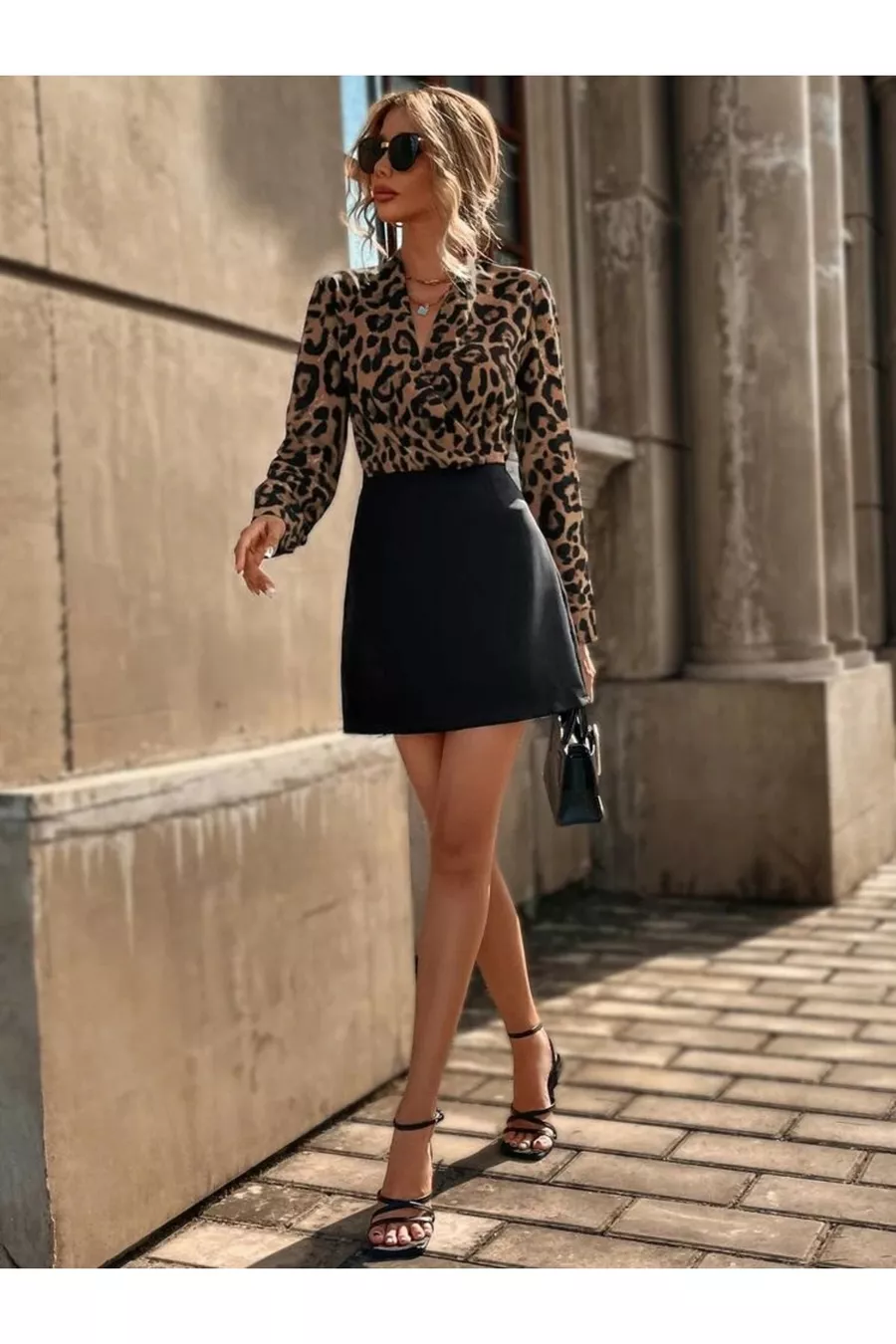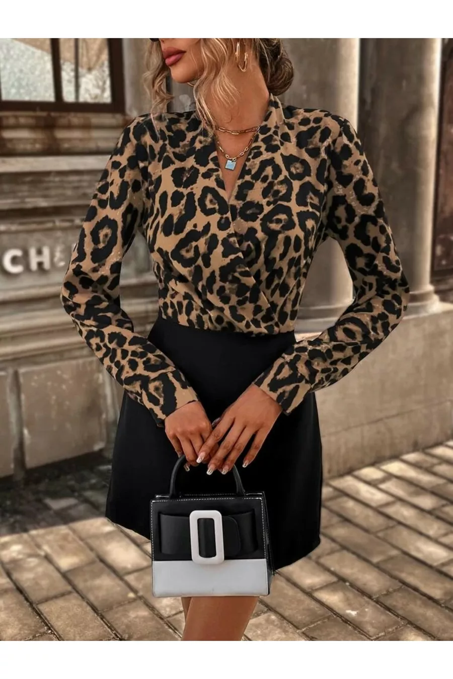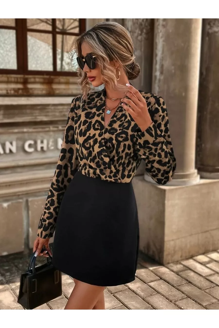 Robe en crêpe à manches longues pour femme avec col croisé et motif léopard