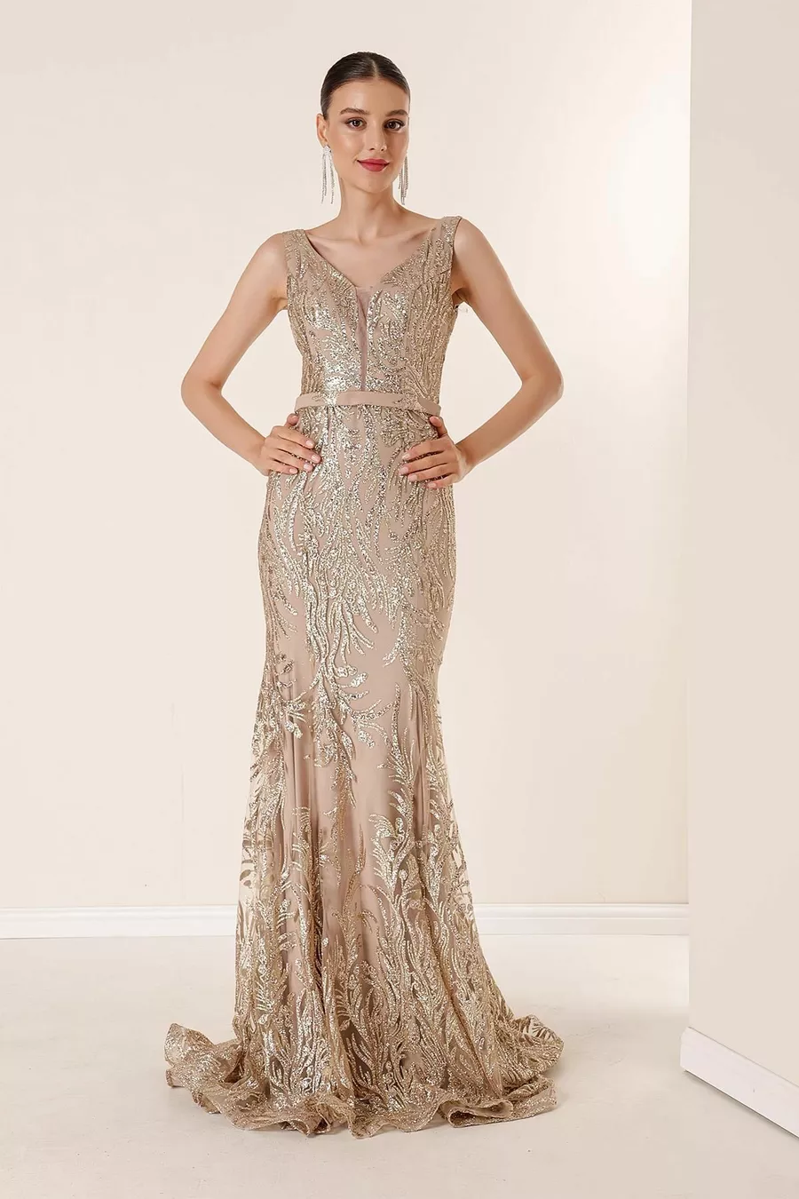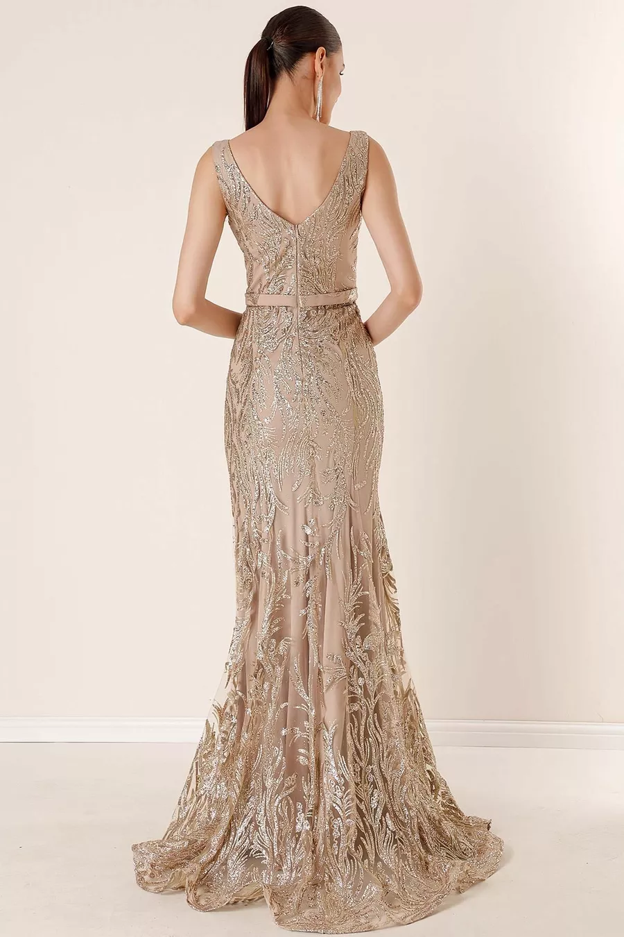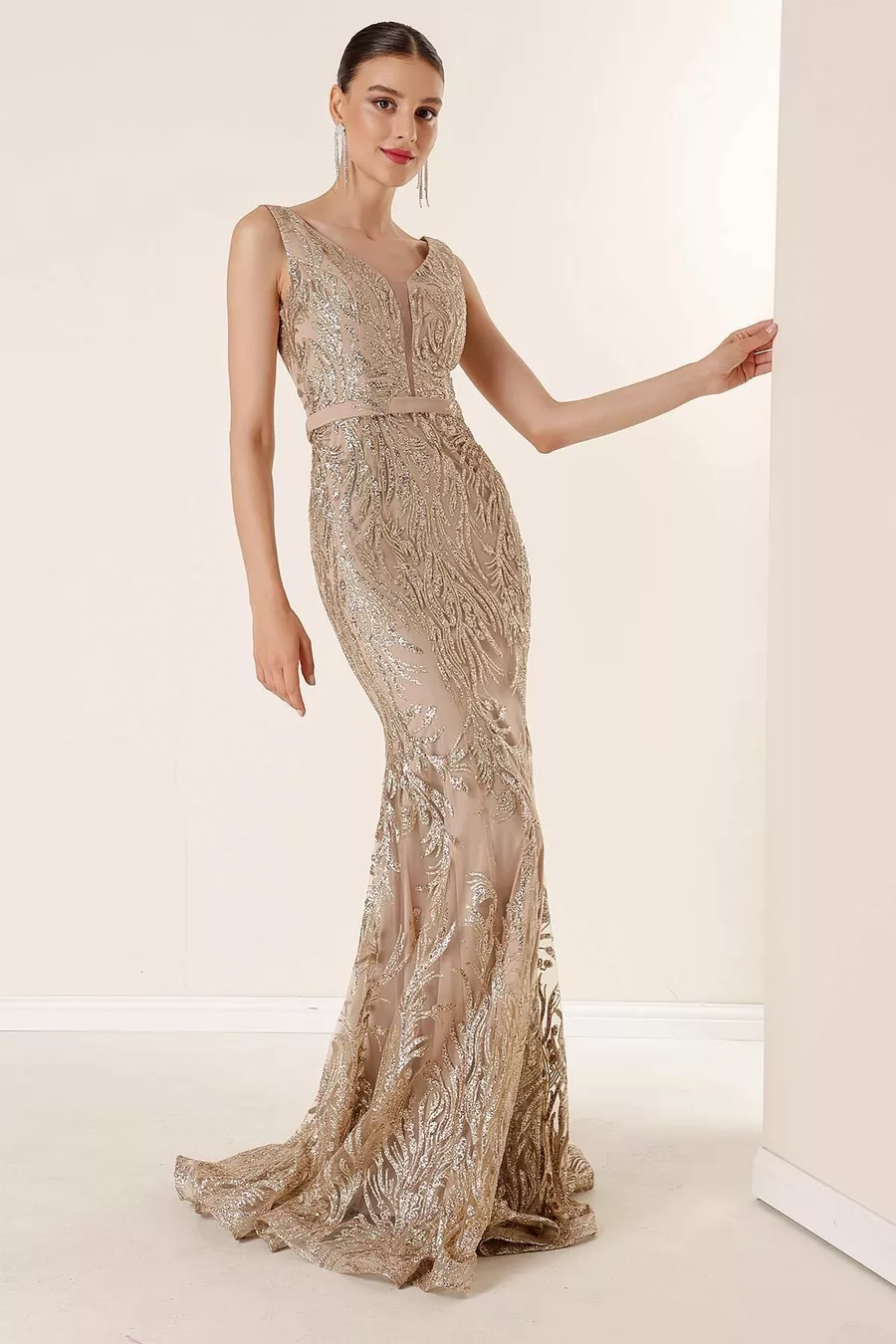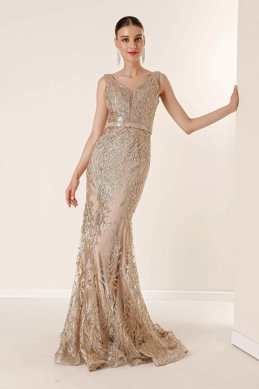 Robe longue à imprimé floqué pailleté doublée à col en V