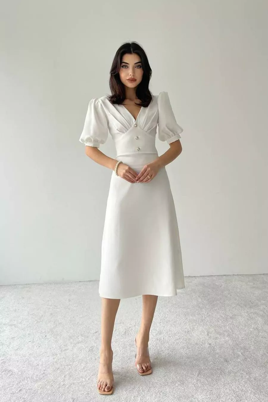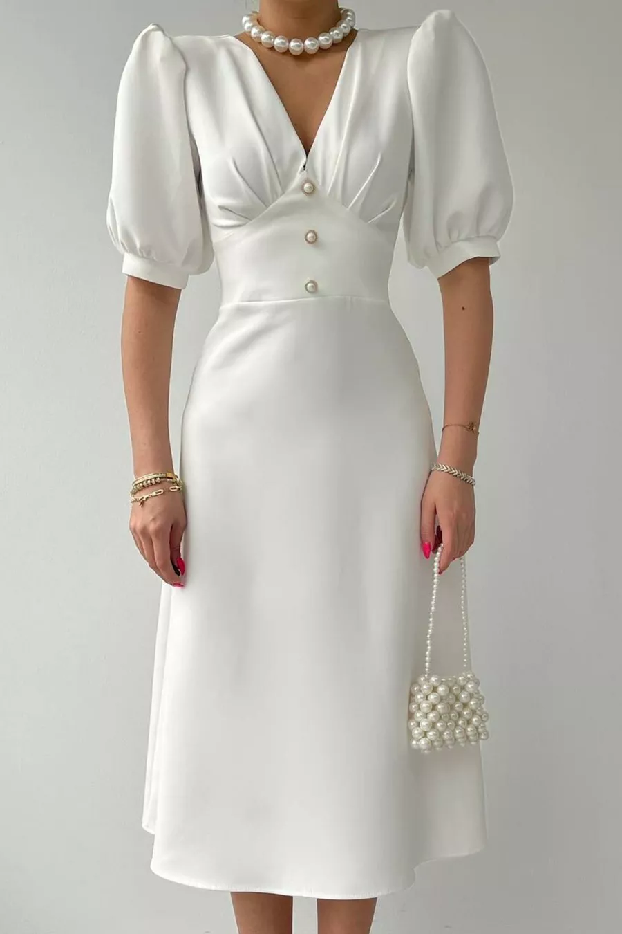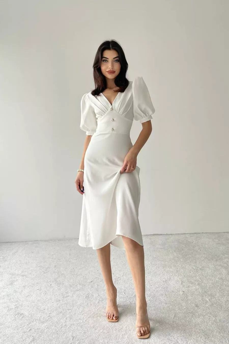 Robe midi femme blanche à col en V avec manches bouffantes et détails à boutons