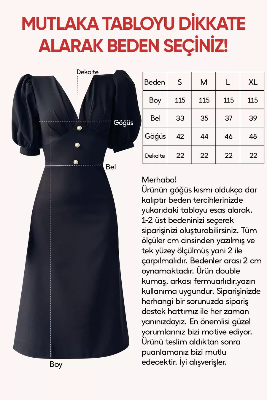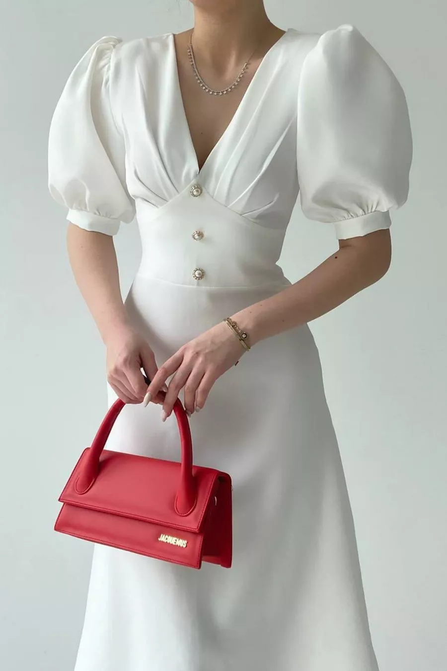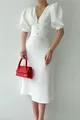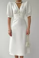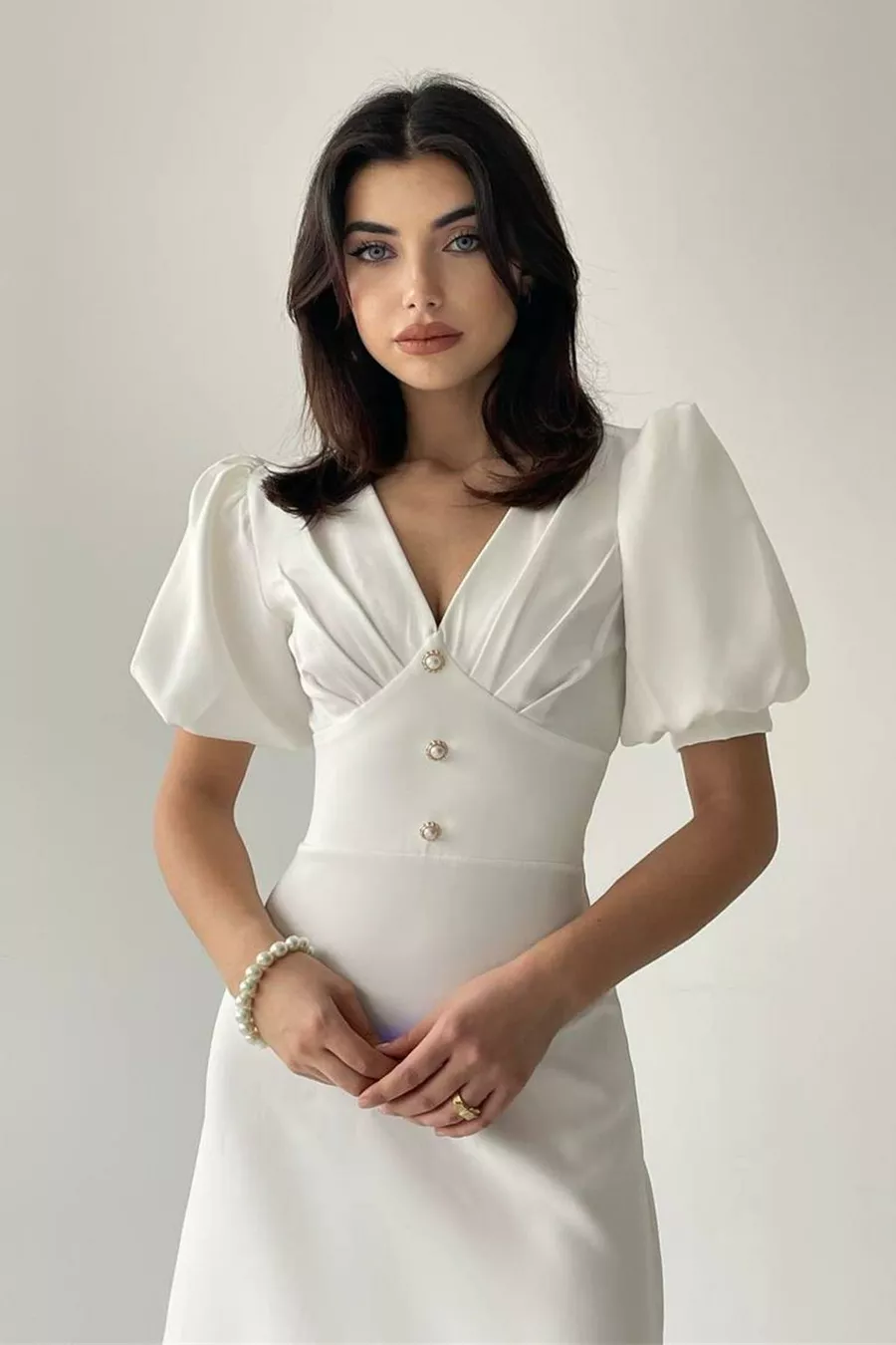 Robe midi femme blanche à col en V avec manches bouffantes et détails à boutons