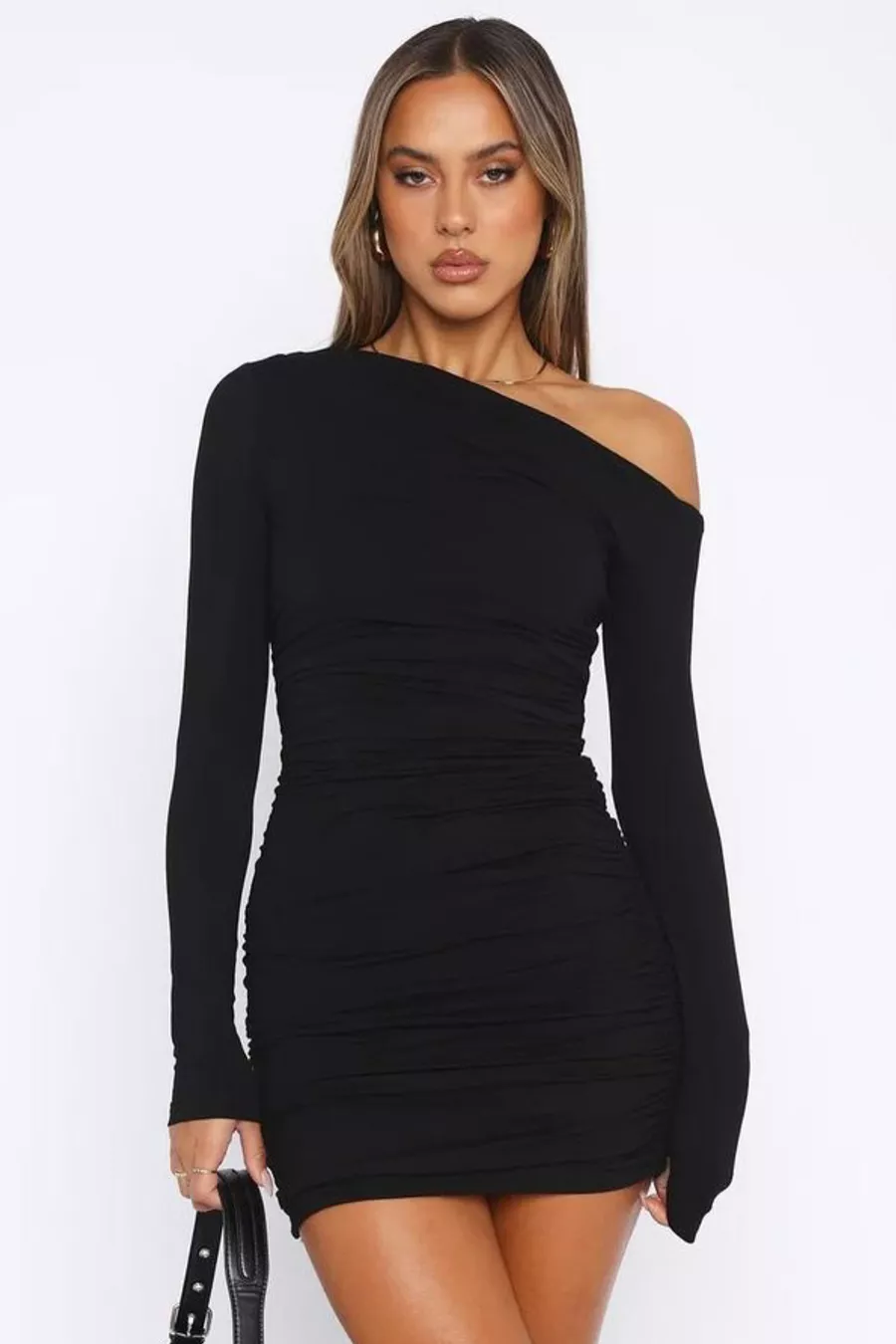 Robe noire à manches longues avec épaules dénudées et fronces