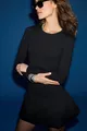 Robe noire courte femme Pani Florine, coupe slim, jupe ballon en popeline tissée, haut en viscose extensible
