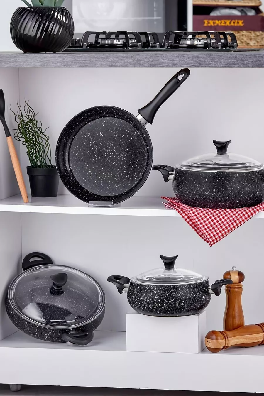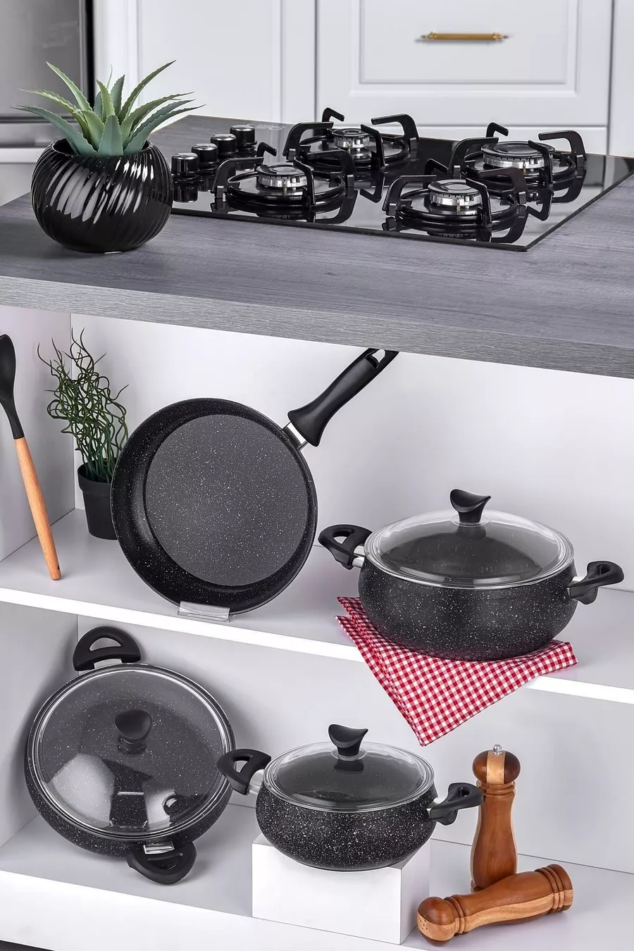 Couleur : Noir Volume : 2,3 L Caractéristique : Fond antiadhésif Matériau extérieur : Granit Matériau intérieur : Granit Nombre de pièces : 7 Origine : KZ Matériau : Aluminium