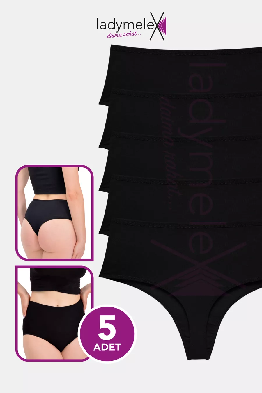 String femme, string en coton, lot de 5 (S-M-L-XL) string taille haute, noir