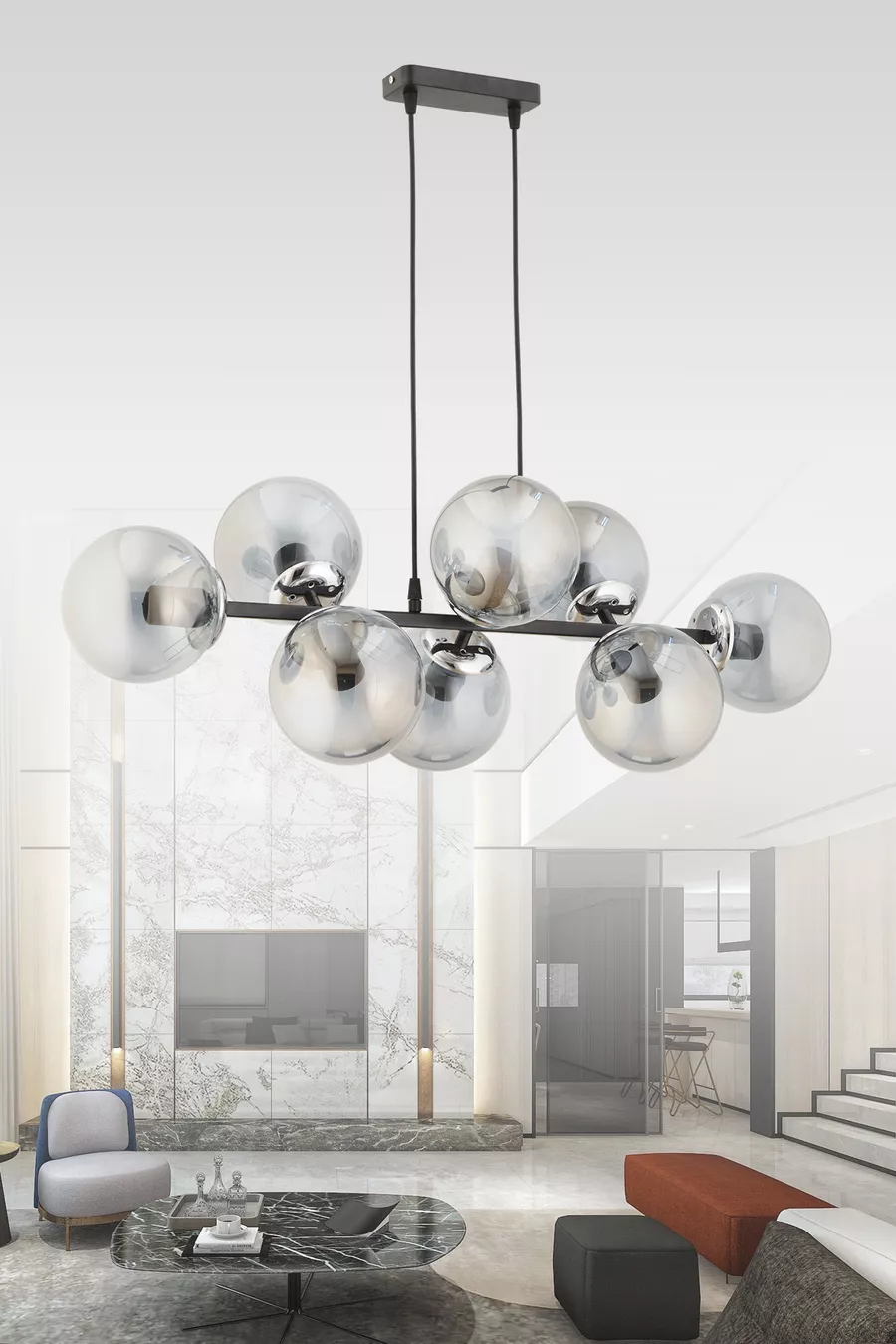 Matériel : Métal Modèle : Moderne Type d'ampoule : E27 Nombre de douilles : 8 Couleur : Noir Dimensions : 85 x 55 Hauteur : 61 - 70 cm Zone d'utilisation : Salon / Salle de séjour Origine : TR Caractéristique : Long