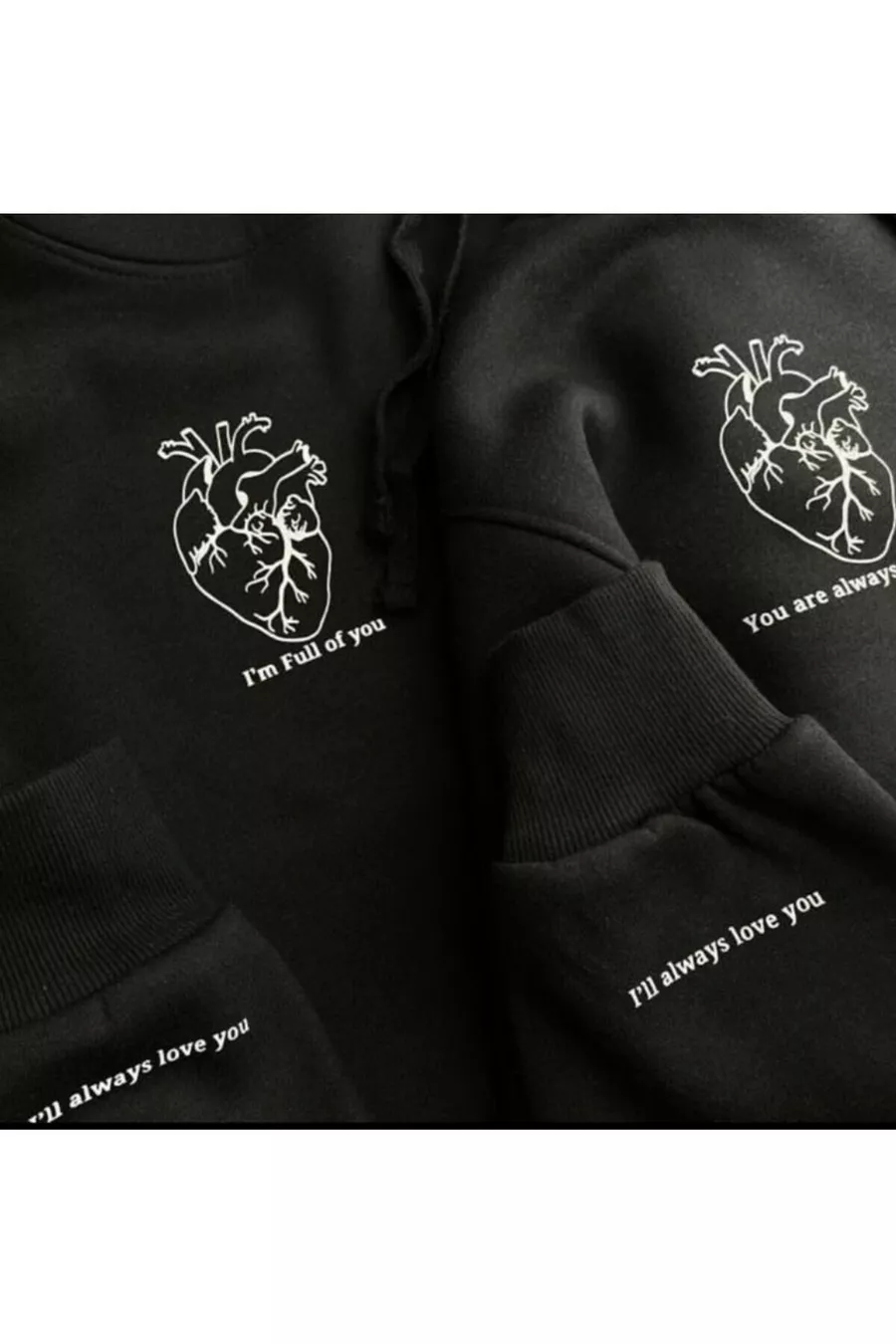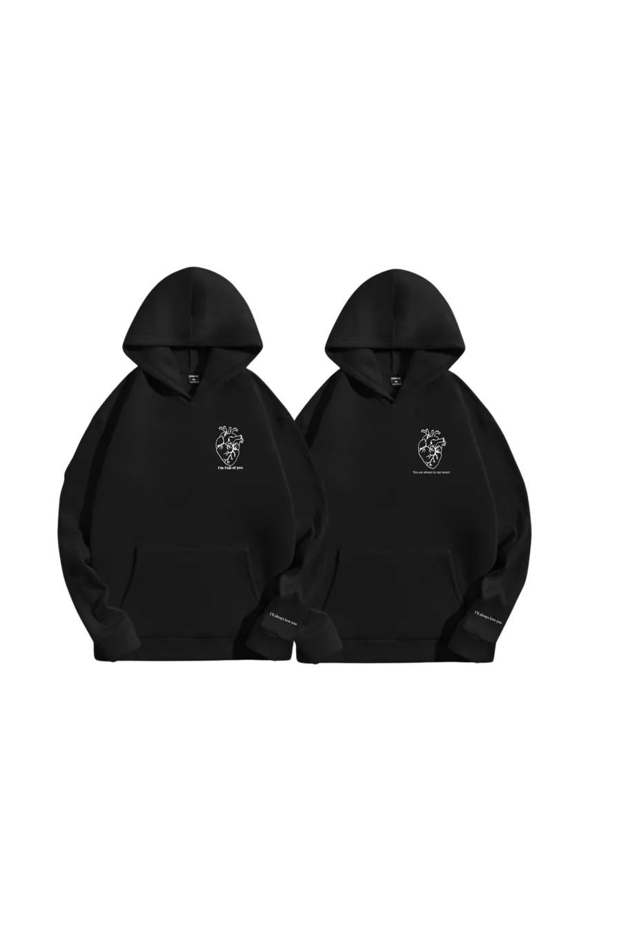 Sweat à capuche unisexe noir pour couples, ensemble de deux, avec imprimé cœur sur la manche