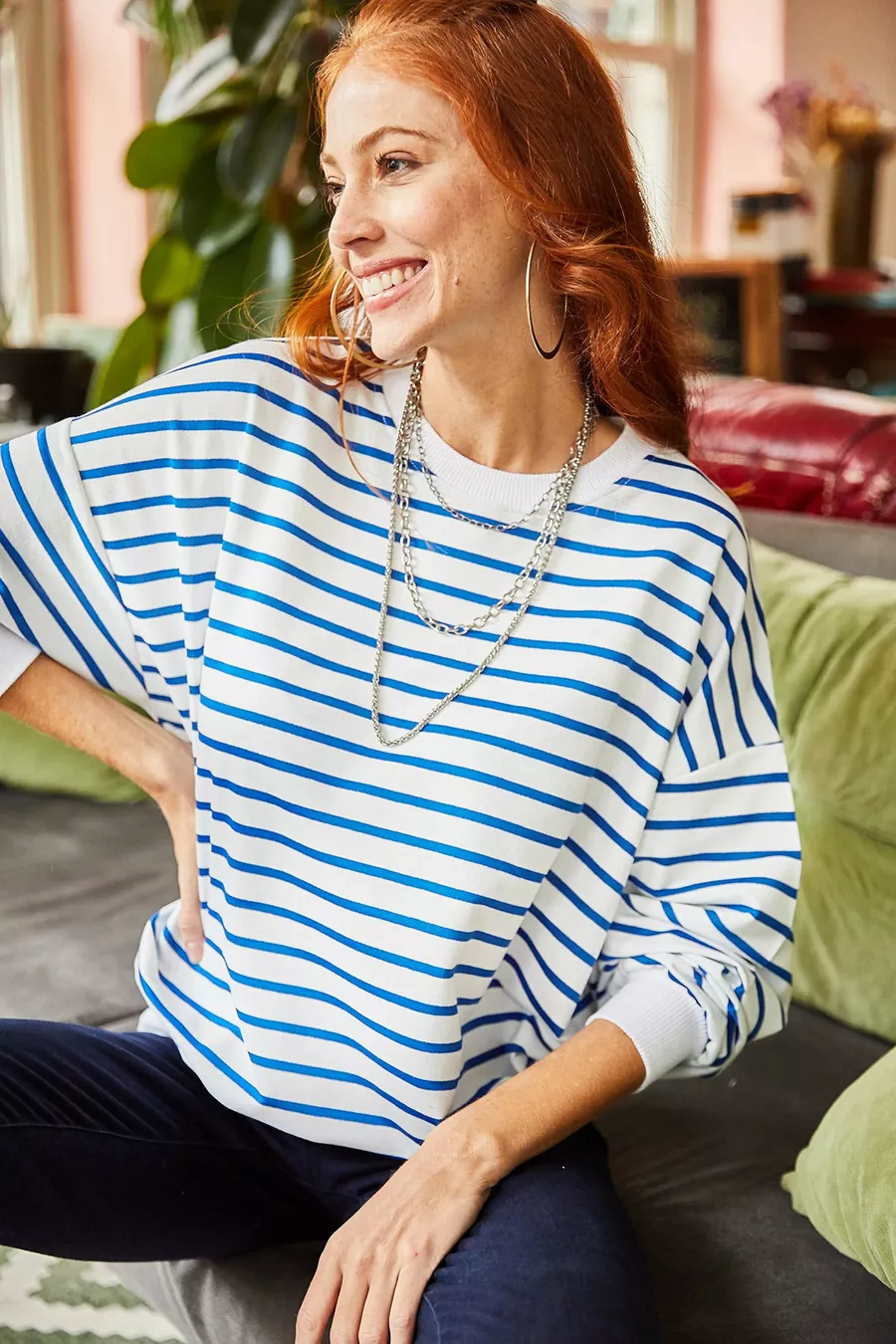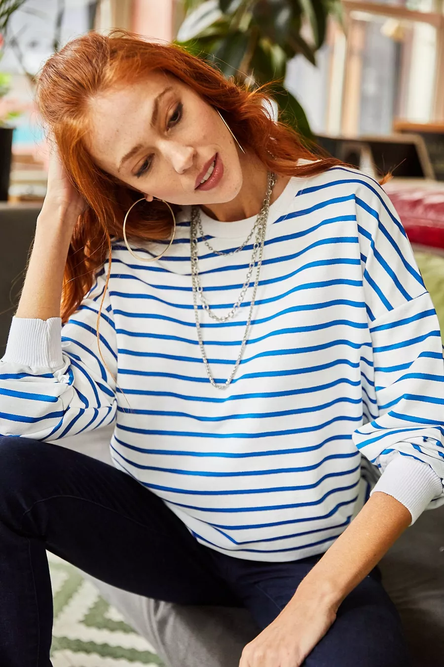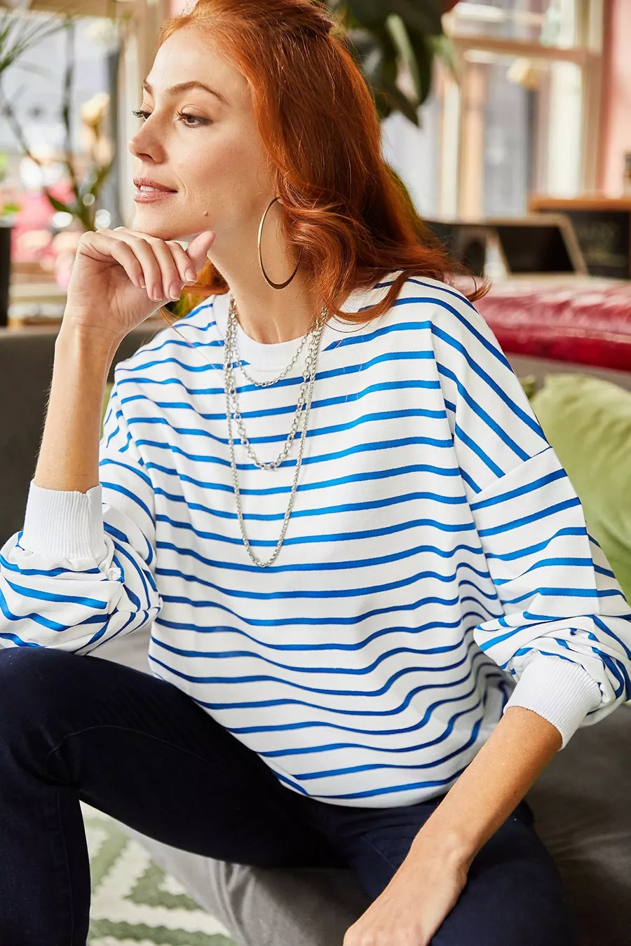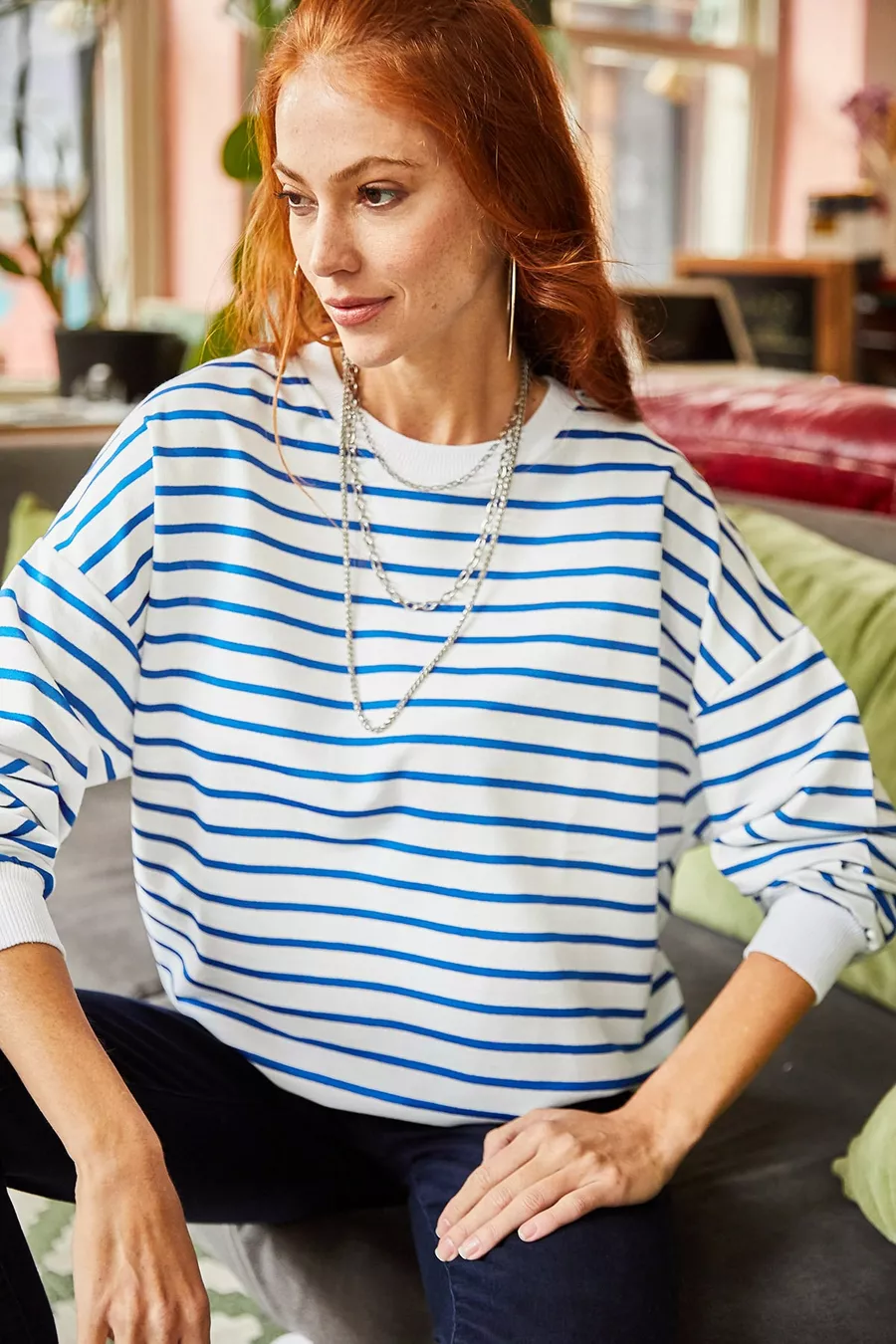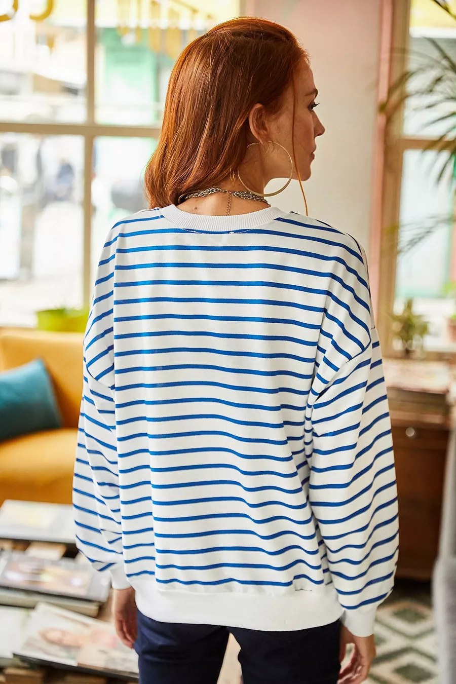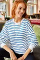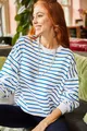 Sweat-shirt ample basique femme blanc à rayures indigo, texture douce