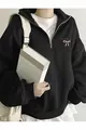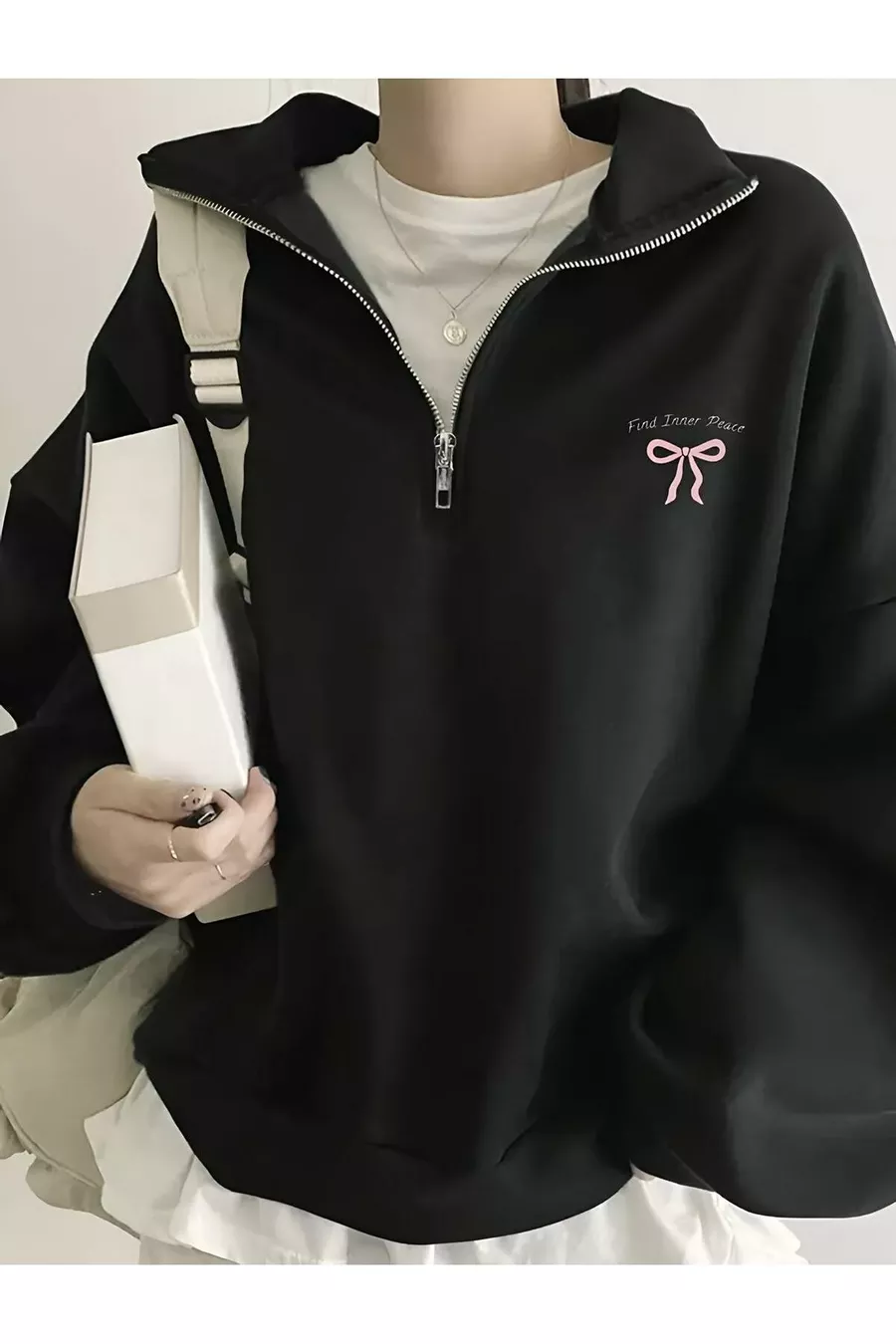 Sweatshirt noir à col montant avec demi-fermeture éclair et imprimé nœud