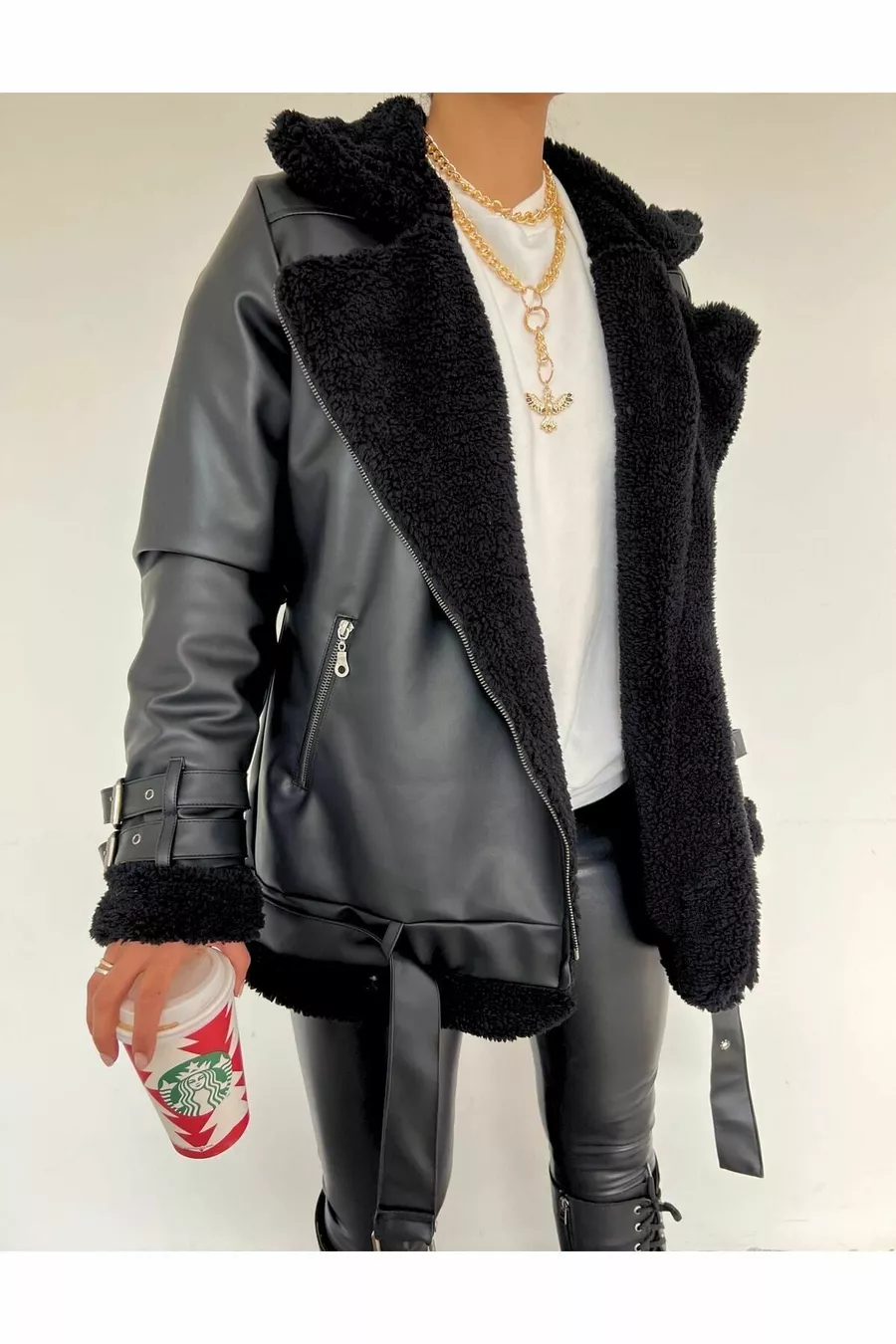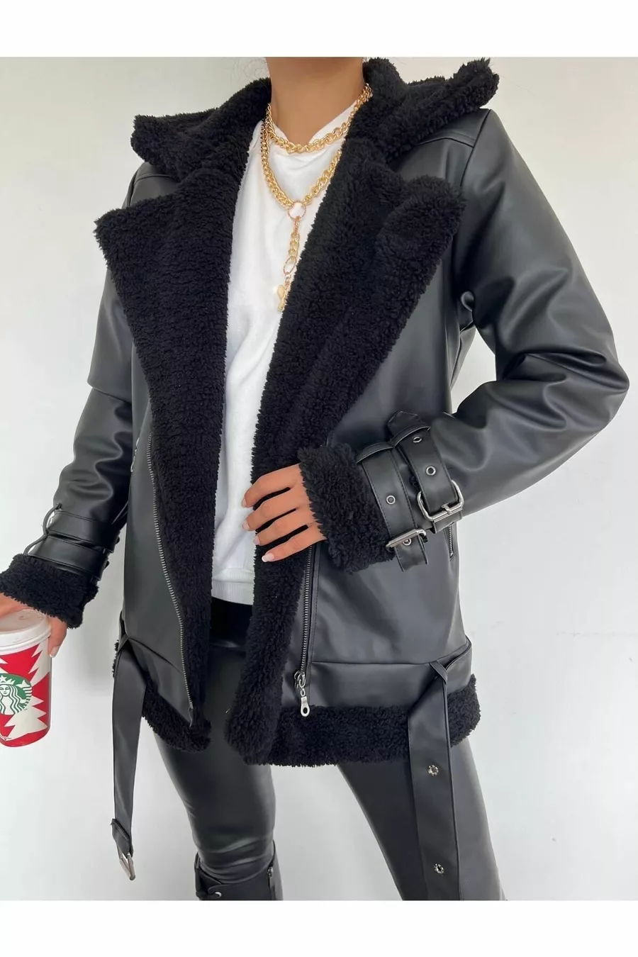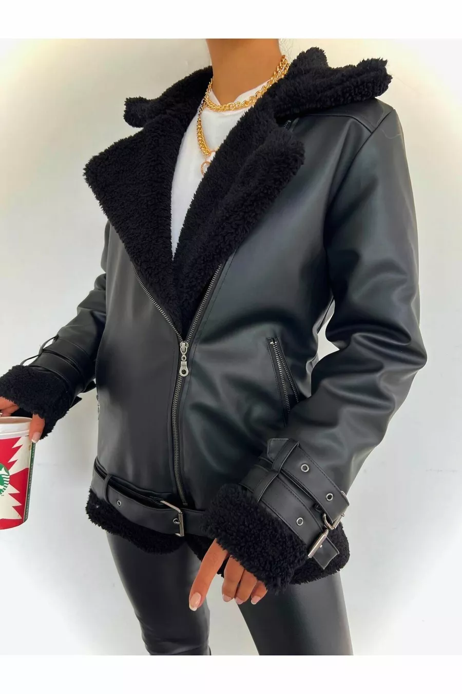 Veste biker longue en cuir synthétique noir pour femme, doublée en fausse fourrure noire, oversize