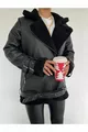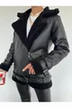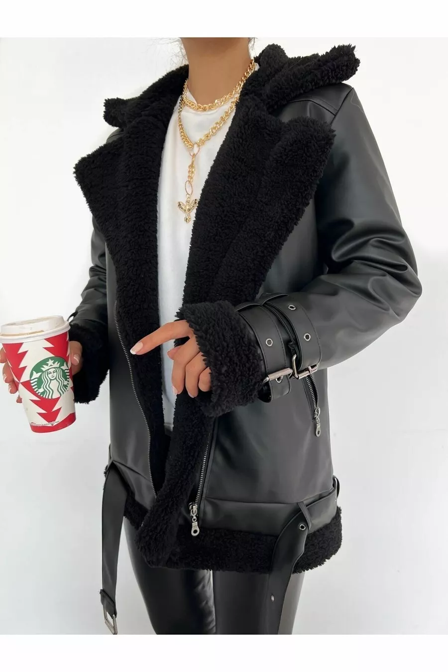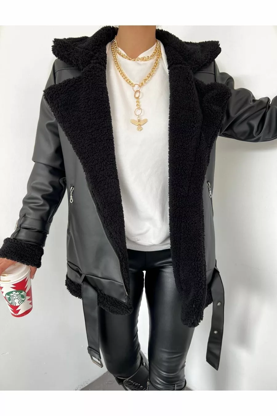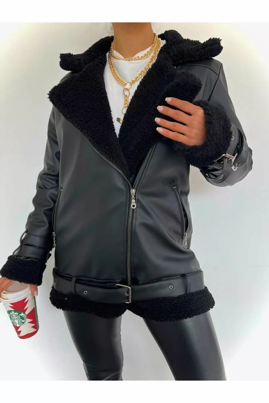 Veste biker longue en cuir synthétique noir pour femme, doublée en fausse fourrure noire, oversize